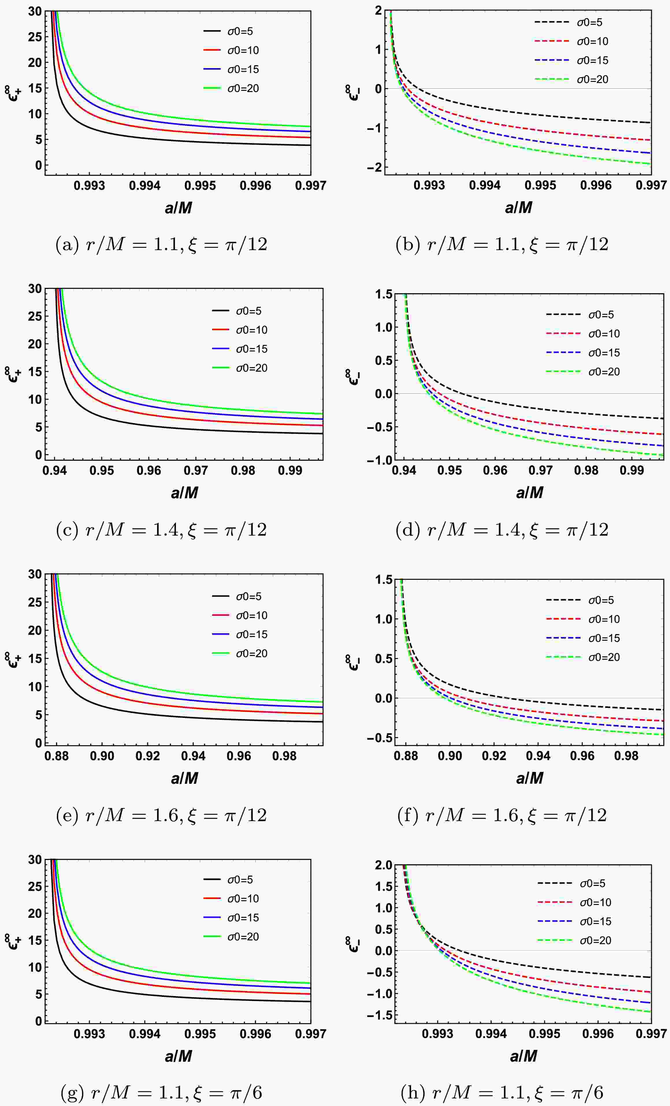 $ \hat{\gamma}_{\rm{K}}=1/ \sqrt{1-\hat{v}^2_{\rm{K}}} $ , the plasma energy-at-infinity density per enthalpy is [18]$ \begin{aligned}[b] \epsilon^\infty_{\pm} =\;& e^\infty_{{\rm{hyd}}\pm}/\omega \\ =\; &\alpha \hat{\gamma}_{\rm{K}}((1+\beta^\phi\hat{v}_{\rm{K}})\sqrt{1+\sigma_0}\pm \cos\xi(\beta^\phi+\hat{v}_{\rm{K}})\sqrt{\sigma_0}\\ &-\dfrac{\sqrt{1+\sigma_0}\mp \cos\xi\hat{v}_{\rm{K}}\sqrt{\sigma_0}}{4\hat{\gamma}_{\rm{K}}^2(1+\sigma_0-\cos^2\xi\hat{v}_{\rm{K}}^2\sigma_0)}) , \end{aligned} $
