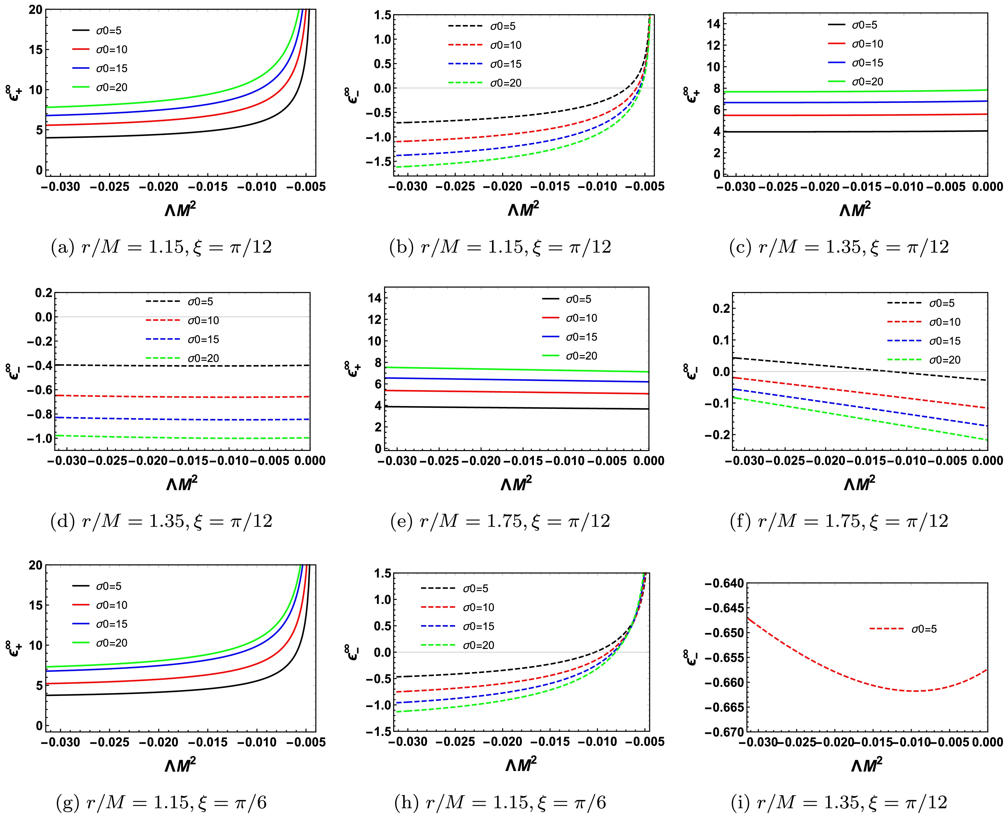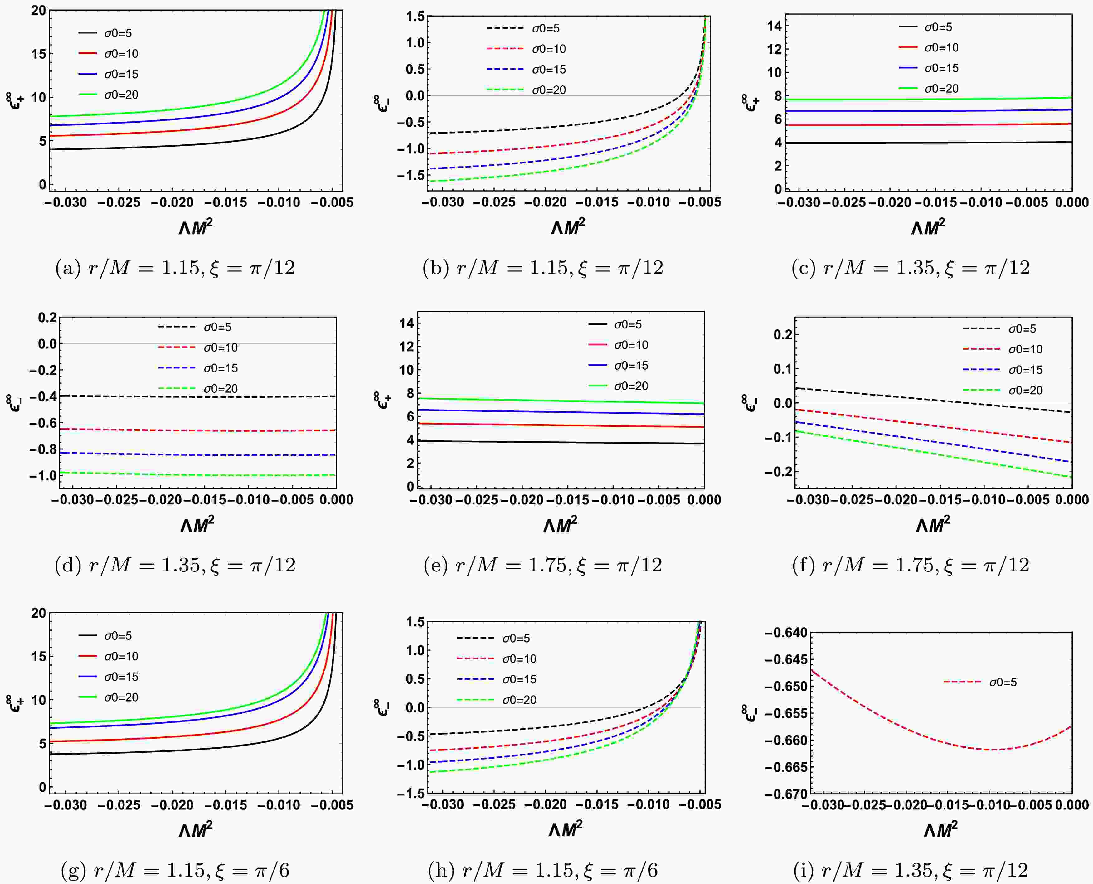$ \epsilon^\infty_+ $ (solid curves) and$ \epsilon^\infty_- $ (dashed curves) as functions of the cosmological constant$ \Lambda M^2 $ for different values of the plasma magnetization of plasma$ \sigma_0 $ , the orientation angle ξ, and the dominant reconnection radial location$ r/M $ , and with spin$ a/M=0.99 $ fixed. The plasma magnetization$ \sigma_0 $ = 5, 10, 15, and 20 from bottom to top for solid curves and from top to bottom for dashed curves. (a)$ r/M=1.15 $ ,$ \xi=\pi/12 $ . (b)$ r/M=1.15 $ ,$ \xi=\pi/12 $ . (c)$ r/M=1.35 $ ,$ \xi=\pi/12 $ . (d)$ r/M=1.35 $ ,$ \xi=\pi/12 $ . (e)$ r/M=1.75 $ ,$ \xi=\pi/12 $ . (f)$ r/M=1.75 $ ,$ \xi=\pi/12 $ . (g)$ r/M=1.15 $ ,$ \xi=\pi/6 $ . (h)$ r/M=1.15 $ ,$ \xi=\pi/6 $ . (i)$ r/M=1.35 $ ,$ \xi=\pi/12 $ . (i) shows the behavior of$ \epsilon^\infty_{-} $ when$ \sigma_0 $ is set to 5 in (d).In Fig. 3, we plot