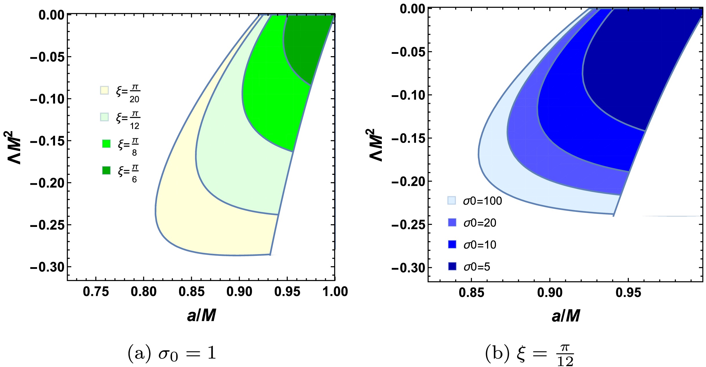 $ \Lambda M^2-r/M $ and$ a/M-\Lambda M^2 $ , respectively. These regions exhibit the configurations that satisfy the energy extraction condition$ \epsilon^\infty_{-}<0 $ , offering a visual representation of how the cosmological constant influences the permissible range of physical parameters for energy extraction.