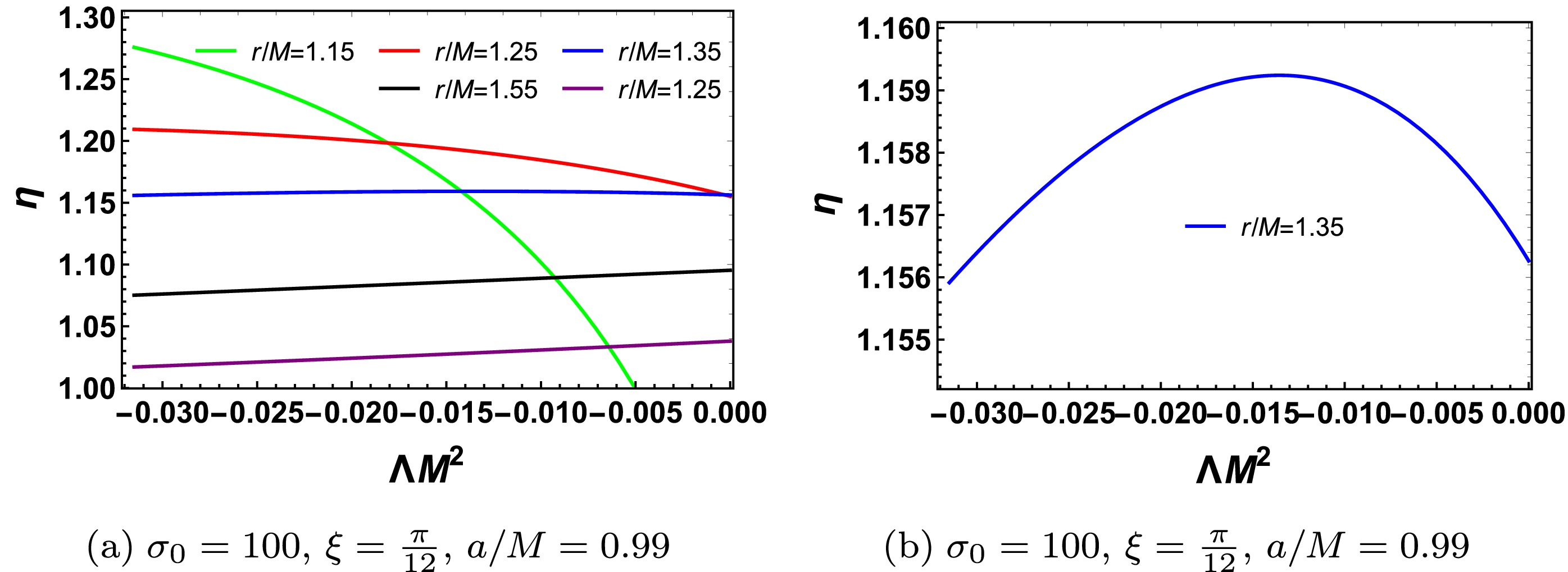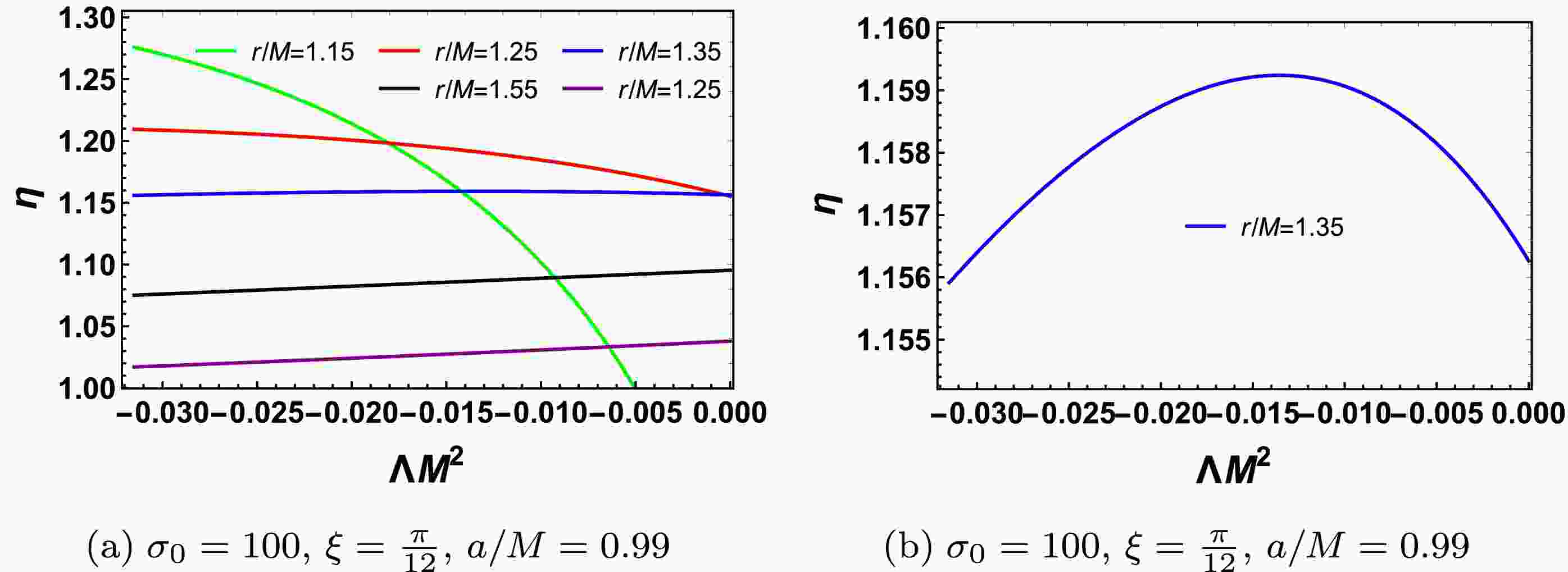 $ r/M $ by taking$ \sigma_0=100 $ ,$ \xi=\dfrac{\pi}{12} $ , and$ \Lambda M^2=-0.01 $ with different values of spin$ a/M $ . Spin$ a/M $ = 0.99, 0.96, 0.94, 0.92, and 0.90 from top to bottom. (b) The behaviors of η as a function of the dominant reconnection radial location$ r/M $ by taking$ \sigma_0=100 $ ,$ \xi=\dfrac{\pi}{12} $ , and$ a/M=0.99 $ with different values of the cosmological constant$ \Lambda M^2 $ . Cosmological constant$ \Lambda M^2 $ = -0.03, -0.02, -0.015, -0.01, and 0 from top to bottom.Examining Fig. 7(b) with