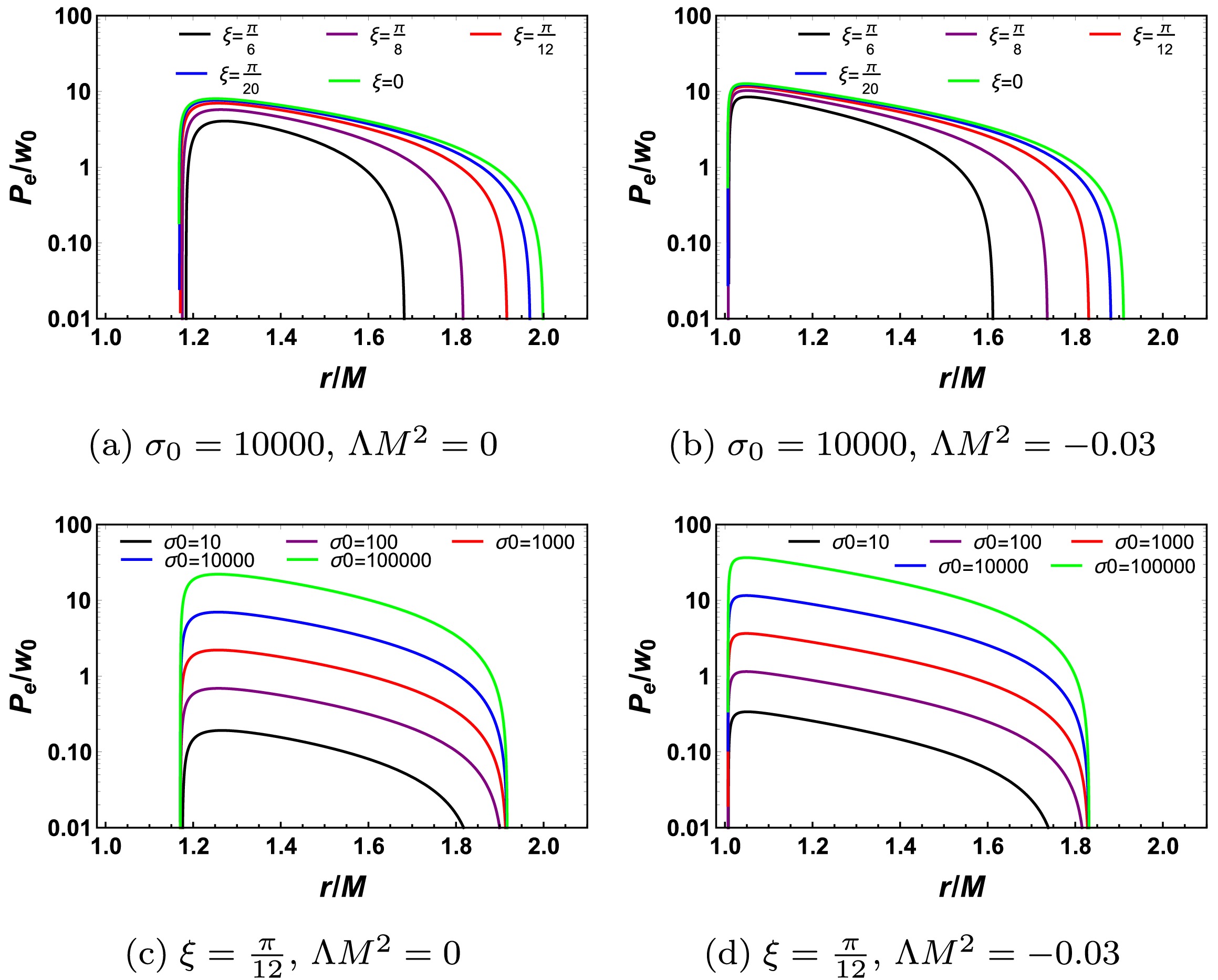 $ A_{{\rm{in}}} $ denotes the cross-sectional area of the inflowing plasma, which for rapidly spinning black holes is approximately$ A_{{\rm{in}}}\sim(r_{\rm{E}}^2-r_{{\rm{LR}}}^2) $ . The plasma inflow four-velocity is represented by$ U_{{\rm{in}}} $ , typically$ U_{{\rm{in}}}={\cal{O}}(10^{-1}) $ for the collisionless regime and$ U_{{\rm{in}}}={\cal{O}}(10^{-2}) $ for the collisional regime, as discussed in [76], with$ U_{{\rm{in}}} $ set at 0.1 for this analysis. Consequently, the power per unit enthalpy can be furhter expressed as$ \begin{aligned}[b] P_{{\rm{extr}}}/\omega_0=-0.1\epsilon^\infty_-(r_{\rm{E}}^2-r_{{\rm{LR}}}^2). \end{aligned} $