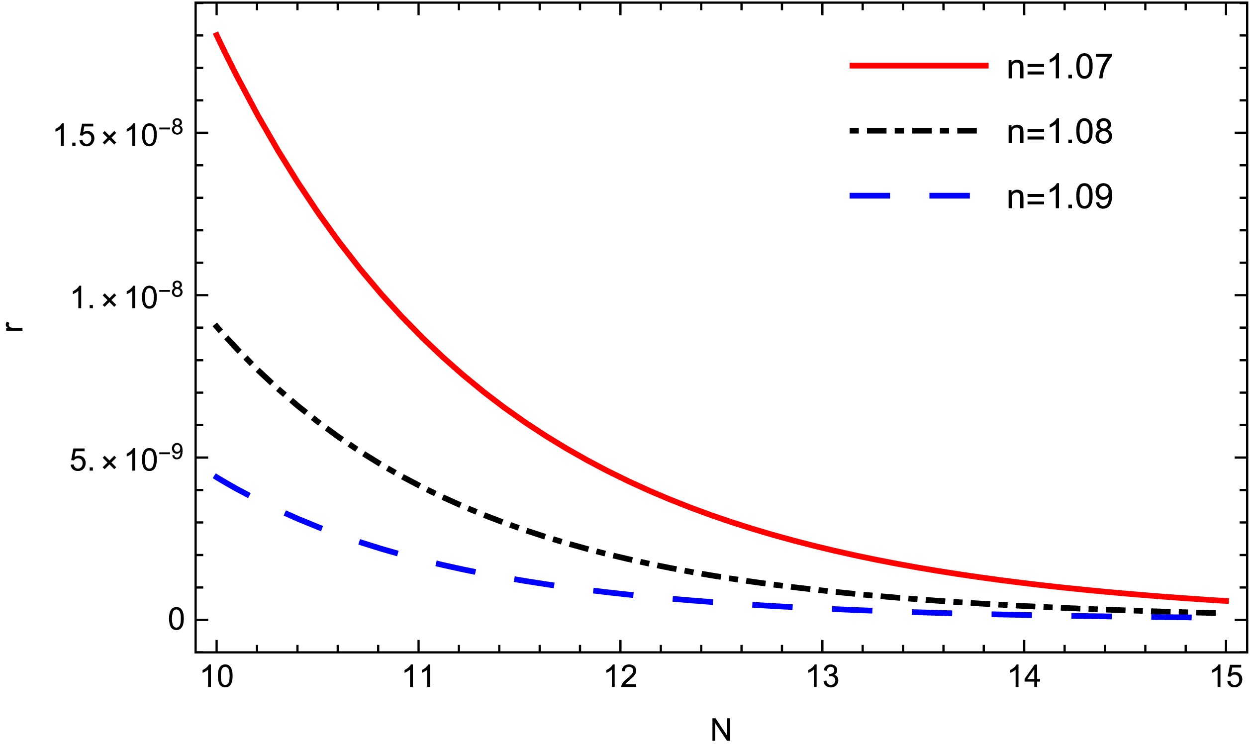 Figure 1.  (color online) Tensor-to-scalar ratio r with respect to the e-folding number N for different values of the model parameter n for model-1. Other parameters are given by $ m=4.5, c1=1, c_{r}=0.25 $.