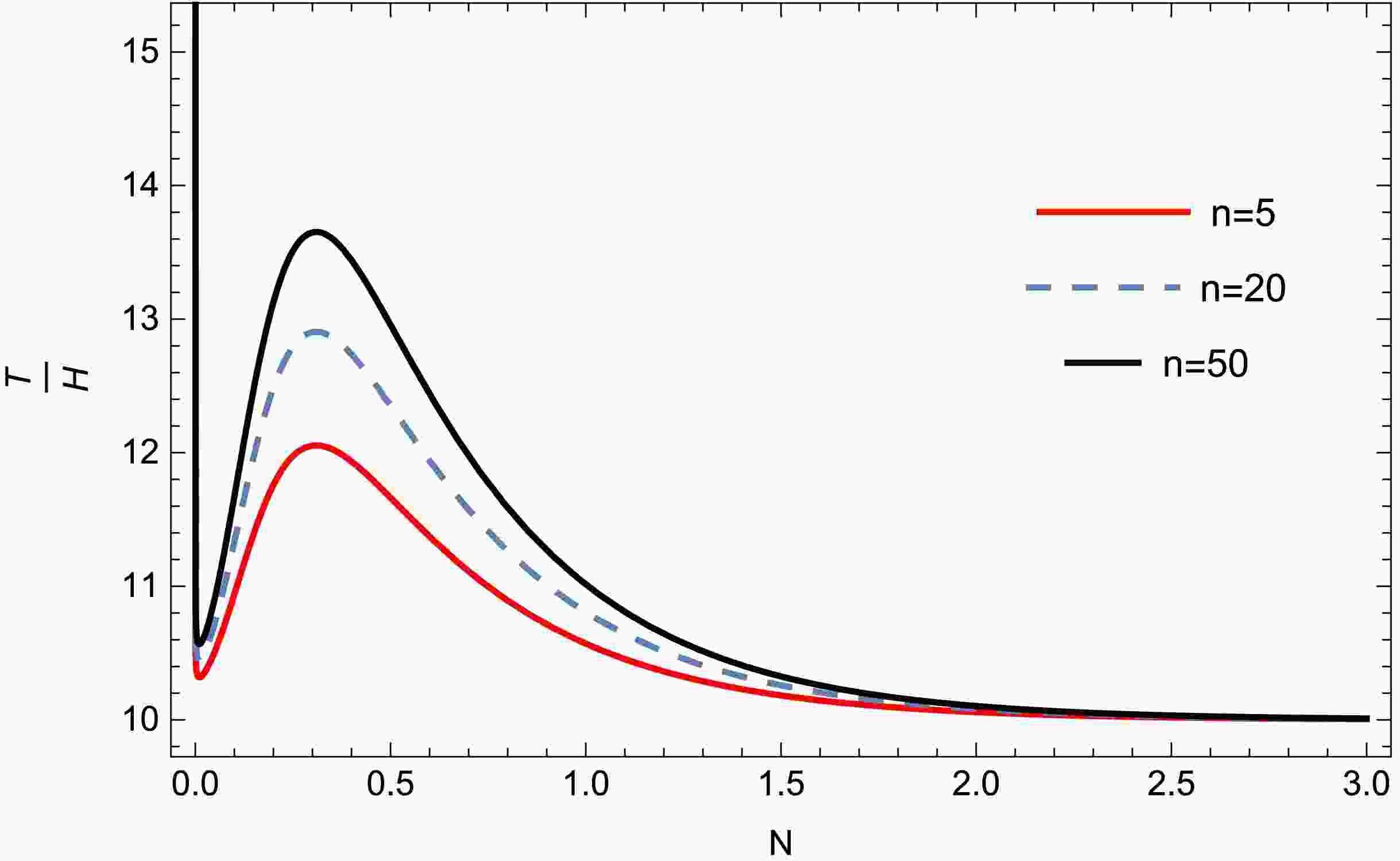 Figure 10.  (color online) Plot of $ T/H $ against N for different values of the constant n for model-2. Other parameters are $ c_1 = 0.17, n = 50, c_{r} = 7 $.