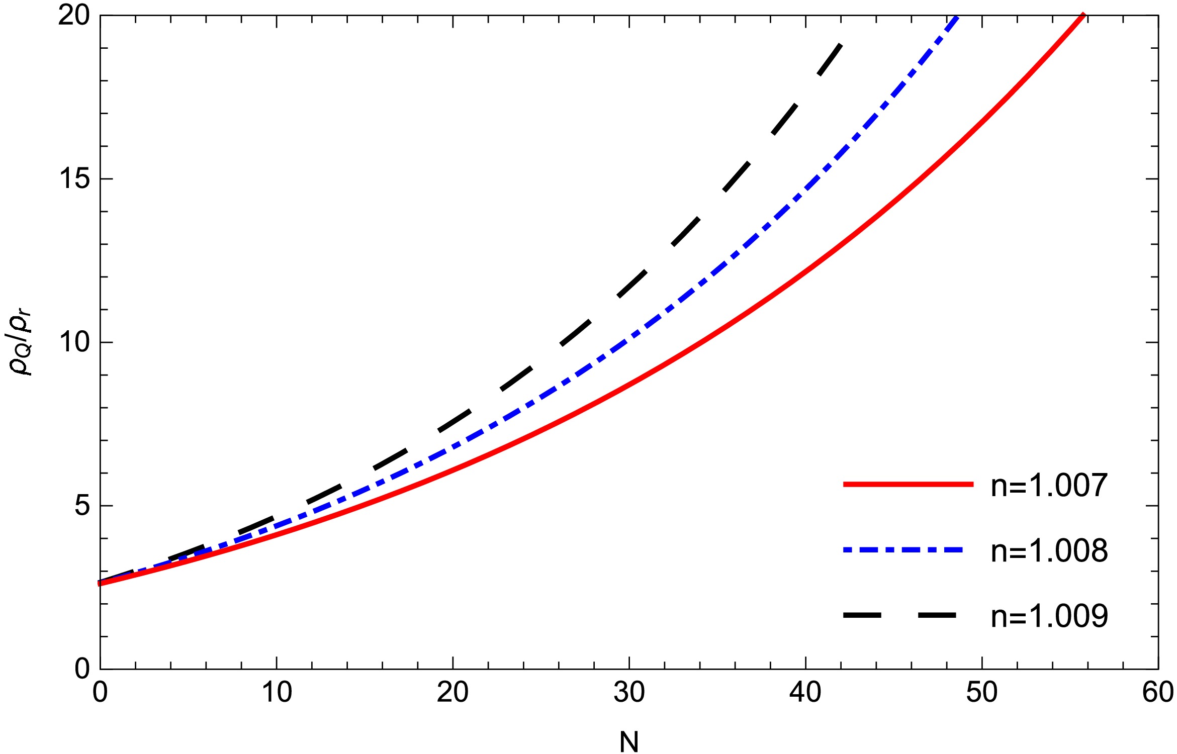 Figure 11.  (color online) Ratio of densities $ \rho_{Q}/\rho_{r} $ against N for different values of n for model-1. Other parameters are $ c1 = 1, m = 4.5 $.