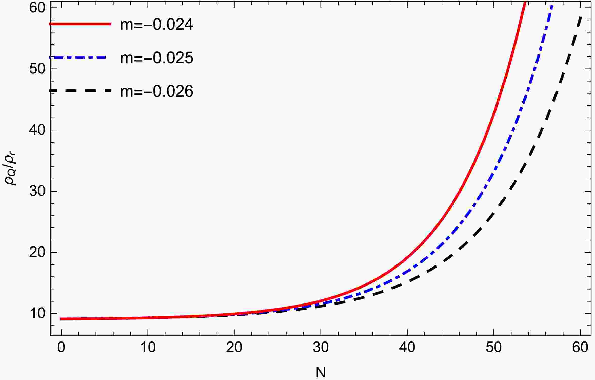 Figure 12.  (color online) Plot of density ratio $ \rho_{Q}/\rho_{r} $ against N for different values of m for model-2. Other parameters are $ c_1 = 200, m = -0.030 $.