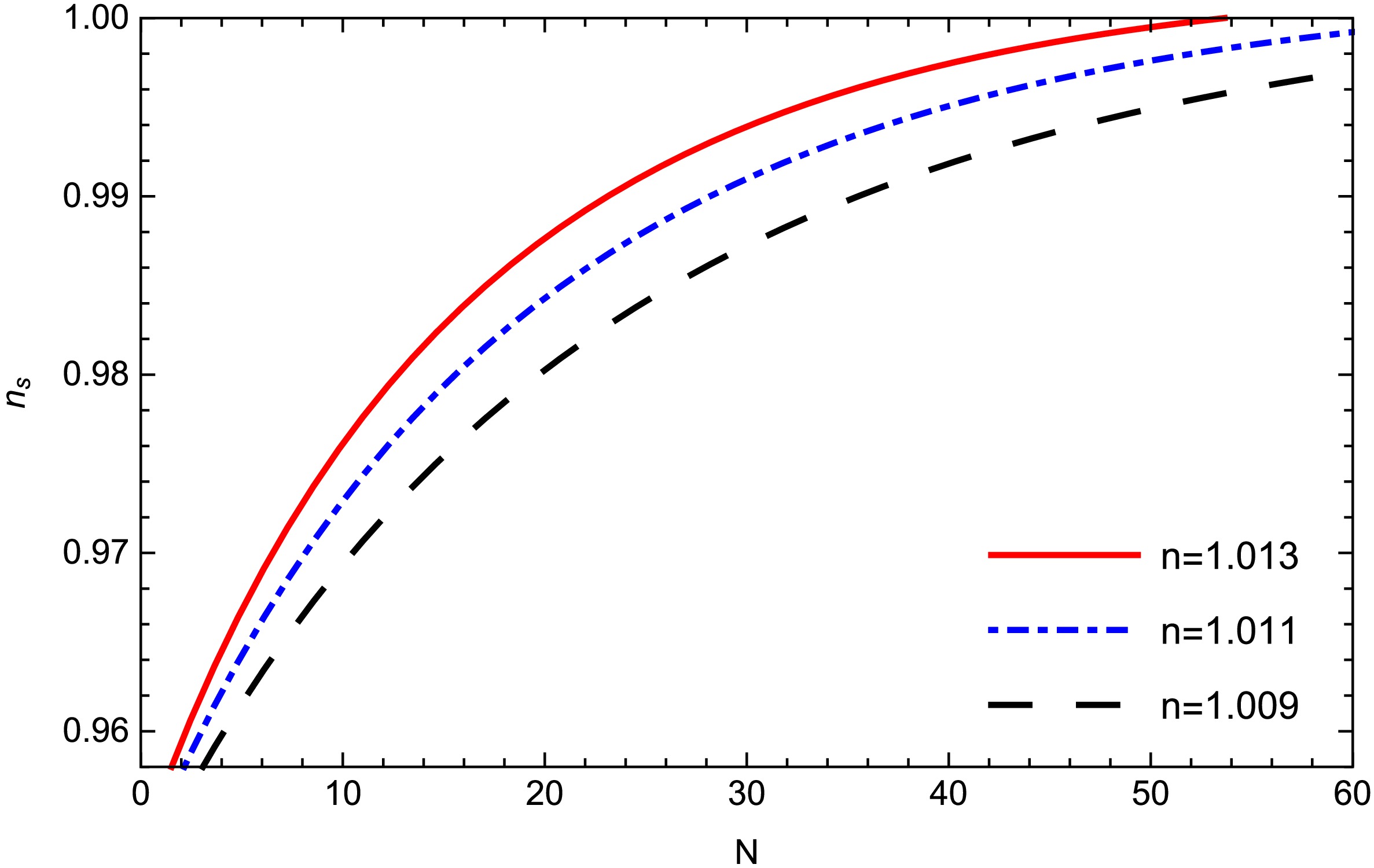 Figure 2.  (color online) Plot of the scaler spectral index $ n_{s} $ against N for different values of model parameter n for model-1. Other parameters are given by $ c1 = 1,m = 4.5, \gamma = 1 $.