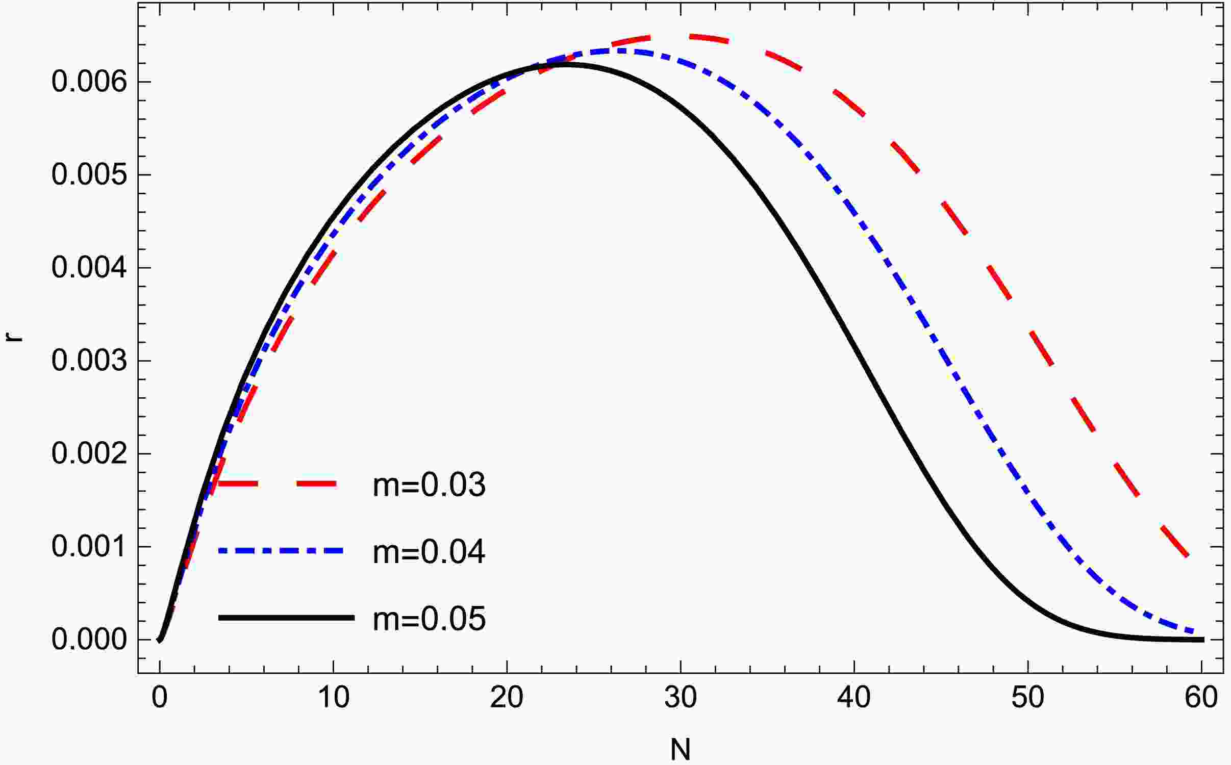 Figure 3.  (color online) Tensor-to-scalar ratio r against N for different values of parameter m for model-2. Other parameters are considered as $ c_{1}=-0.87 $, $ n=0.5 $, $ C_{T}=0.67 $.