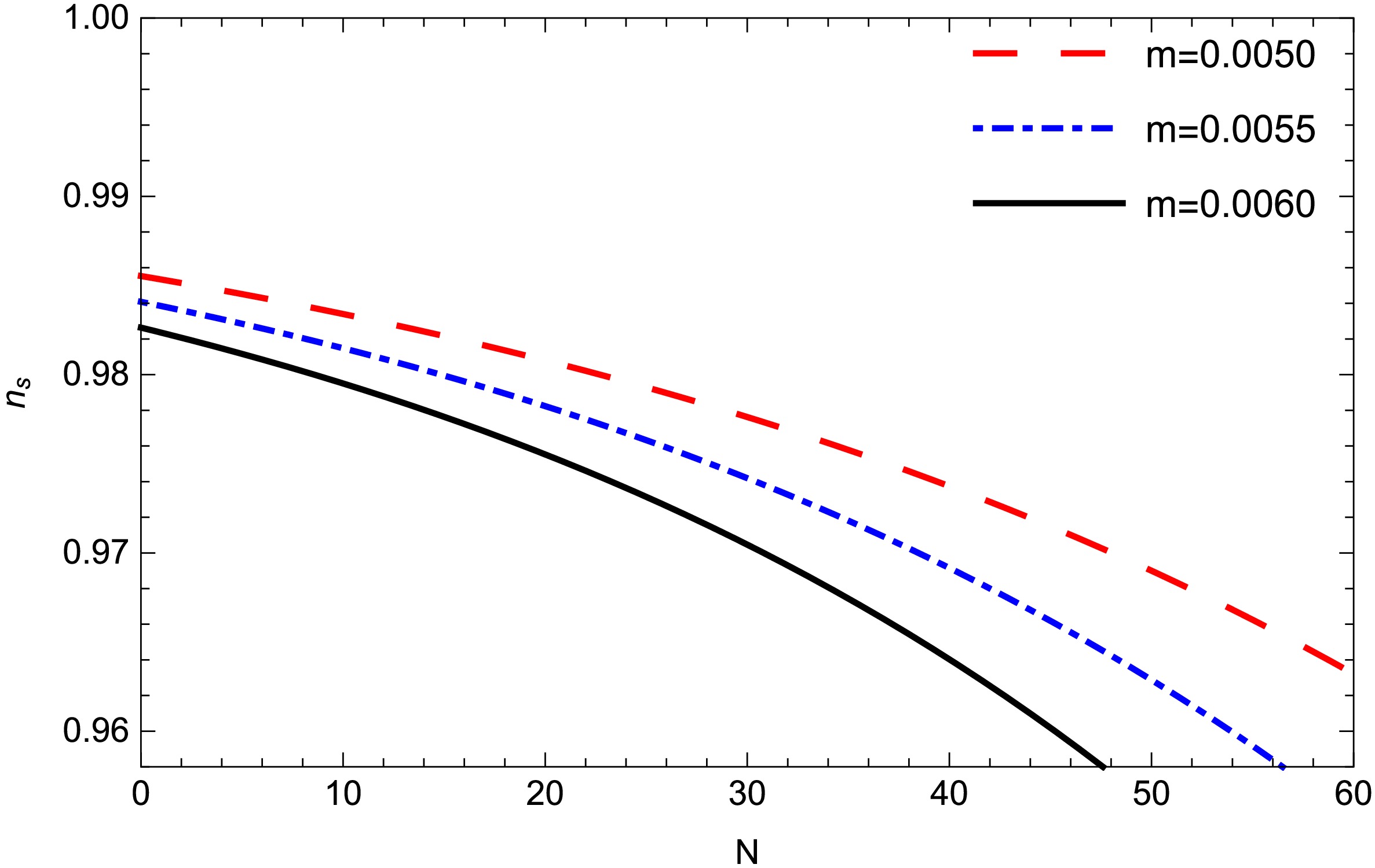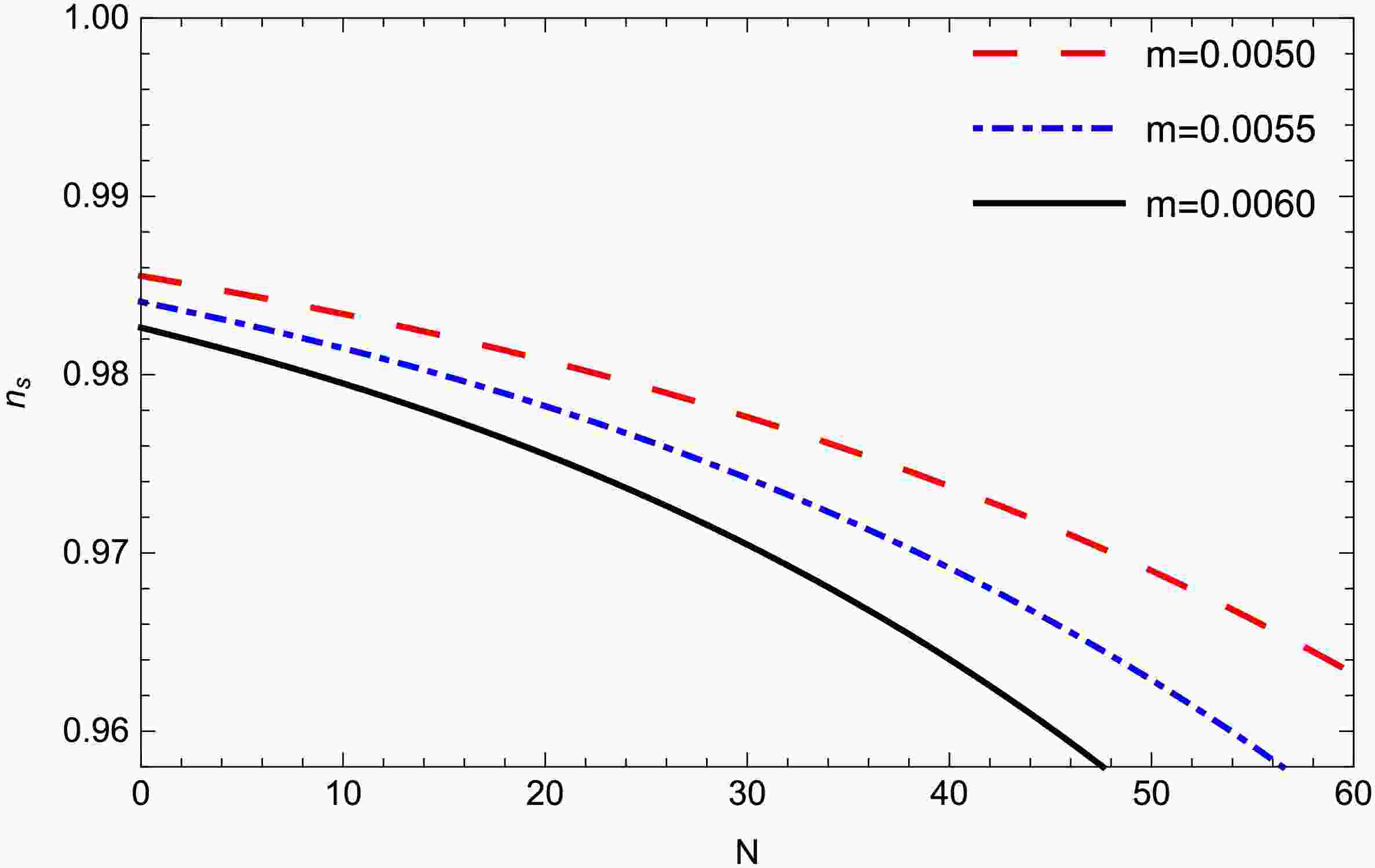 Figure 4.  (color online) Scalar spectral index $ n_{s} $ for model-2 against N for different values of m. Other parameters are $ c1 = 0.37, m = 0.006, \gamma = -0.27 $.