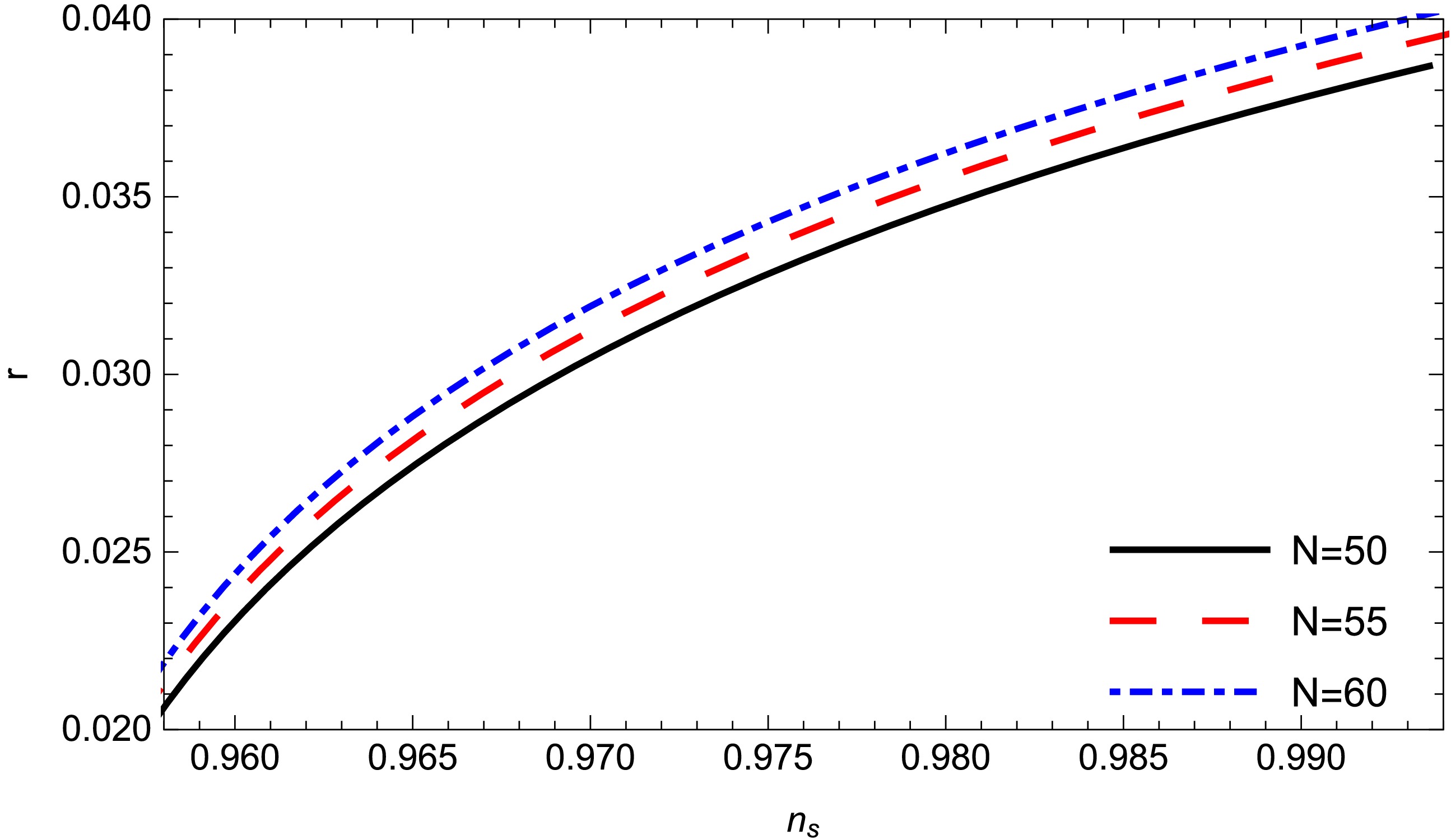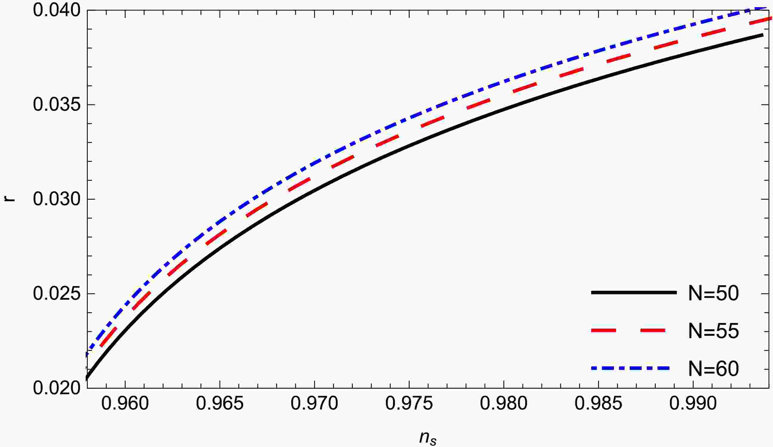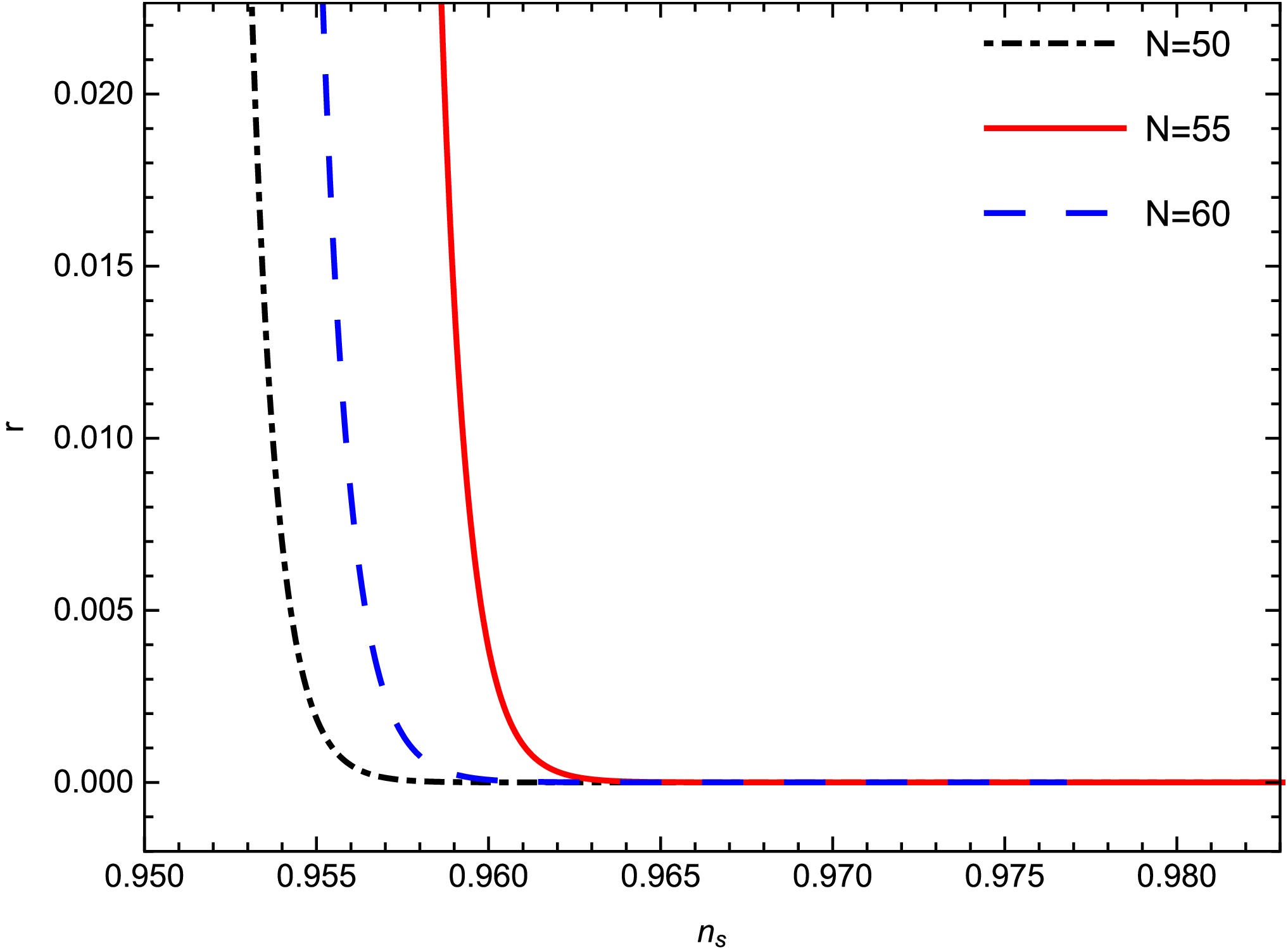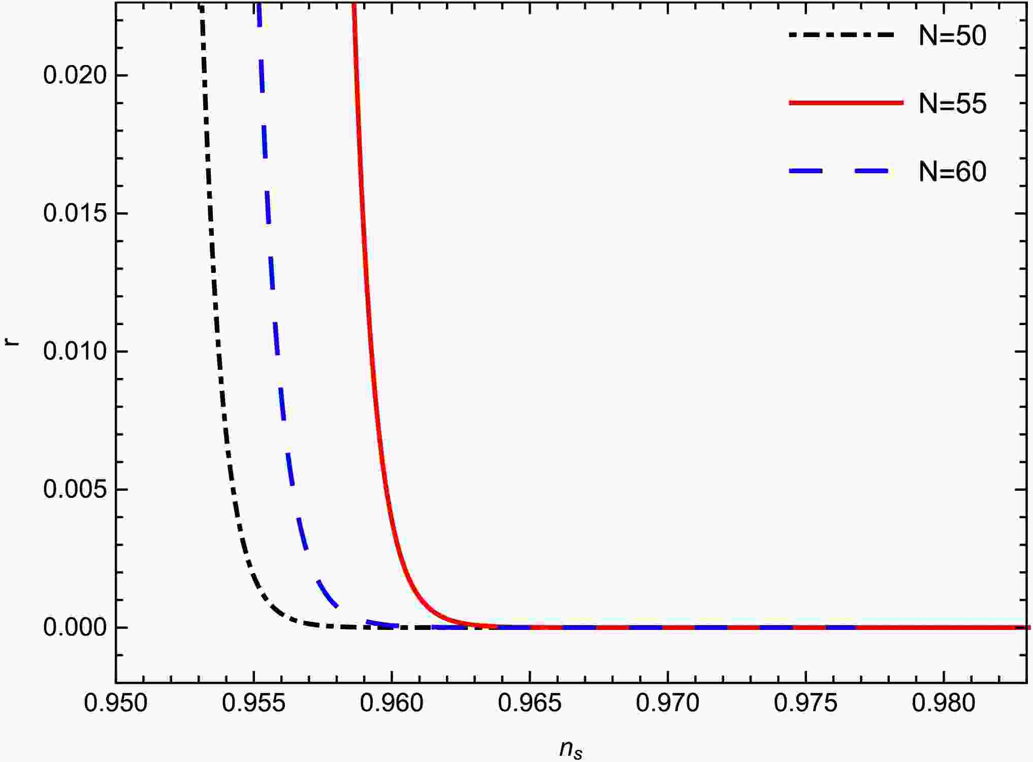 Figure 5.  (color online) Tensor-to-scalar ratio r with respect to the scalar spectral index $ n_{s} $ for different values of N for model-1. The other parameters are $ m = 0.75; $$ c1 = 1; \gamma = 0.99 $;