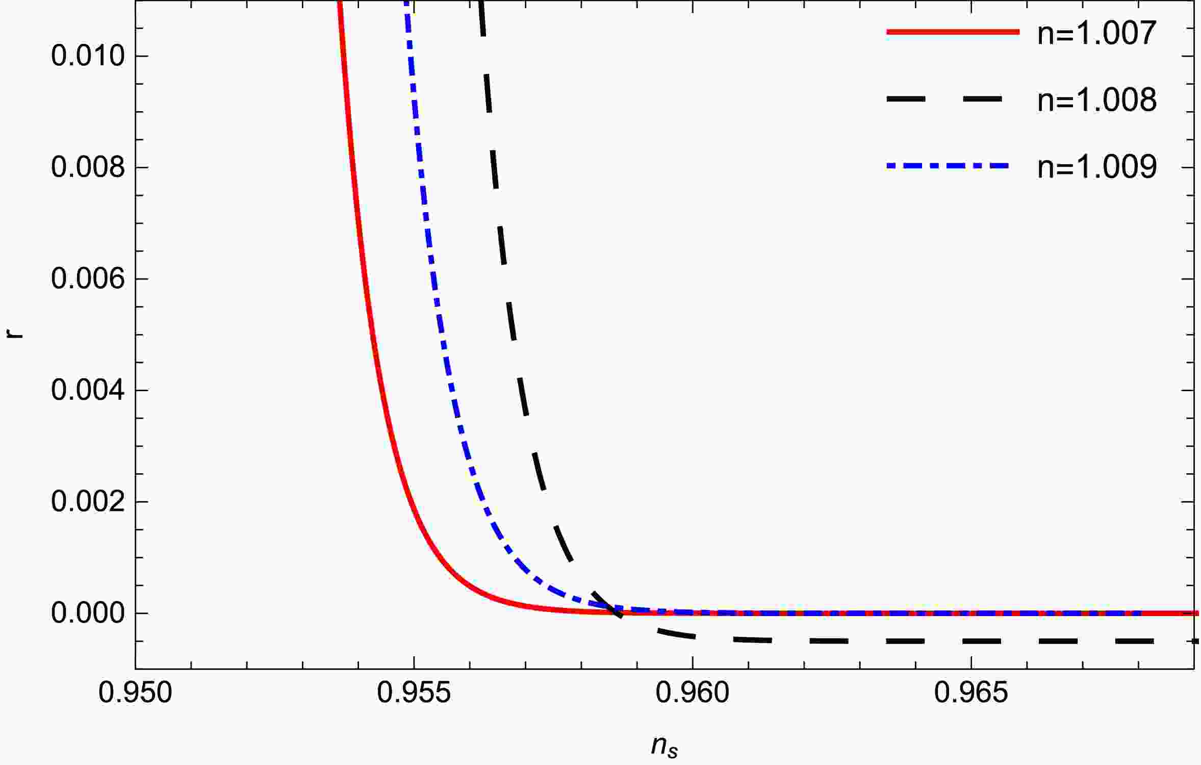 Figure 6.  (color online) r vs $ n_{s} $ for different values of the constant n for model-1. Other parameters are $ m = 0.75, c1 = 1, $$ \gamma = 0.99 $.