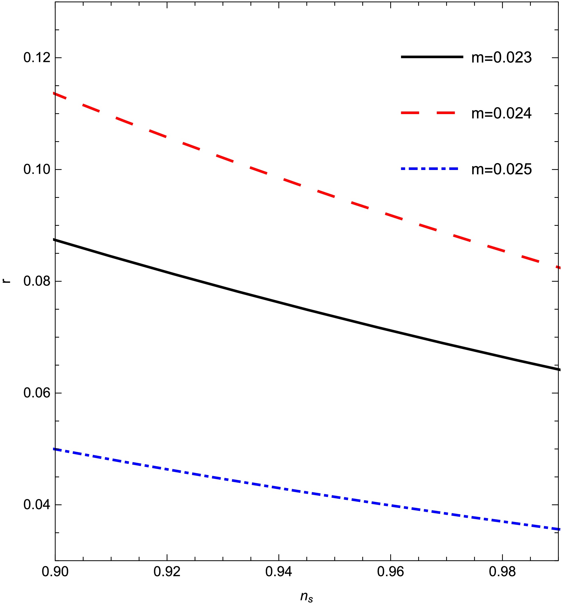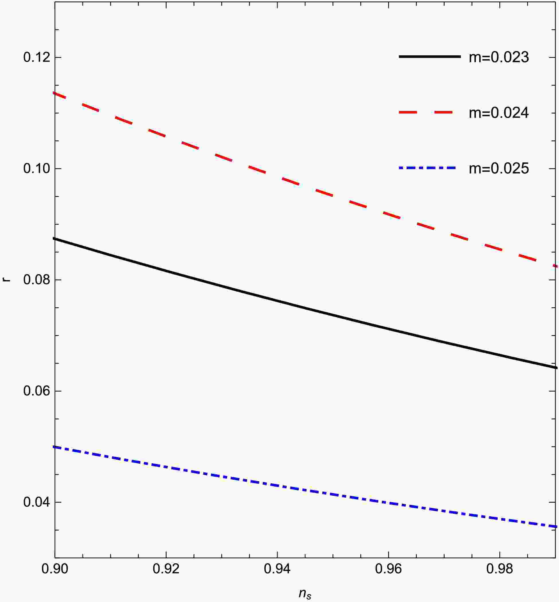 Figure 8.  (color online) The tensor-to-scalar ratio r against the scalar spectral index $ n_{s} $ for different values of m for model-2. Other parameters are $ c_1 = -0.87, n = 0.5, $$ \gamma = 0.99 $.
