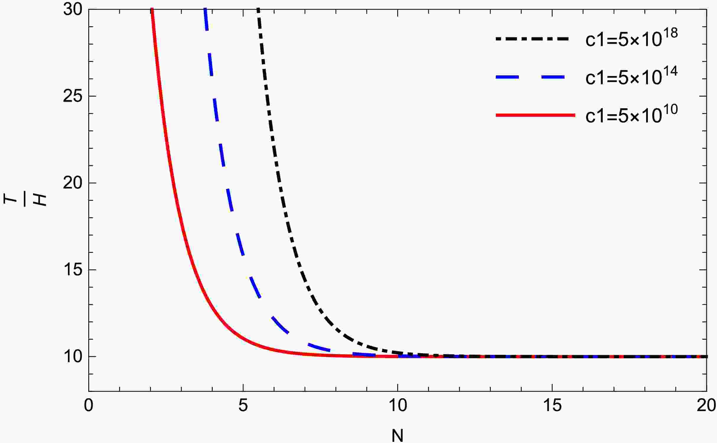 Figure 9.  (color online) Plot of $ T/H $ against N for different values of the $ c_{1} $ for model-1. Other parameters are $ m = 202, n = -500 $.