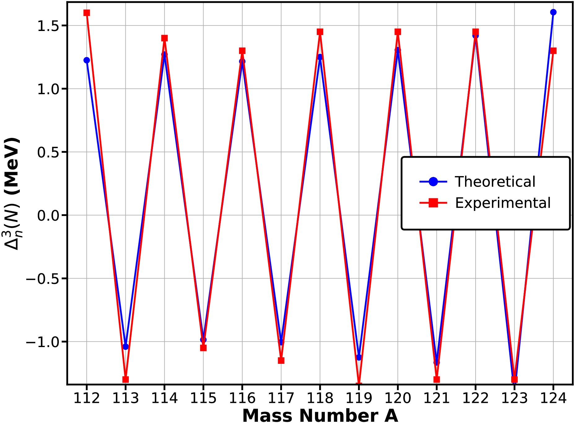 $ \Delta_n^{(3)}(N) $ for Sn isotopes ranging from 111Sn to 124Sn are presented and compared with experimental data in Figure 1. The RHB calculations reproduce the characteristic odd–even staggering pattern along the isotopic chain, with pairing gaps of the correct order of magnitude. The remaining deviations, typically within a few hundred keV, reflect the sensitivity of the three-point indicator to local shell effects and the single-particle level spacing near the Fermi surface.
