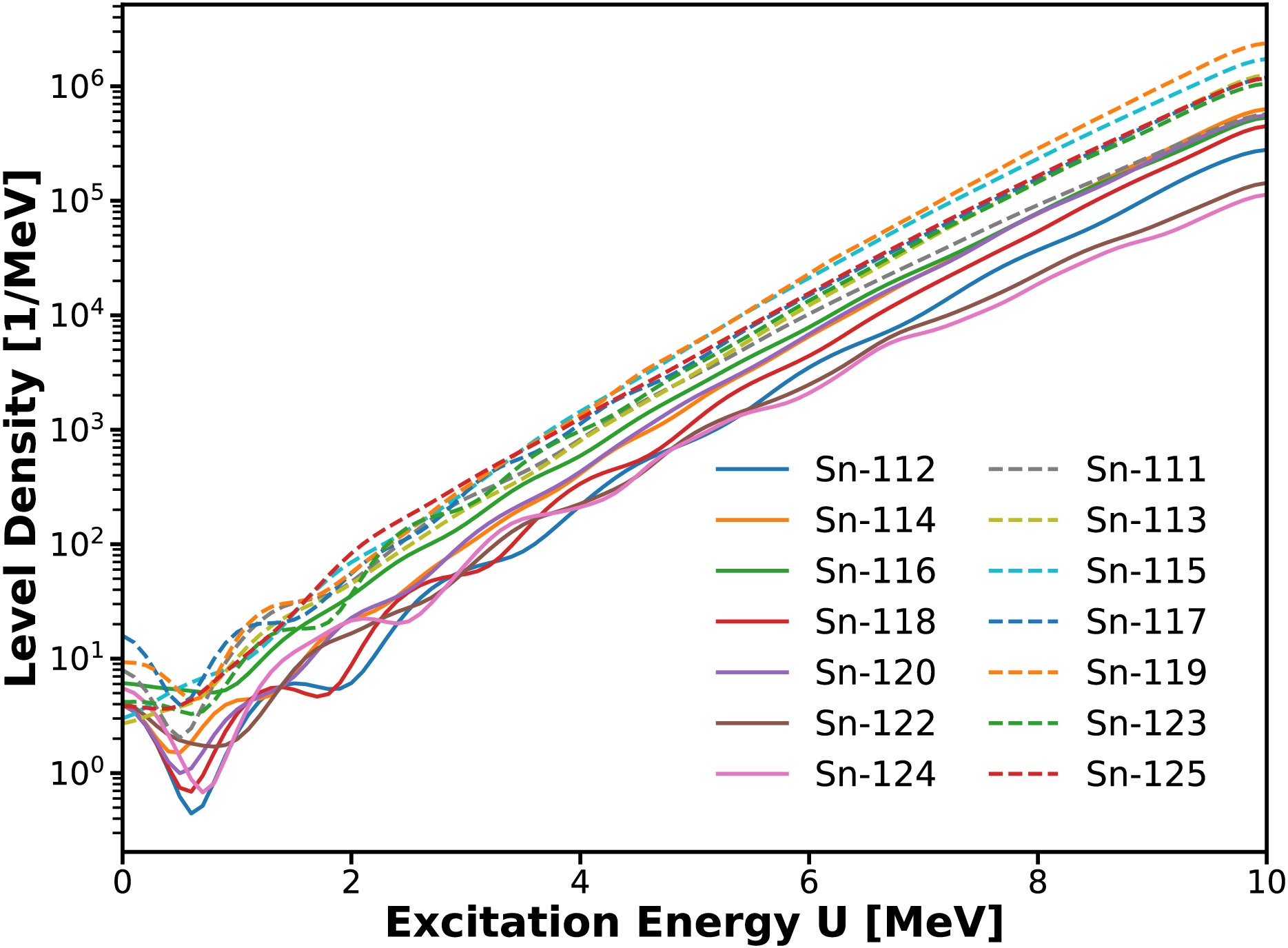 Figure 2. (color online) Calculated level densities as a function of excitation energy for the Sn isotopic chain from 111Sn to 124Sn using the RHB theory plus the combinatorial method. Odd-A nuclei are shown with dashed curves, while even–even nuclei are shown with solid curves.