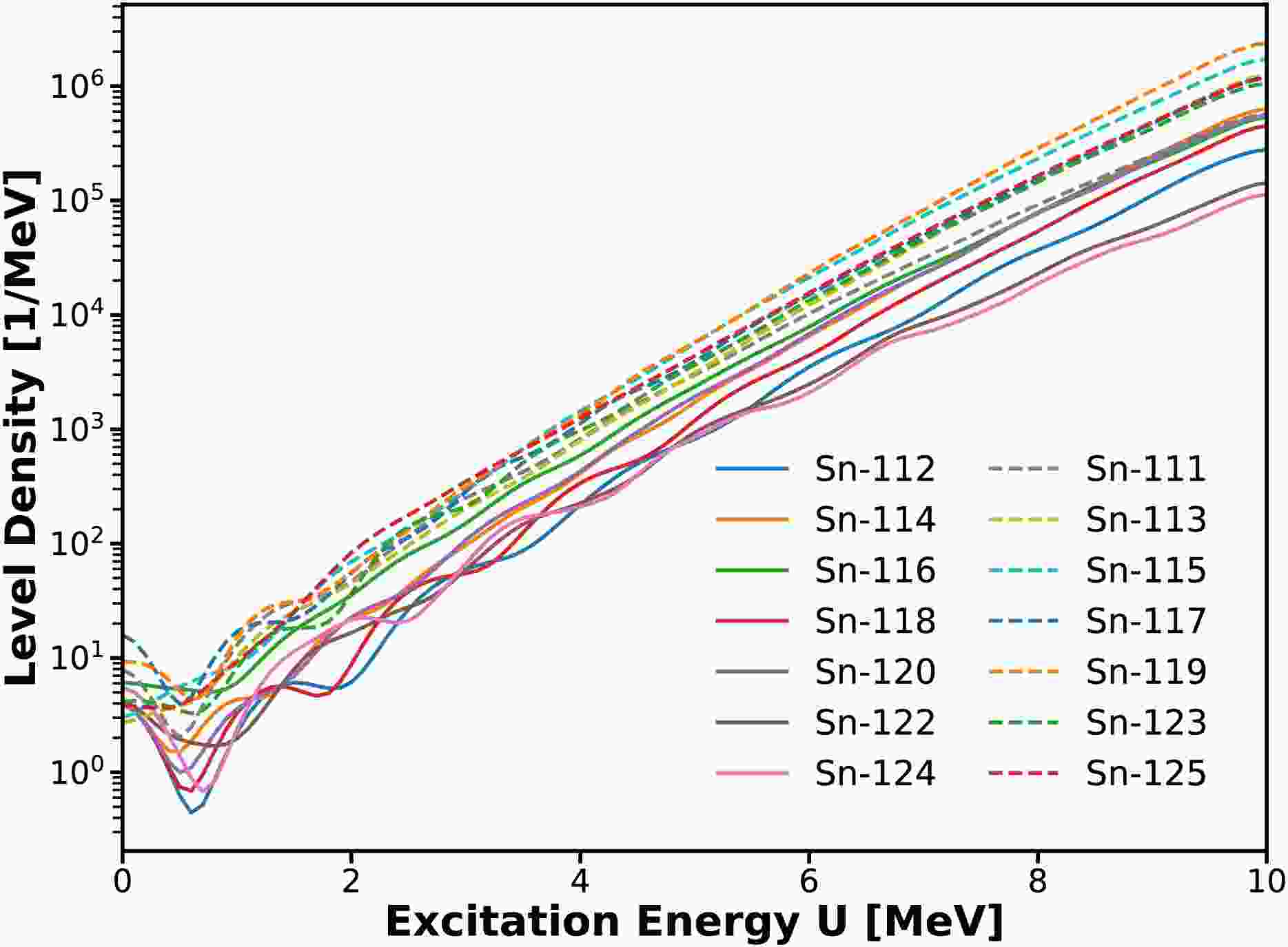 $ \rho(U) $ , as functions of excitation energy, U, have been calculated for Sn isotopes from 111Sn to 124Sn. To highlight the global energy dependence, a Gaussian smoothing with a width of$ \sigma = 2.0 $ MeV has been applied, as shown in Figure 2.