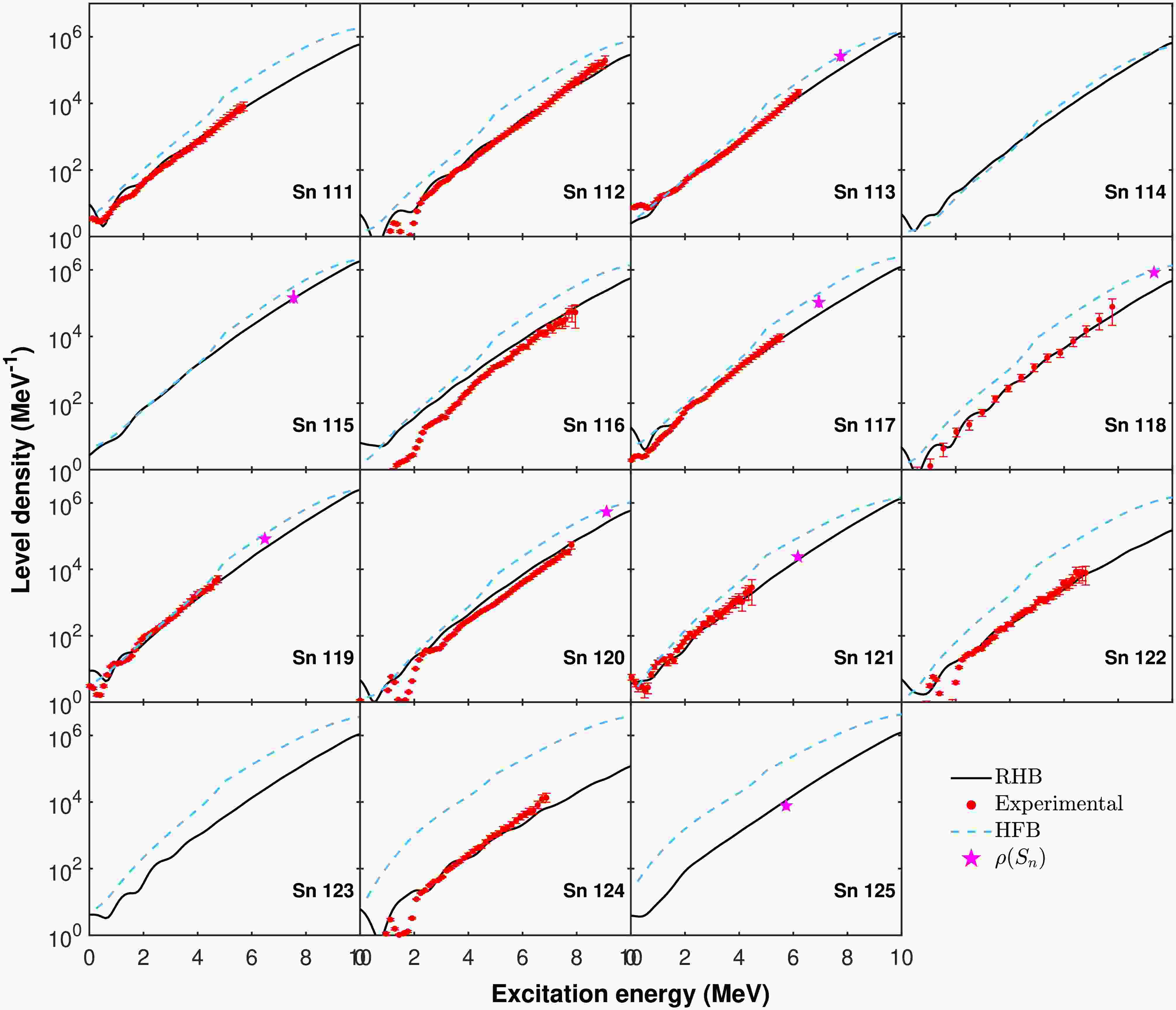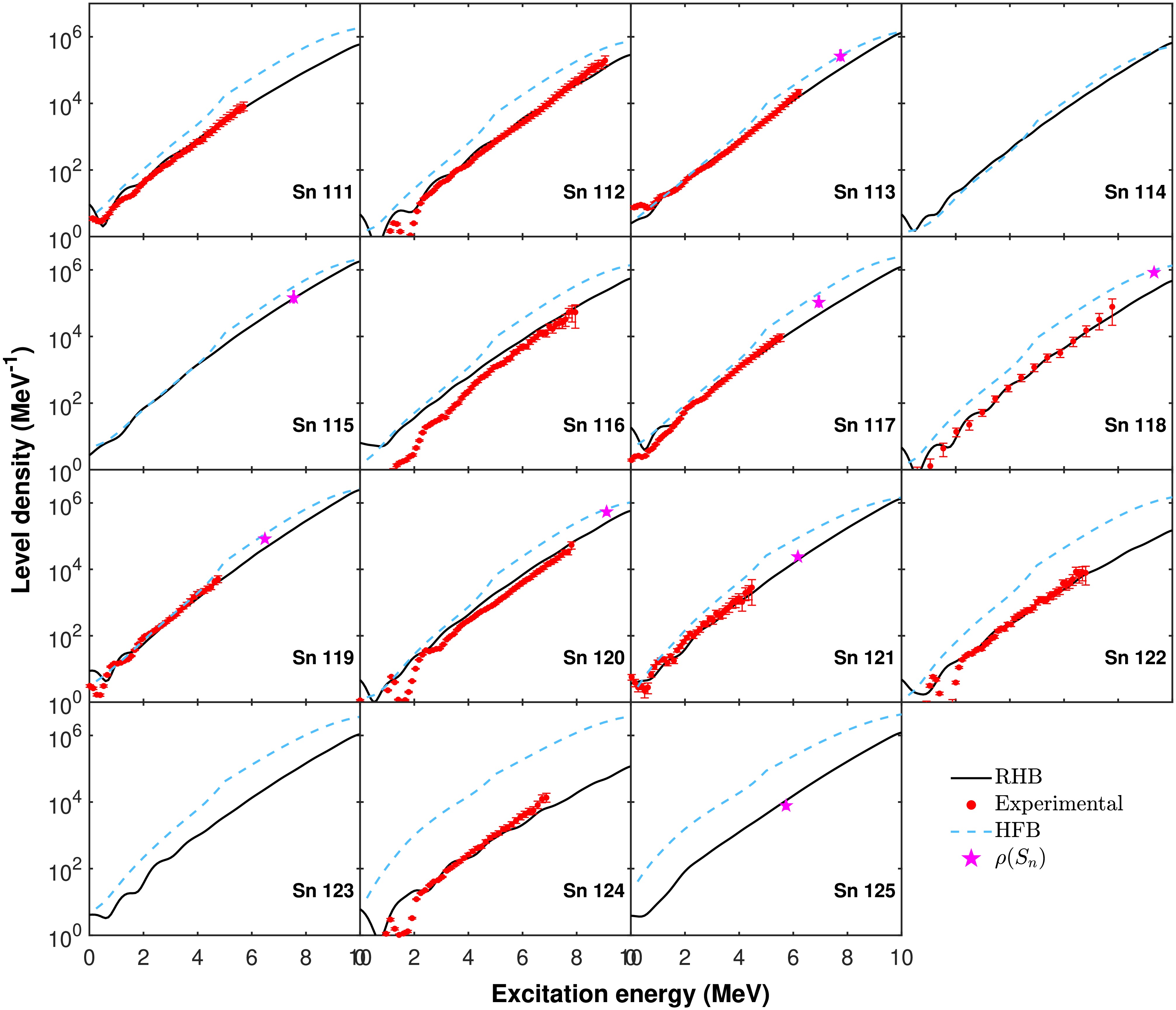 $ \rho(S_n) $ , deduced from s-wave neutron resonance spacings$ D_0 $ is also shown.For most isotopes, the present calculations reproduce the experimental level densities over a broad excitation-energy range. In particular, at low excitation energies, typically below 6 MeV, the RHB-based results follow both the slope and the absolute magnitude of the experimental data more closely than the HFB-based calculations. By contrast, the HFB plus combinatorial approach tends to overestimate the level density in this energy region for several isotopes. In our calculations, the RHB theory is implemented with a finite-range separable pairing force [43, 44]. The improved agreement with experimental level densities at low excitation energies is attributed to the combined effects of pairing correlations and differences in the underlying single-particle shell structure predicted by the relativistic framework, rather than to pairing correlations alone. In particular, for mid-shell Sn isotopes such as 112–118Sn, the present approach provides improved agreement with the experimental level densities in the low-energy region where pairing and shell effects are most pronounced. A detailed sensitivity study with respect to the pairing interaction is beyond the scope of this work; however, moderate variations of the pairing strength are expected to mainly affect low-energy level densities, while the overall isotopic trends remain robust.