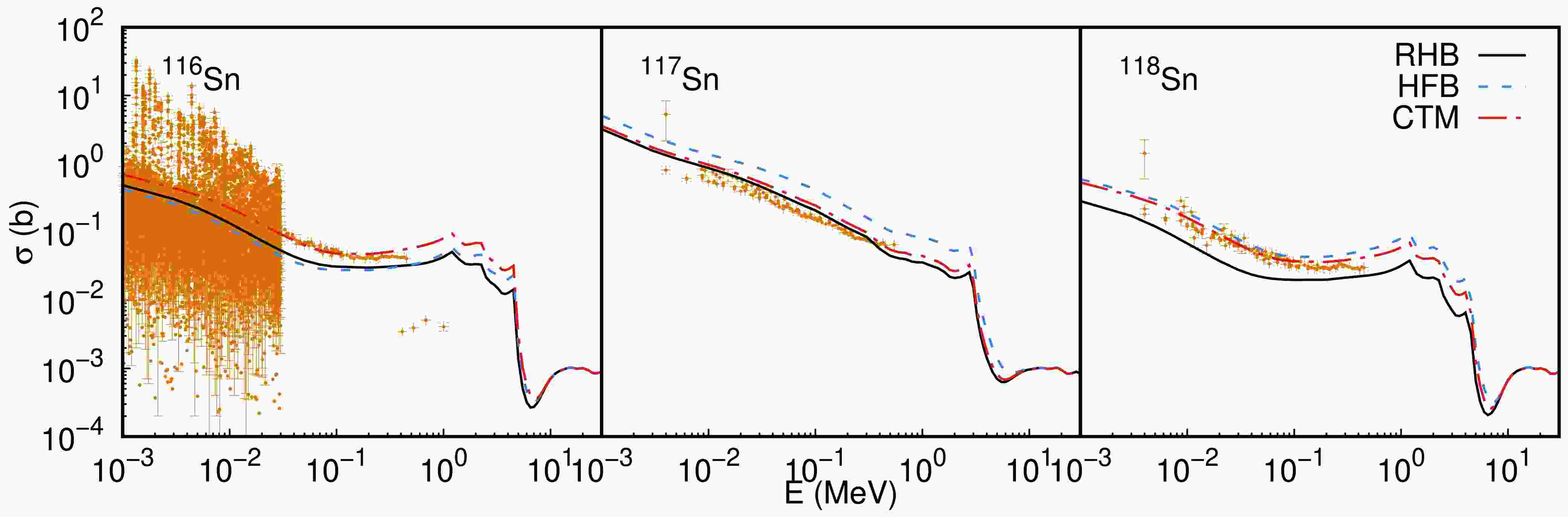 $ (n,\gamma) $ cross sections for 116Sn, 117Sn, and 118Sn, calculated using different nuclear level-density models, are compared with experimental data from the EXFOR library [55], as shown in Figure 4. All calculations are performed within the same UNF framework, with differences arising solely from the level-density input.