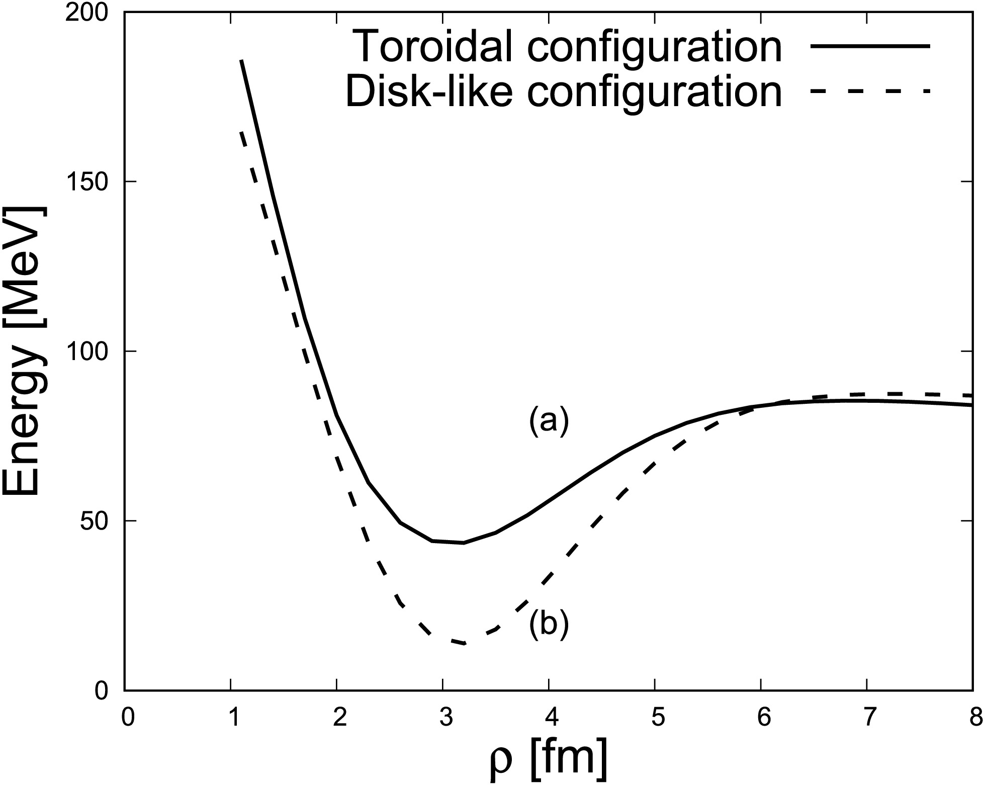 $ \mathcal{I} $ for the toroidal configuration scales with the square of the size length ($ \mathcal{I} \propto \rho^2 $ ), the centrifugal term$ \hbar^2 J(J+1)/2\mathcal{I} $ scales as$ \rho^{-2} $ . This dependence introduces a strong repulsive potential at short distances, which significantly elevates the inner barrier of the potential pocket. Consequently, higher angular momenta effectively suppress the breathing-mode decay toward the compact limit. This dynamical stabilization mechanism corroborates the self-consistent mean-field predictions reported in Ref. [24], where toroidal isomers were found to be stabilized specifically at high spin.Compared with the toroidal configuration, the disk-like configuration develops a substantially deeper pocket that emerges at a smaller value of ρ—indicative of a more compact arrangement—with an excitation energy of approximately 14 MeV above the experimental 7α breakup threshold. This energy lowering can be attributed primarily to the increased coordination number of the central α, which maximizes the short-range nuclear attraction and overrides the increased Coulomb repulsion.