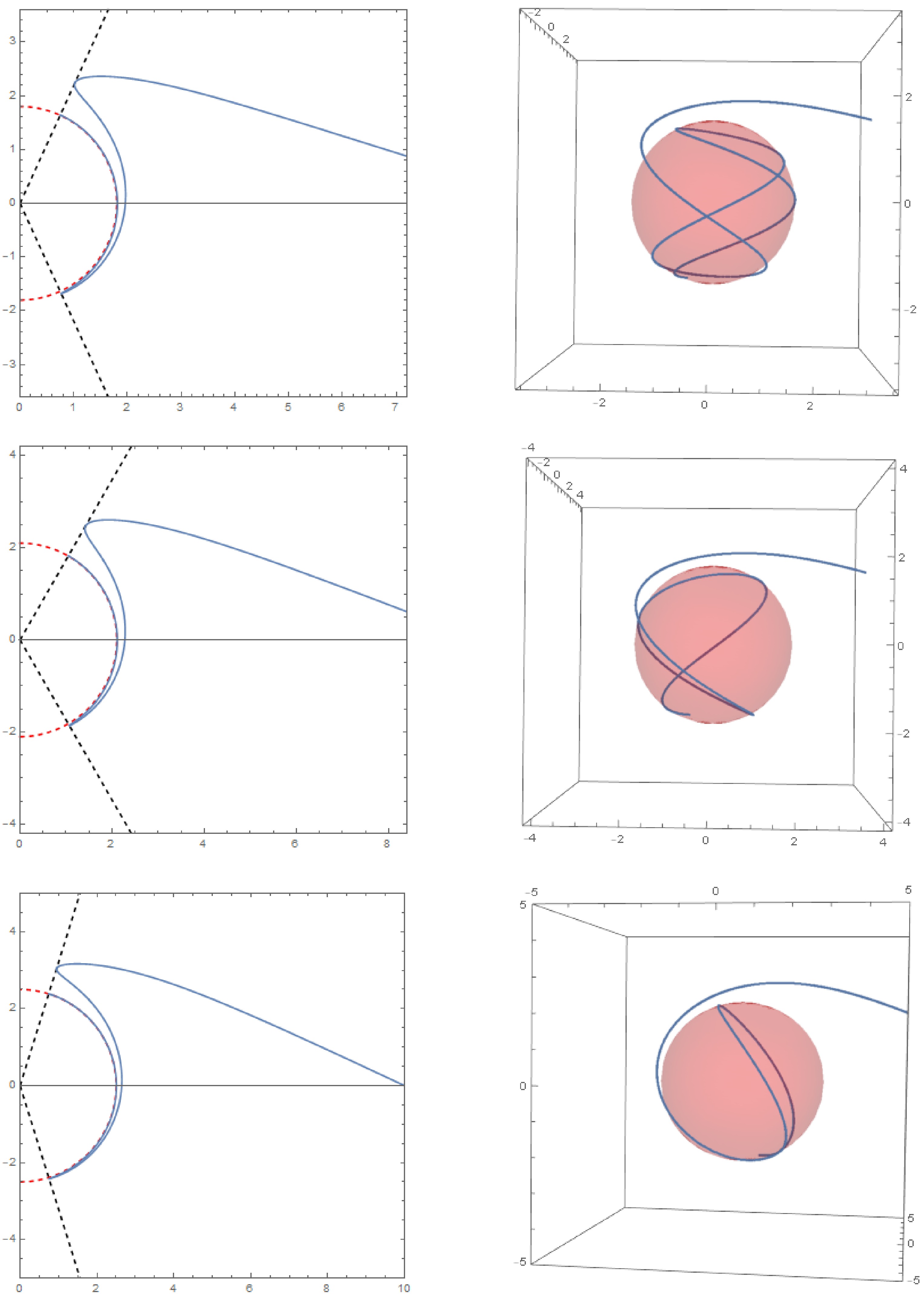 $ (r,\theta) $ plane, while the right diagram shows the corresponding trajectory in three-dimensional space. The initial conditions are$ r_{i} = 10,\mu_{i} = 0,\varphi_i = 0 $ . The parameter sets for each row of images (from top to bottom) are$ a = 0.8, r_c = 1.8, Q = 0.5, \tilde{e} = 1.1, \chi = 1.1; a = 0.8, r_c = 2.1, Q = 0.3, \tilde{e} = 1.3, \chi = 1.3; a = 0.4, r_c = 2.5, Q = 0.6, \tilde{e} = 1.5, \chi = 1.5 $ . -