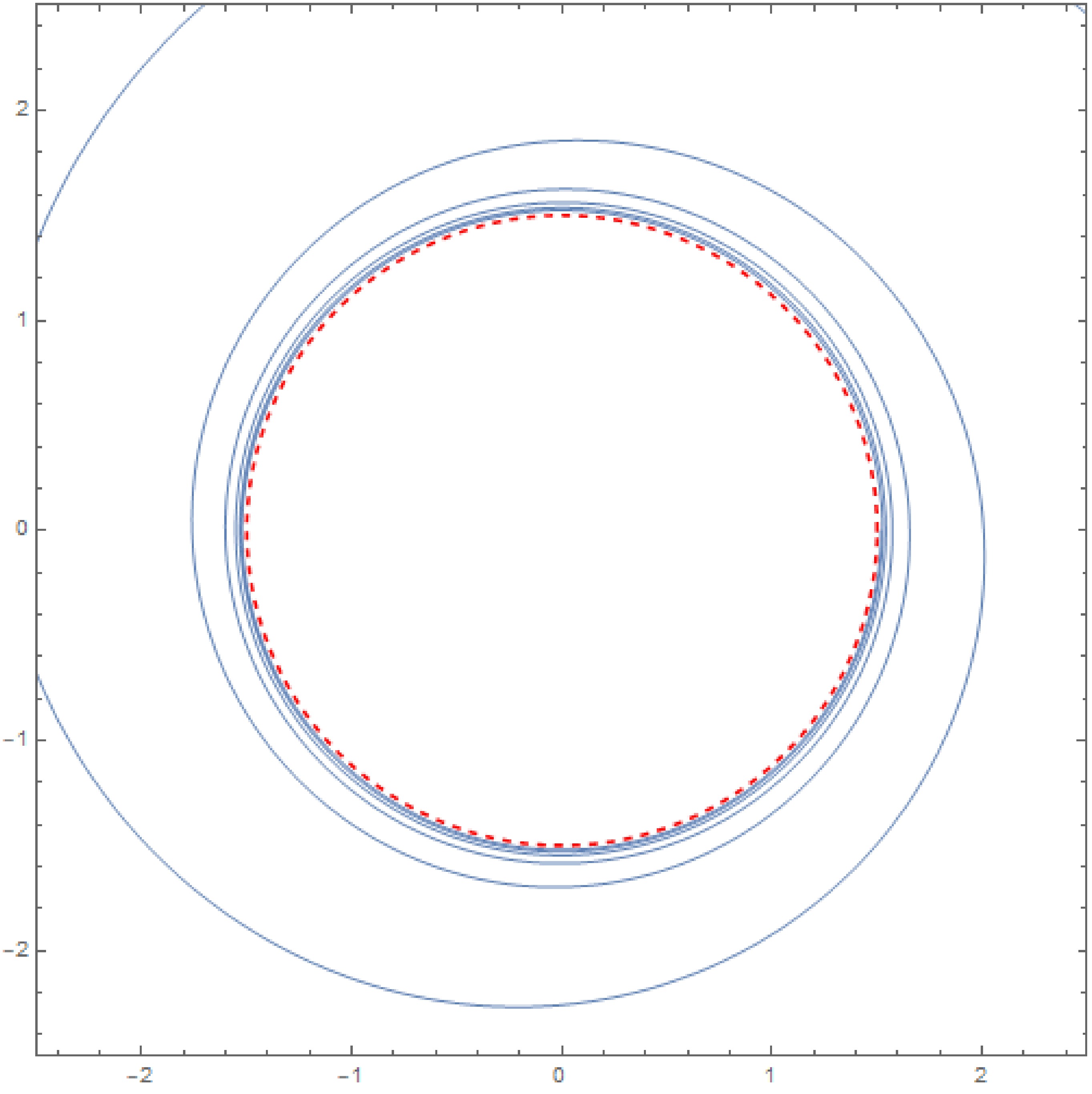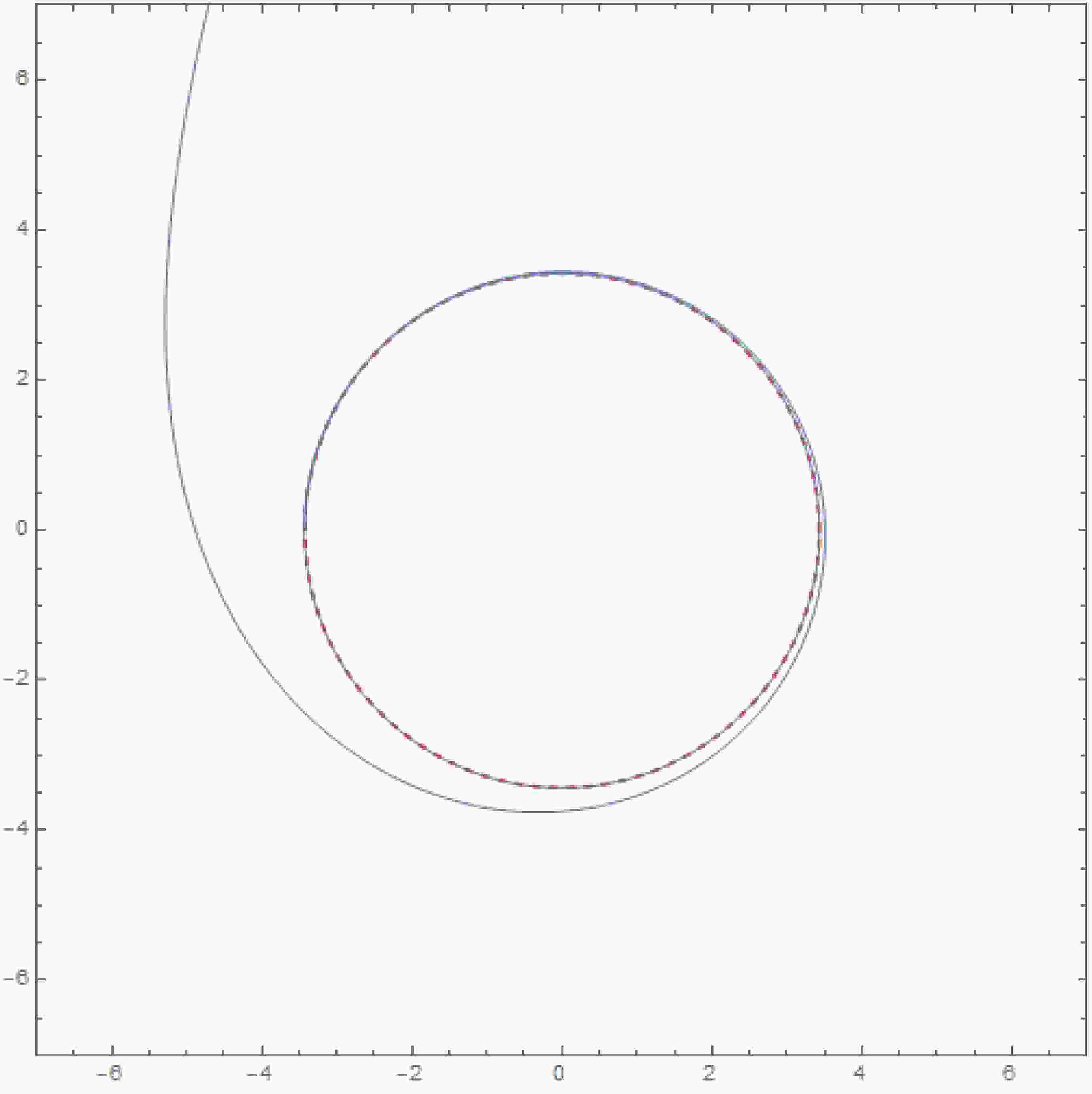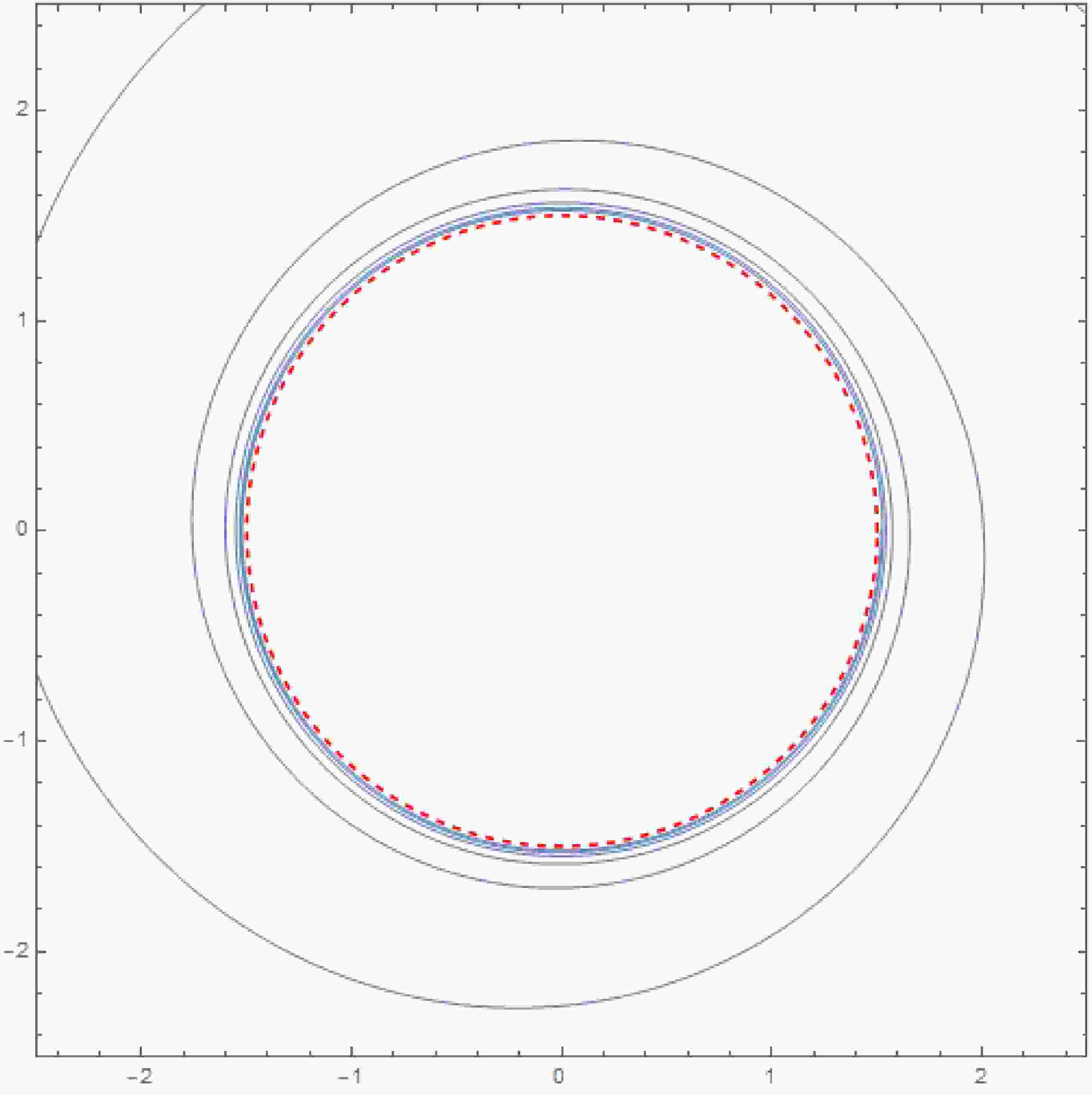 $ \varphi_0 $ is an integration constant. The critical null geodesic is shown in Fig. 2, depicting the trajectory of a massless particle originating at infinity and spiraling inward, asymptotically approuching the circular at$ r_c = 3M $ . -