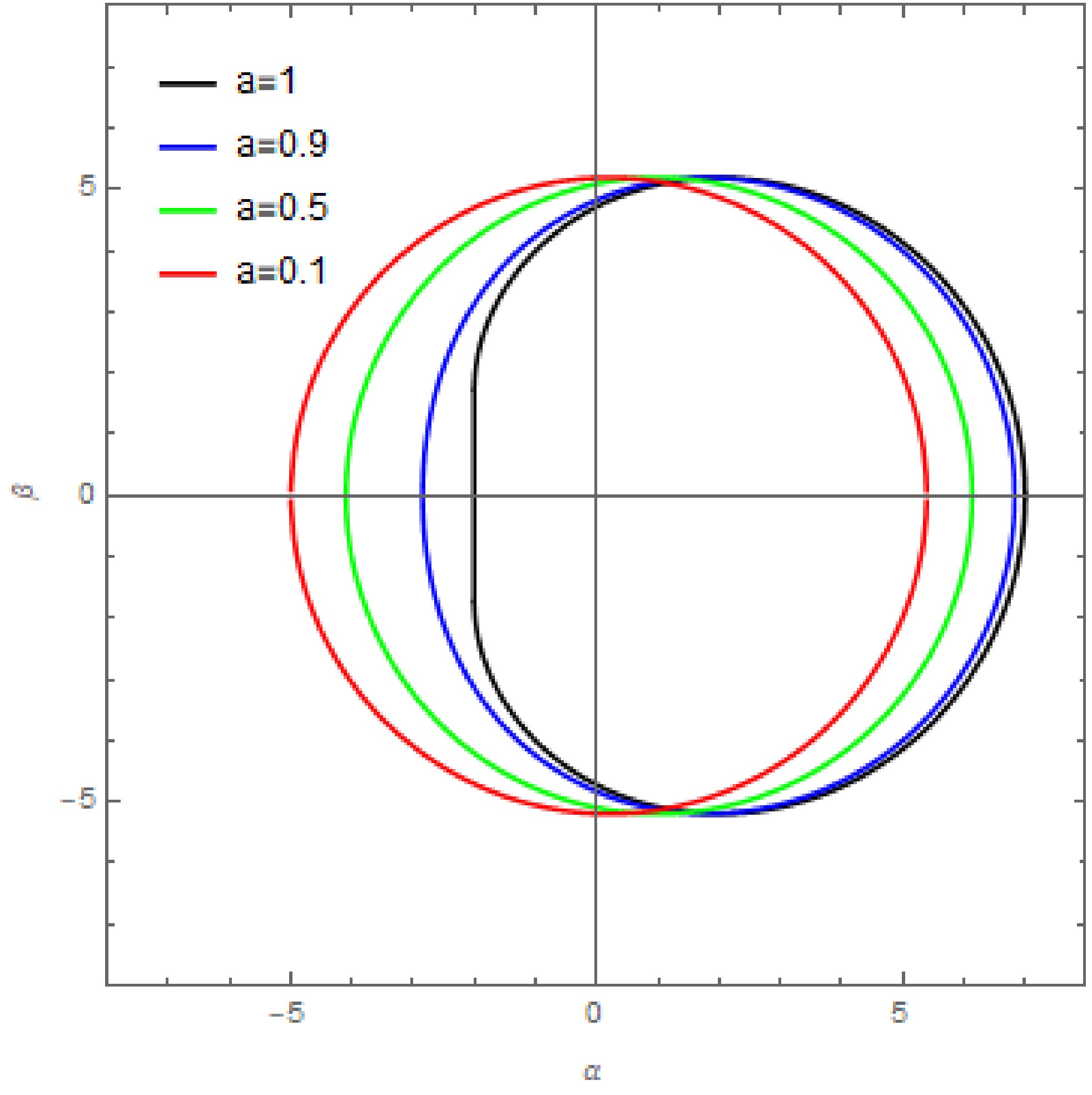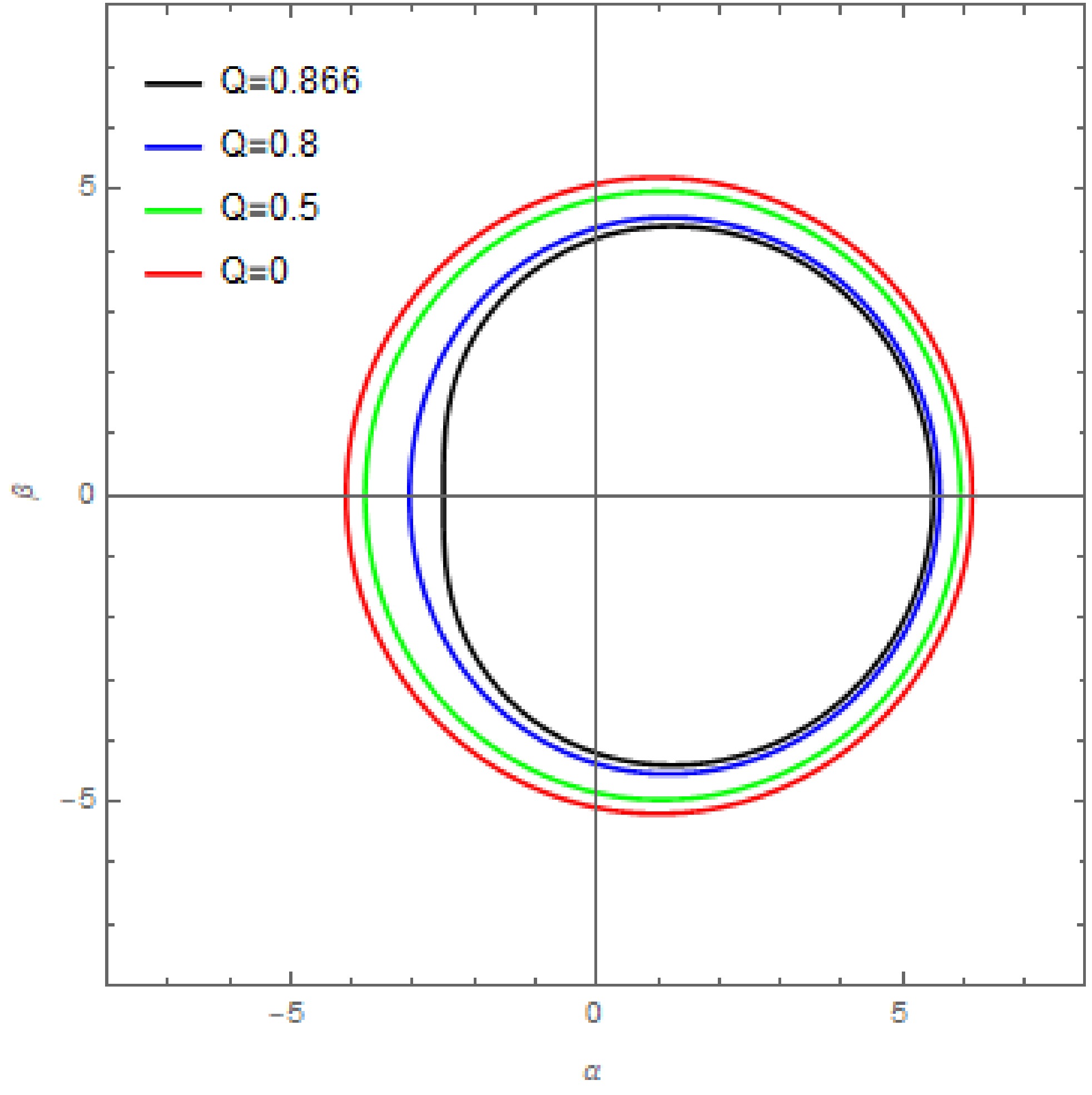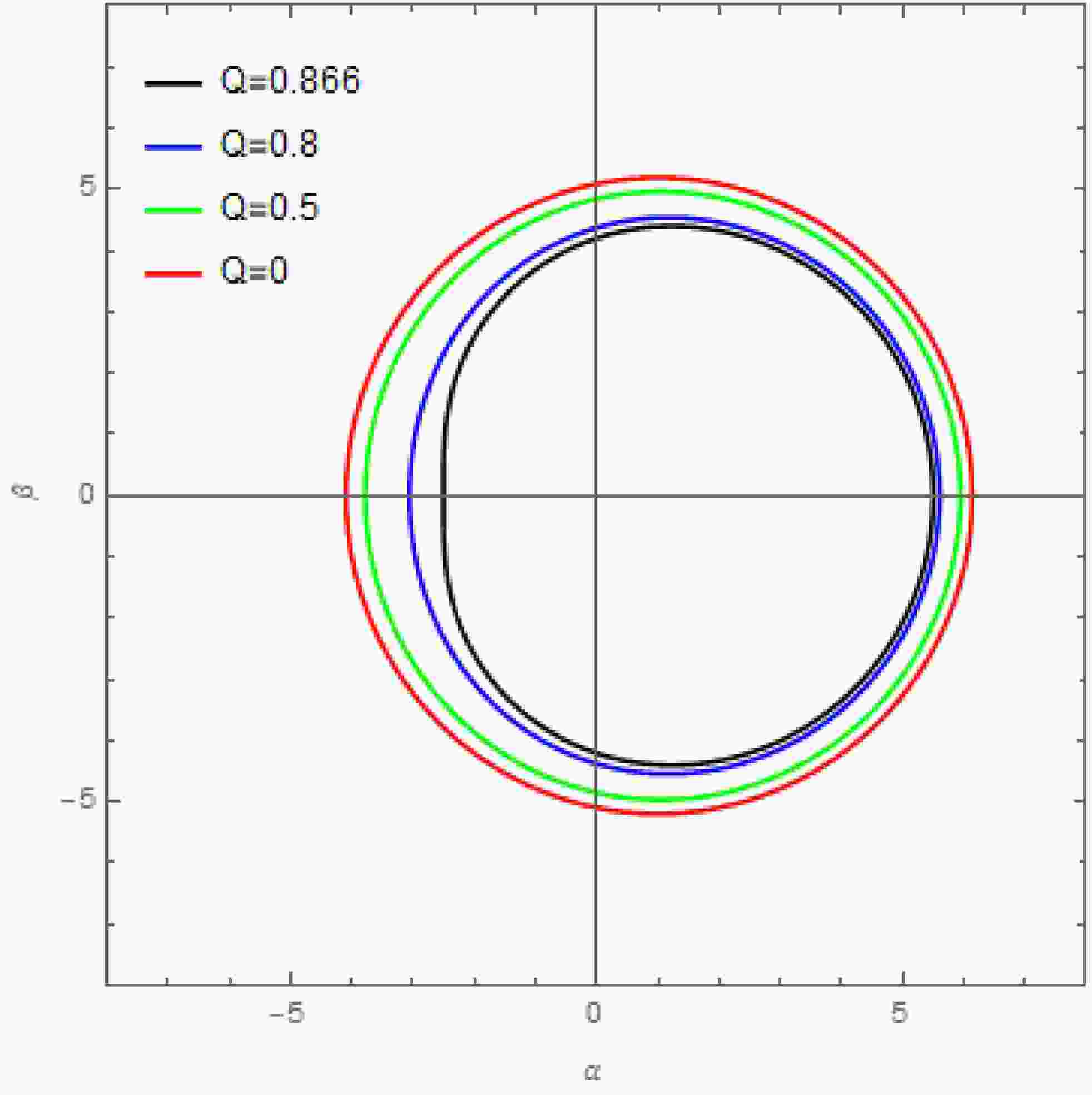 Figure 9. (color online) The shadow of a Kerr-Newman black hole as seen by a distant observer in the equatorial plane. The mass of the black hole is set to