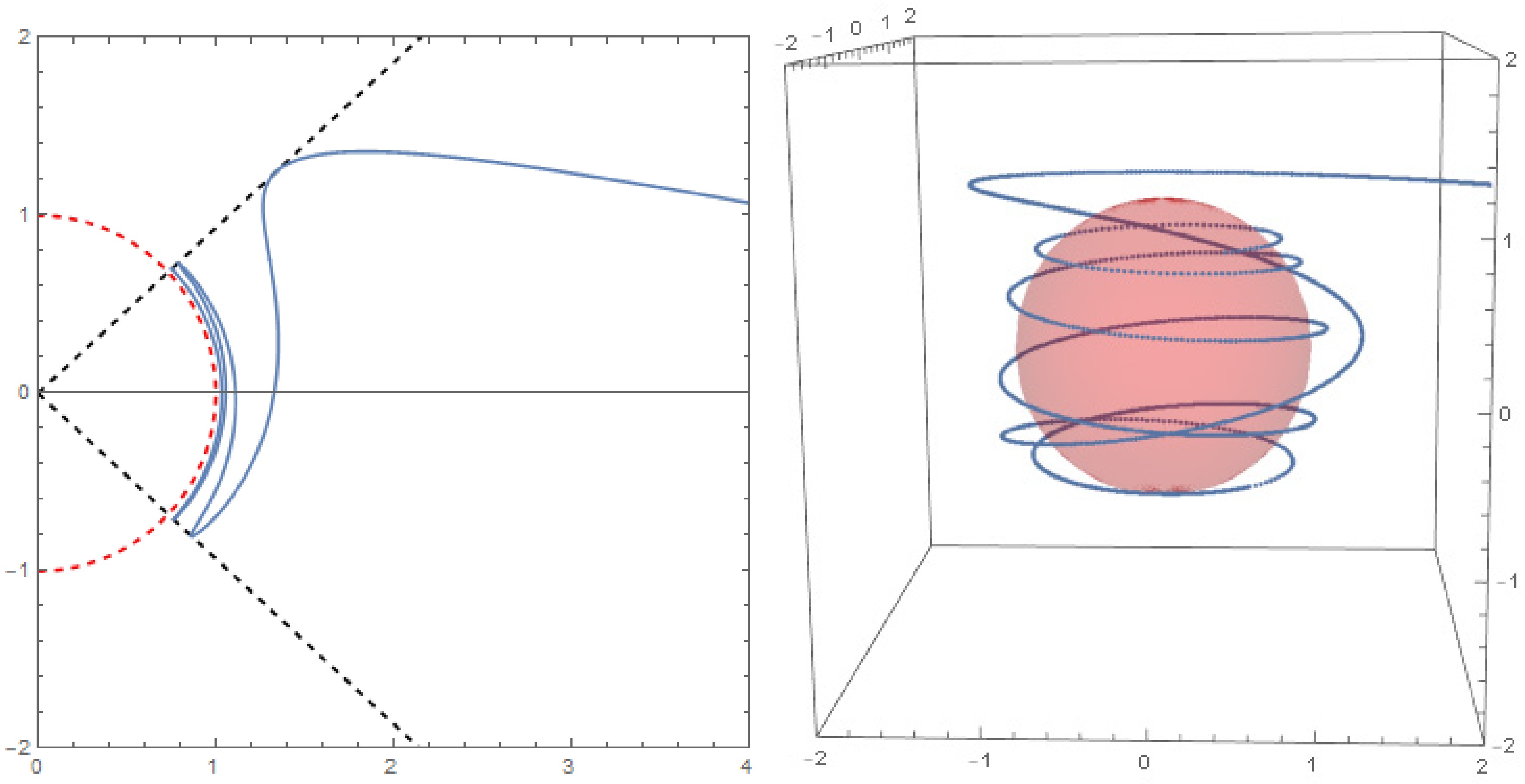 Figure 10. (color online) Critical null geodesics with triply coincident roots in Kerr-Newman spacetime. The left diagram illustrates the trajectory of a null geodesic in the