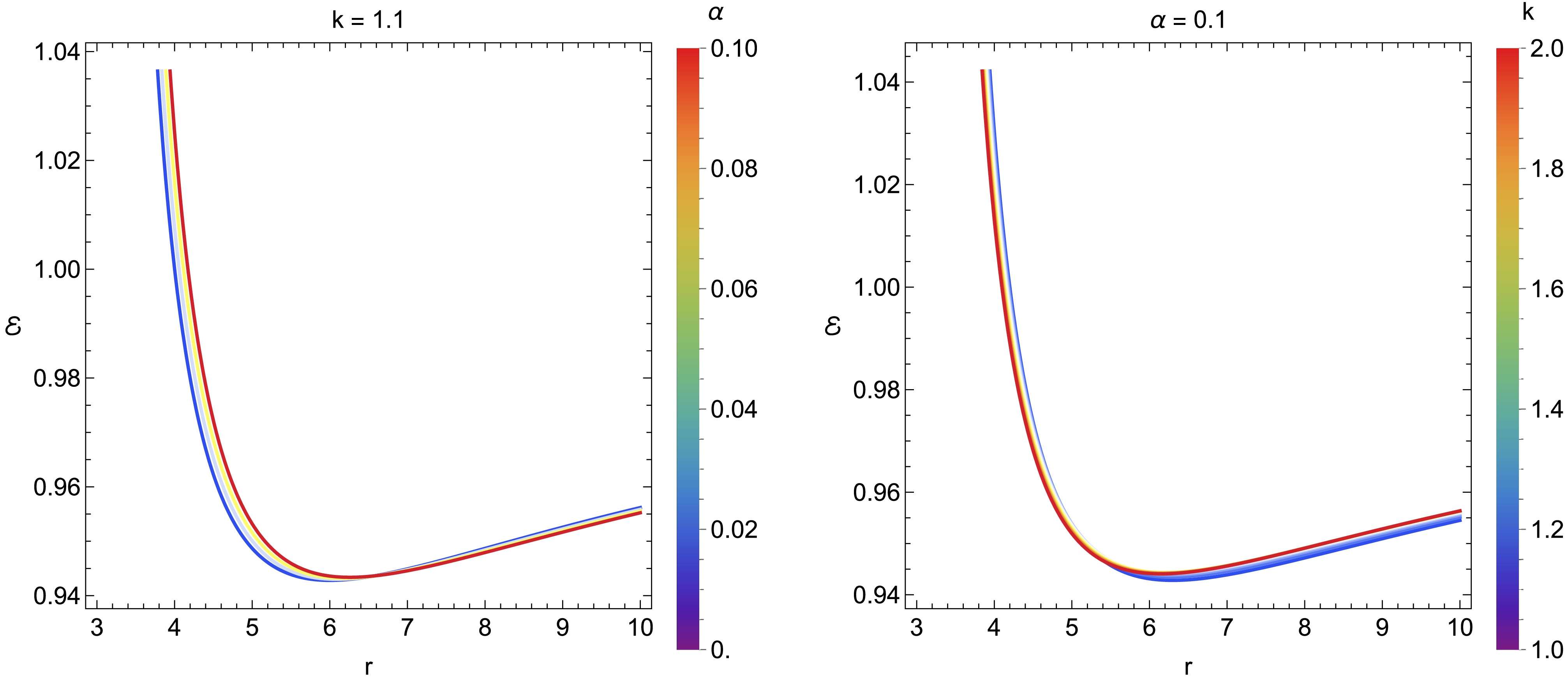 $ {{\cal{E}}} $ corresponding to circular equatorial orbits in the same background. Also, the plot indicates that for circular orbits, the energy initially increases when the BH parameter α increases, but after a certain stage it starts to decline for larger α. A comparable trend is obtained when the parameter is changed k. In addition to this, the figure also shows that the energy$ {{\cal{E}}} $ of the particles grows as the orbital radius r increases.