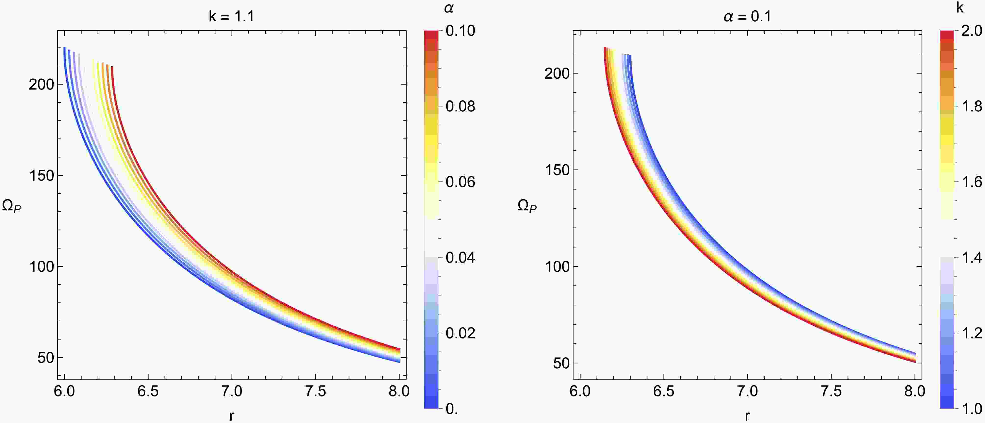 $ \Omega\_{P} $ with different values of the parameter α, while the second panel presents the case for different values of k. The increase in k reduces the frequency of the periastron, whereas the larger values of α improve it. In addition,$ \Omega\_{P} $ also decreases as the radial distance r increases.