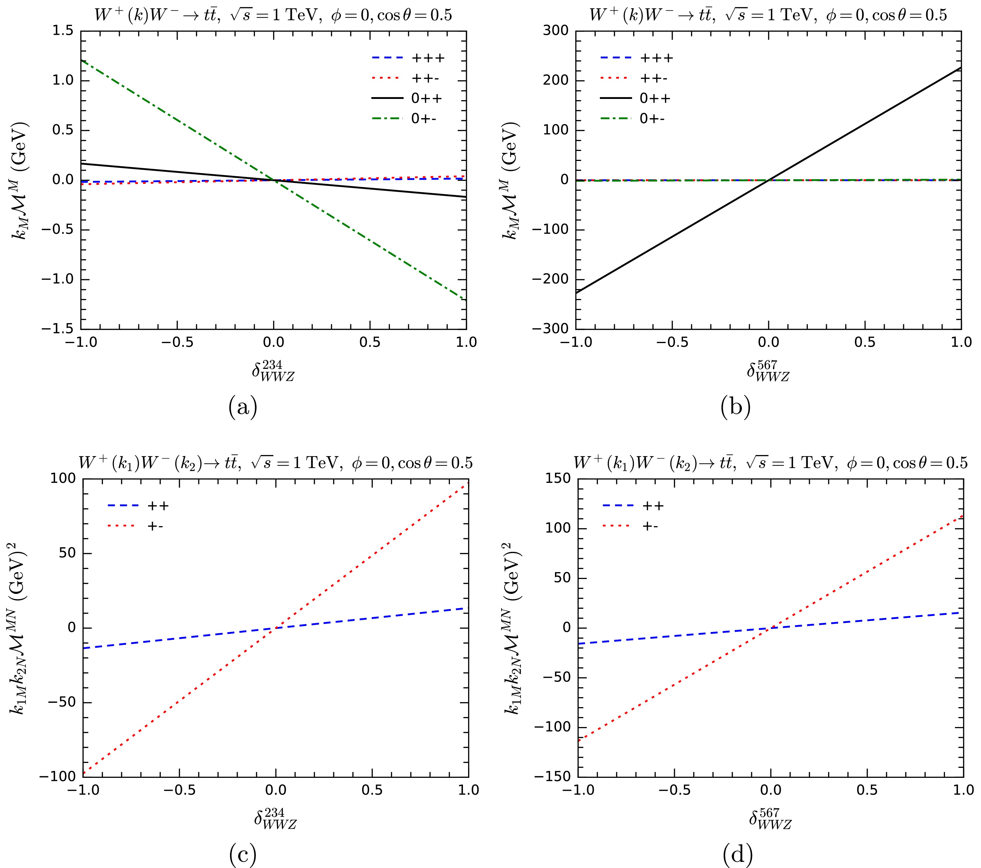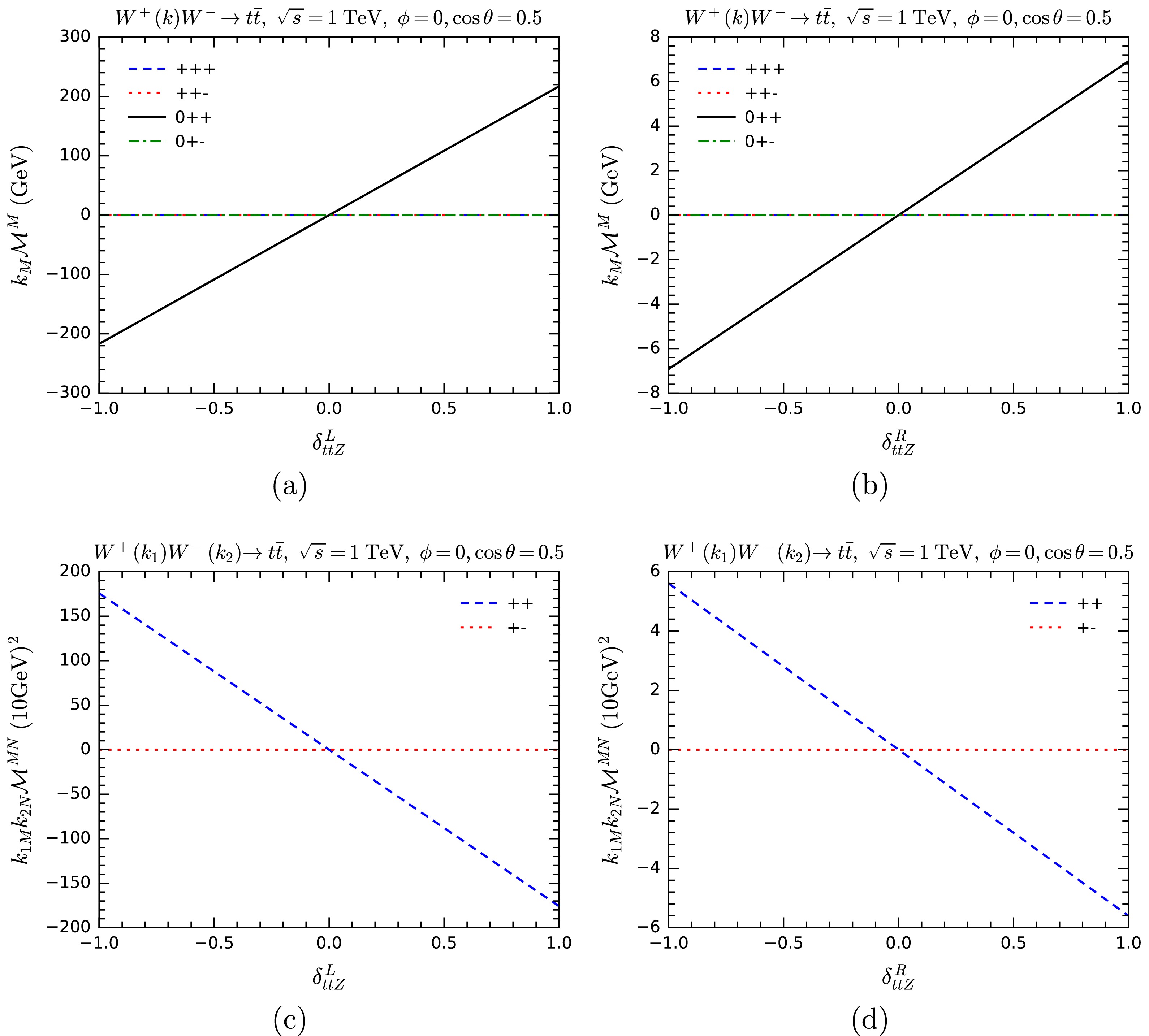$ k_M{\cal{M}}^M $ (upper panels) and$ k_{1M} k_{2N}{\cal{M}}^{MN} $ (lower panels) with anomalous$ ttZ $ couplings for the process$ WW\rightarrow t\bar t $ . Various helicity combinations are shown.$ VVV $ vertexIn the SM, there two