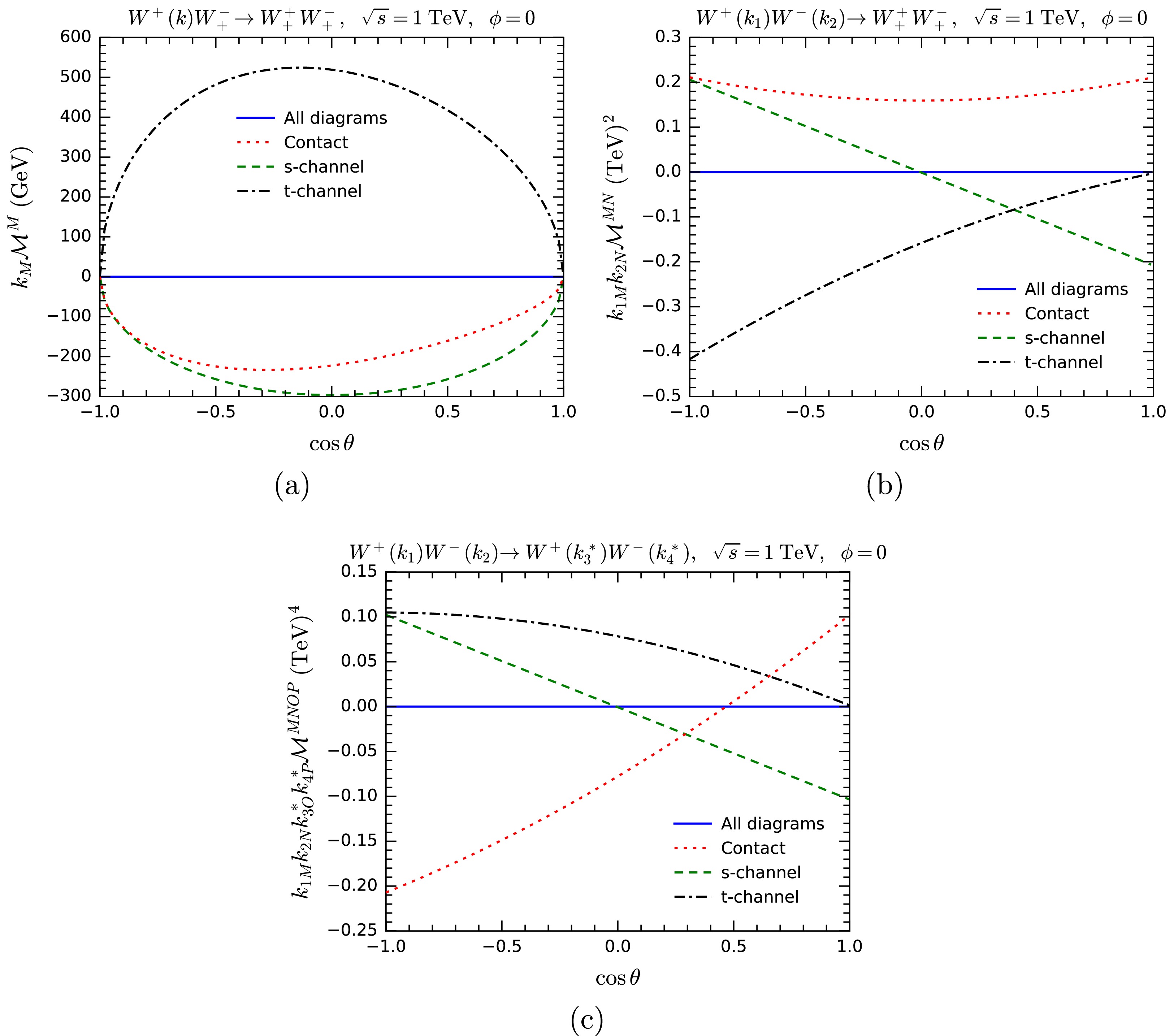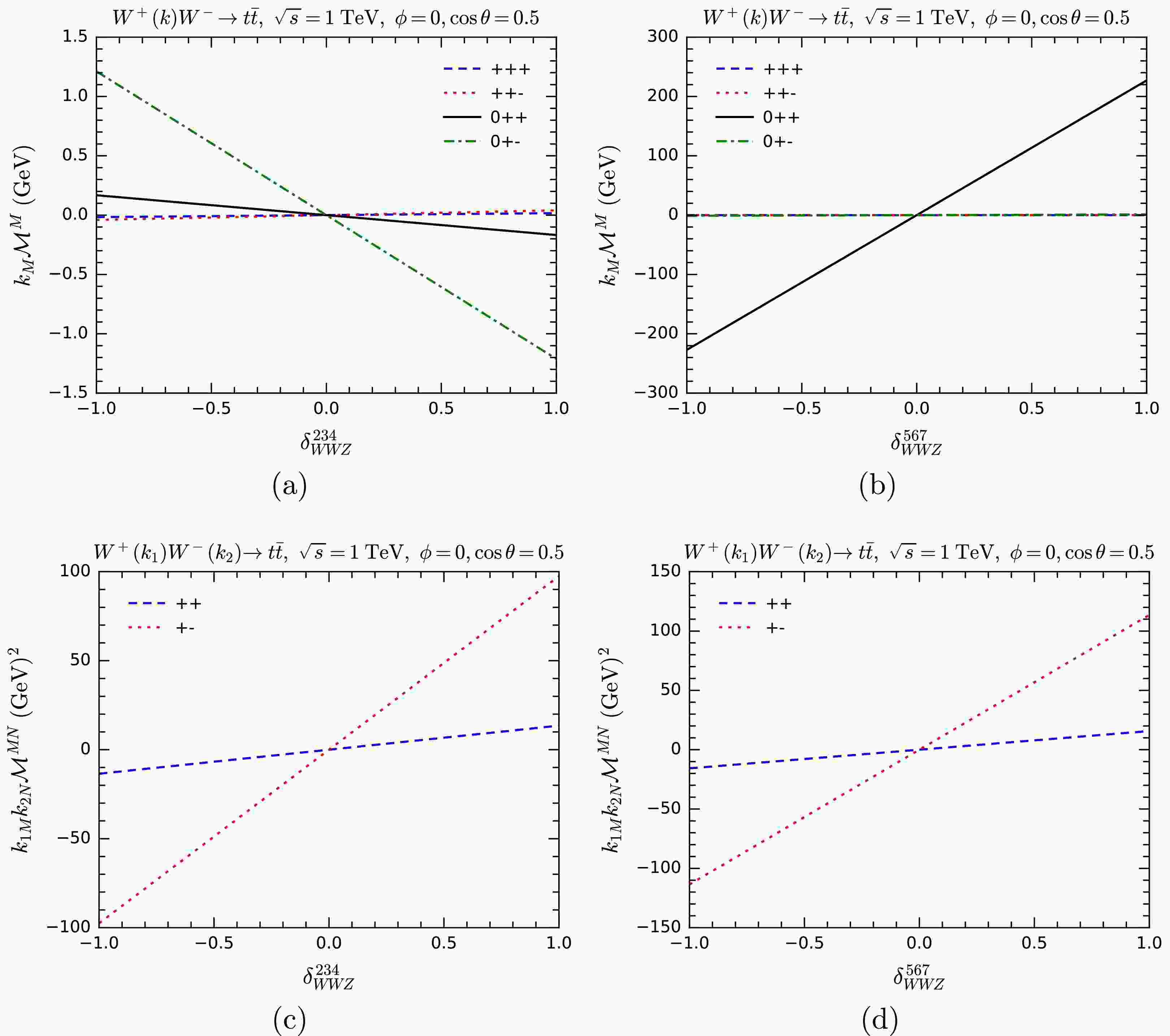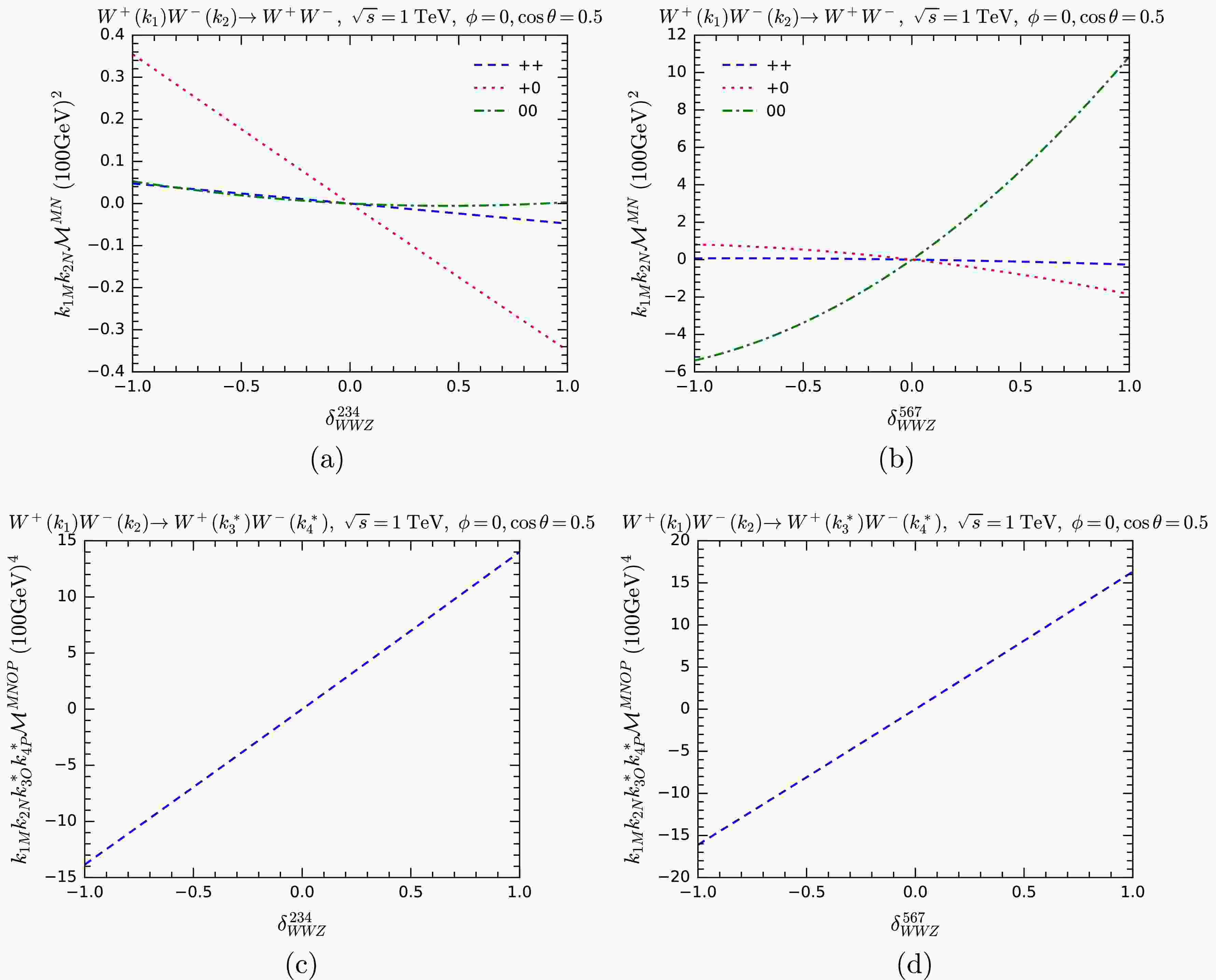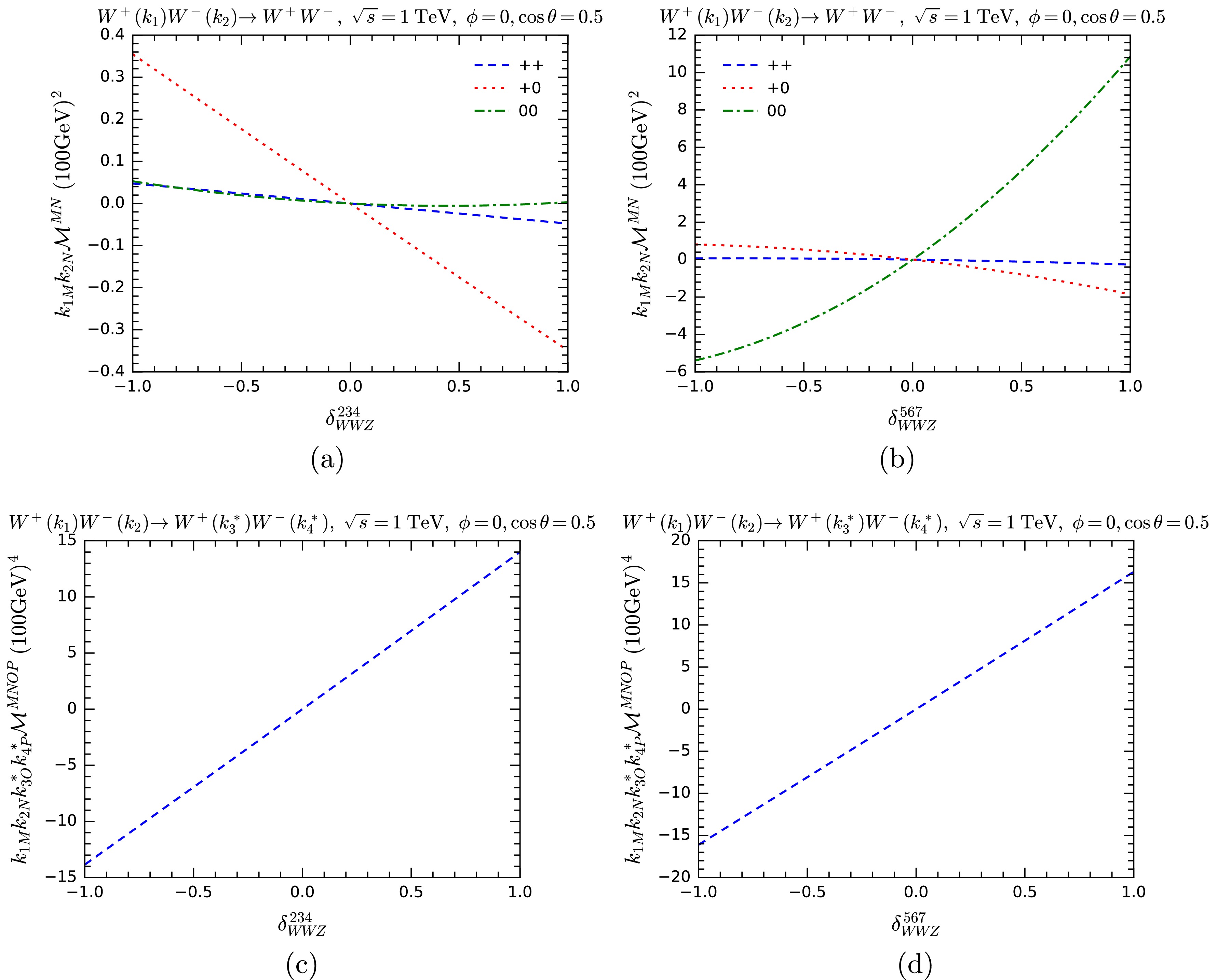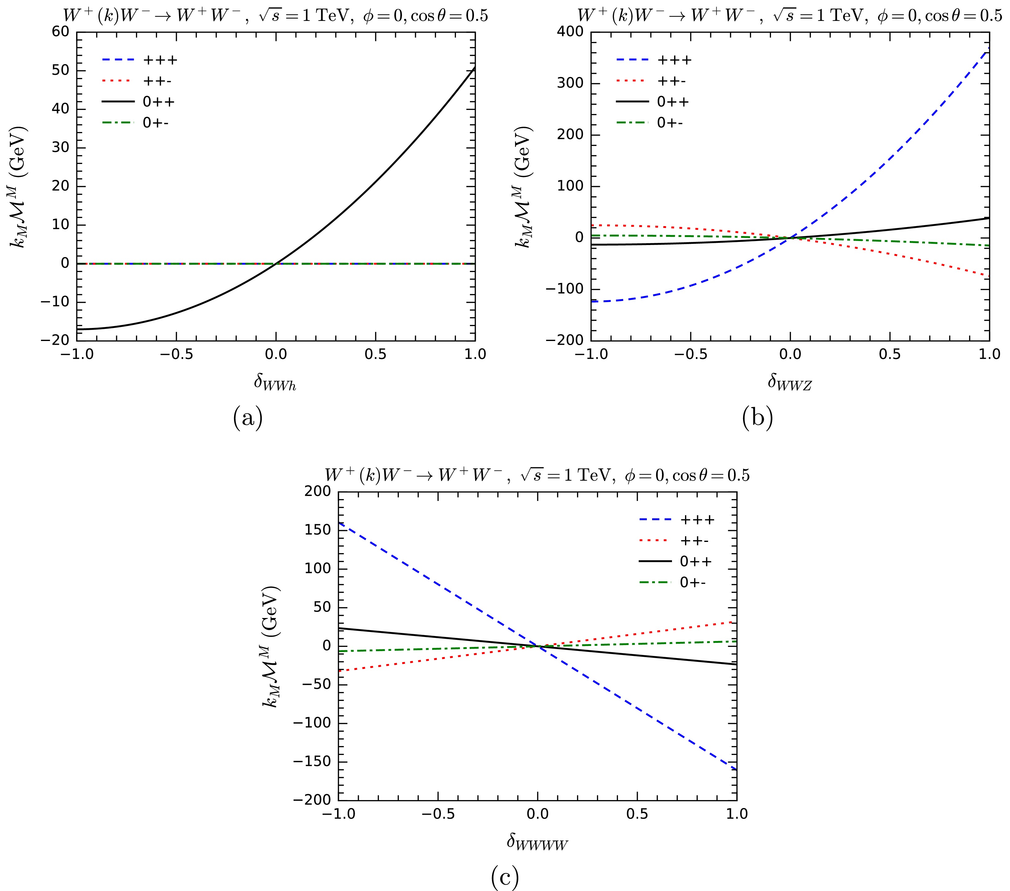 $ W^+ W^-\rightarrow W^+ W^- $ , we separately vary the overall couplings of the$ WWh $ ,$ WWZ $ , and$ WWWW $ vertices and compute$ k_M {\cal{M}}^M $ . In Fig. 13, we show the results, listing different helicity combinations in the process. As expected, we can see the violation of the MWI when the anomalous couplings are nonzero. This violation is most sensitive to$ \delta_{WWZ} $ and$ \delta_{WWWW} $ .Figure 13. (color online)