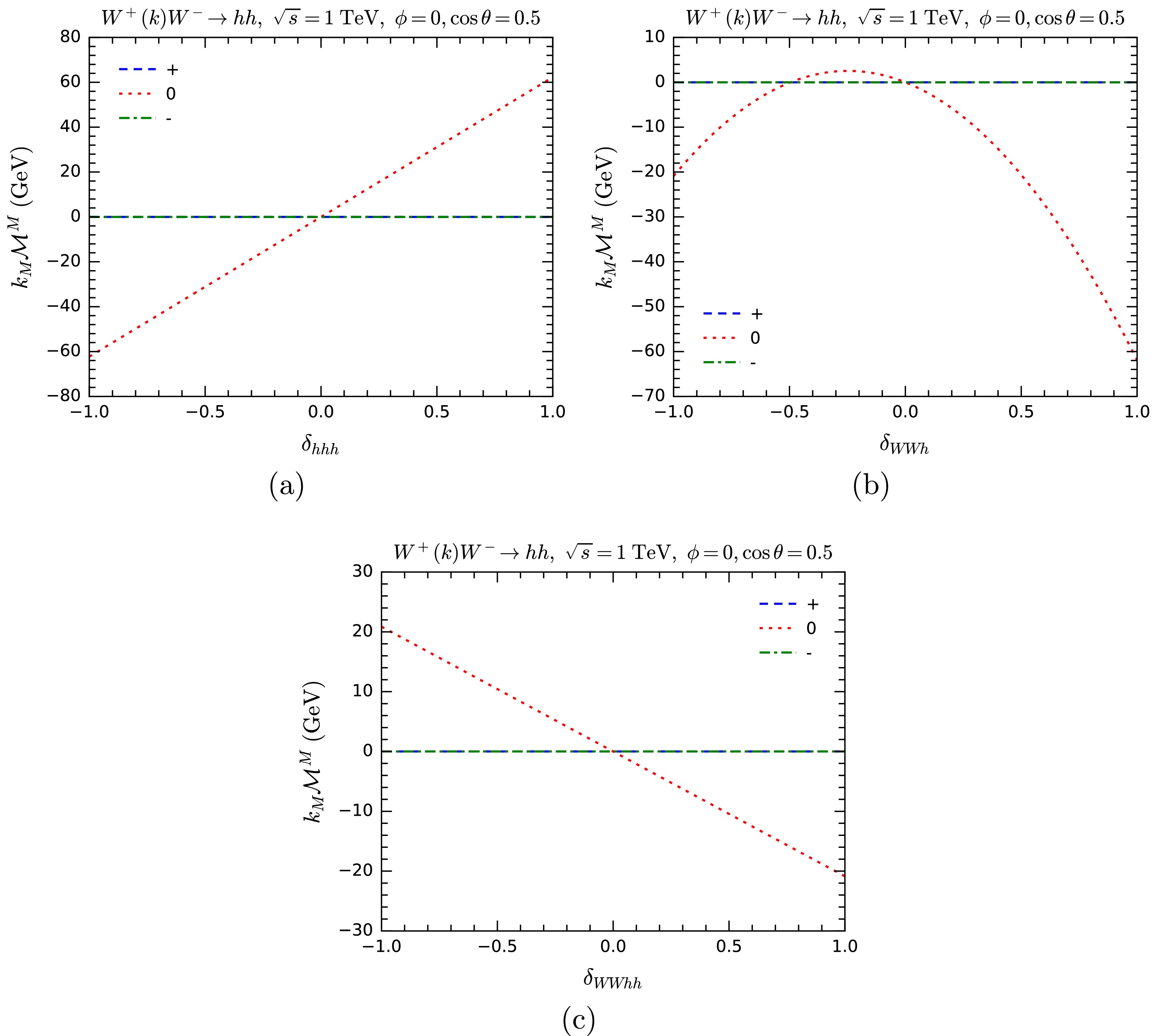 $ k_M{\cal{M}}^M $ for$ WW\rightarrow hh $ as functions of anomalous overall couplings$ \delta_{hhh} $ (a),$ \delta_{WWh} $ (b), and$ \delta_{WWhh} $ (c). Various helicity configurations are shown.For