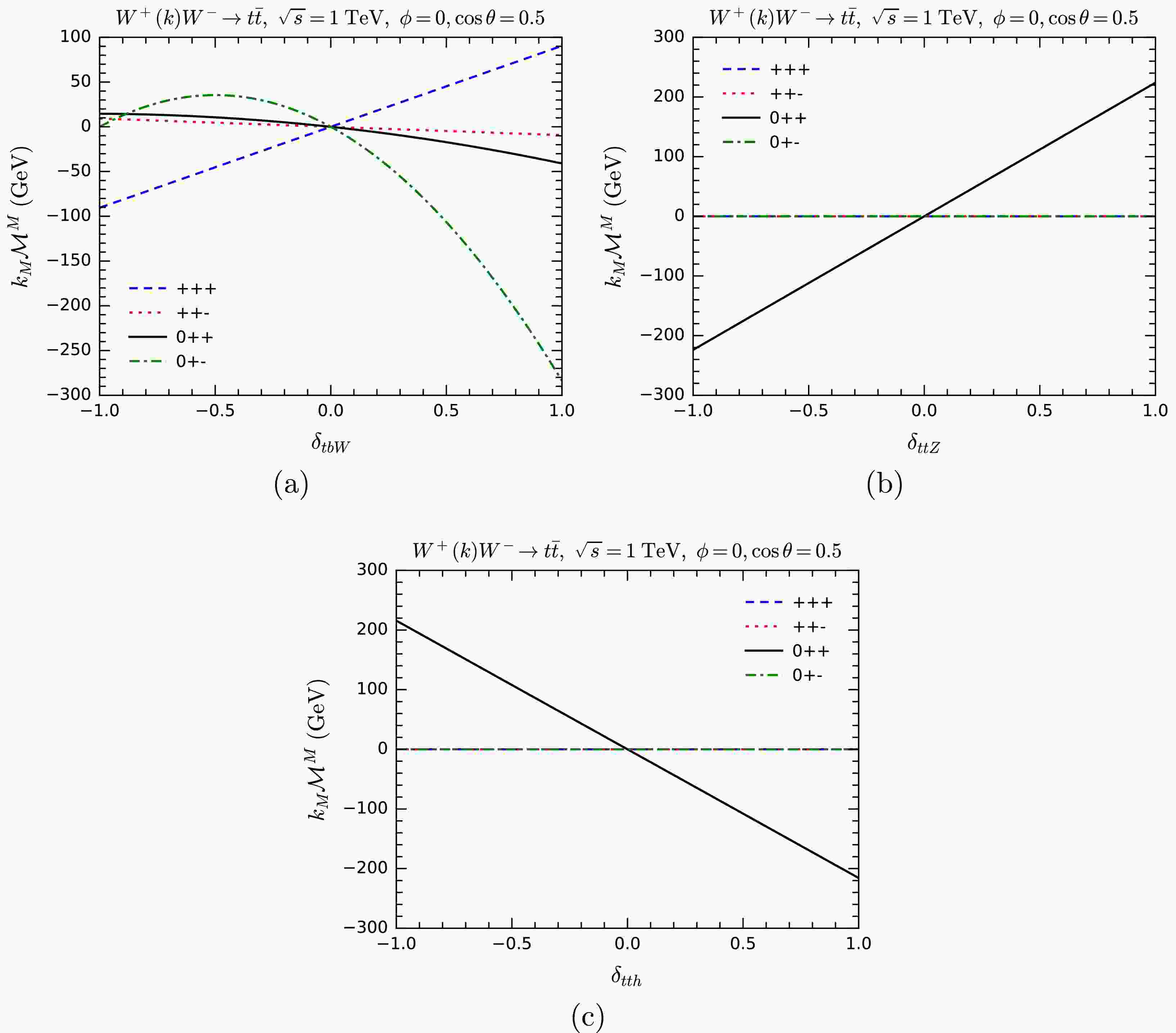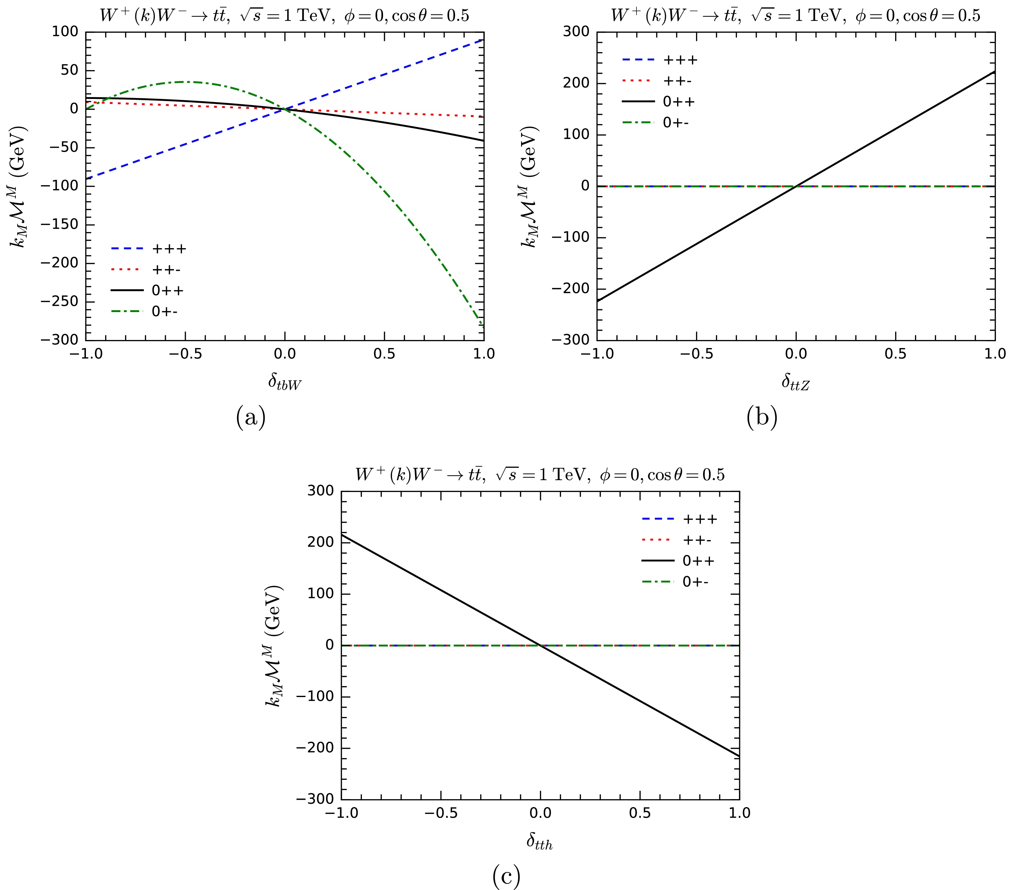 $ k_M{\cal{M}}^M $ for$ WW\rightarrow t\bar t $ as functions of anomalous overall couplings$ \delta_{tbW} $ (a),$ \delta_{ttZ} $ (b), and$ \delta_{tth} $ (c). Various helicity combinations are shown.The overall pattern is similar for all three processes. Angular conservation forbids some helicity combinations, giving