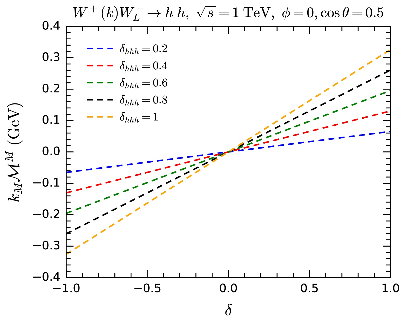 $ \delta = 0 $ corresponds to the relation (20) that respects gauge symmetry. We take$ \delta_{hhh} $ to be$ 0.2 $ ,$ 0.4 $ ,$ 0.8 $ , and$ 1 $ . For every$ \delta_{hhh} $ value, we compute$ k_M{\cal{M}}^M $ as a function of δ for the$ WW\rightarrow h h $ process with one W polarization vector replaced by the 5-component momentum. The results are summarized in Fig. 16. As can be seen in the figure,$ k_M{\cal{M}}^M = 0 $ only appears when$ \delta =0 $ , i.e., when the relation (20) holds. This confirms our argument that, with an anomalous coupling of$ \lambda_{hhh} $ , gauge symmetry can be restored by adding an proper anomalous coupling of$ \lambda_{hh\varphi\varphi} $ .Figure 16. (color online)