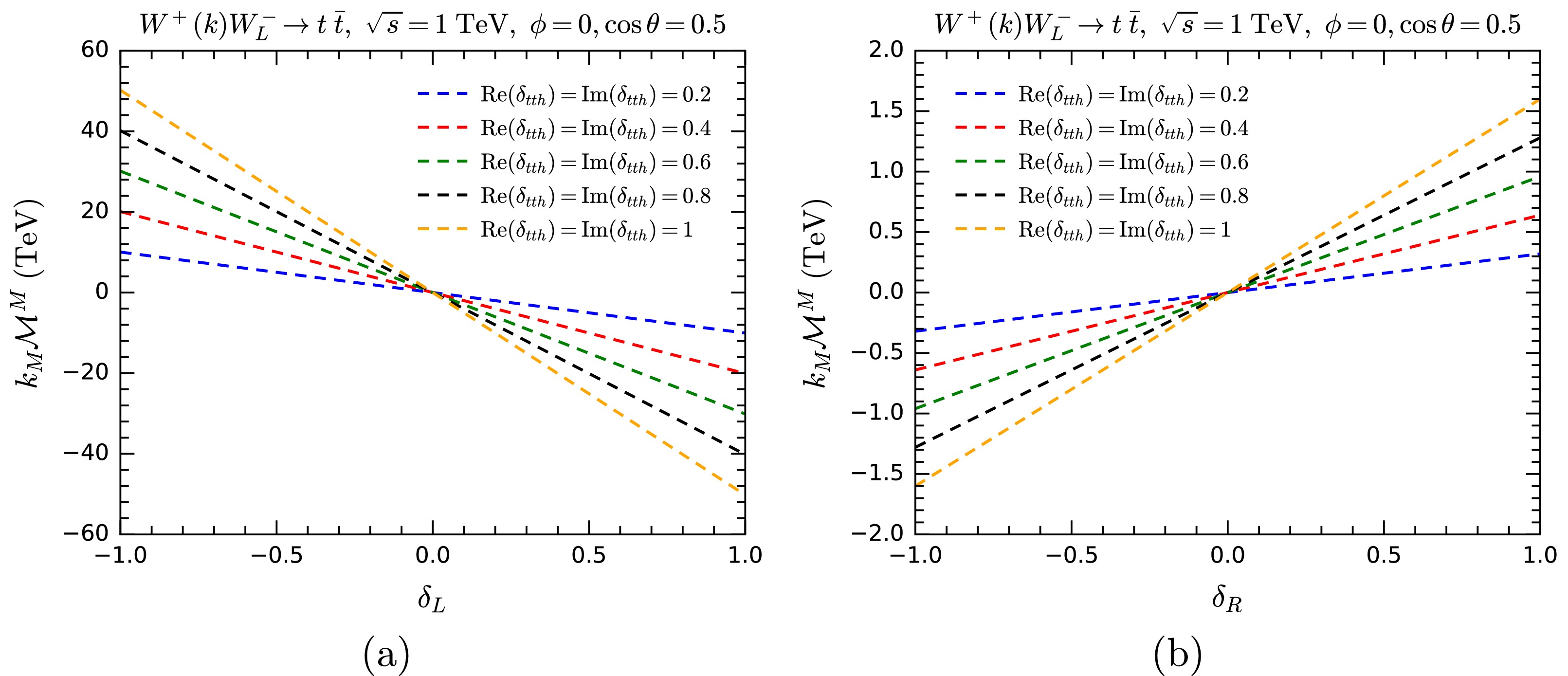 $ k_M{\cal{M}}^M $ for$ WW\rightarrow t\bar{t} $ as functions of$ \delta_{\rm{L}} $ (a) and$ \delta_{\rm{R}} $ (b) with different values of$ \operatorname{Re}(\delta_{tth}) $ and$ \operatorname{Im}(\delta_{tth}) $ , serving as a test for gauge symmetry in the presence of the SMEFT operator$ {\cal{O}}_{t\Phi} $ . -