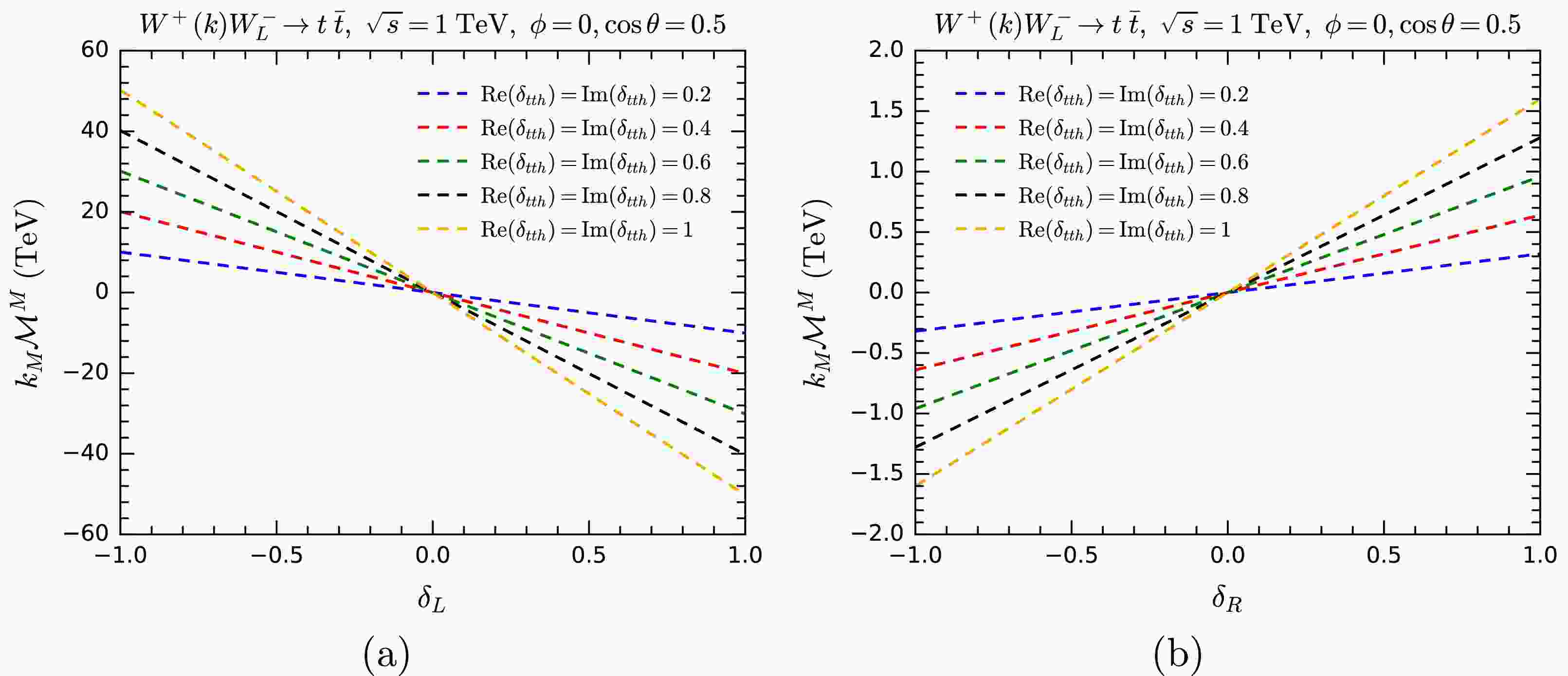 $ \delta_{\rm{L}} = \delta_{\rm{R}} = 0 $ corresponds to the modifications contributed by the$ {\cal{O}}_{t\Phi} $ operator that preserve gauge symmetry. In Figs. 17(a) and 17(b), we show$ k_M{\cal{M}}^M $ for$ WW\rightarrow t\bar{t} $ as functions of$ \delta_{\rm{L}} $ and$ \delta_{\rm{R}} $ assuming various values of$ \operatorname{Re}(\delta_{tth}) $ and$ \operatorname{Im}(\delta_{tth}) $ , where$ \delta_{tth} $ is defined as$ \delta_{tth} \equiv C_{t\Phi} v^2/\sqrt{2} $ . As expected, gauge symmetry is restored when the condition (30) is satisfied. This demonstrates that an anomalous Yukawa coupling can be counterbalanced by a corresponding$ ff\varphi\varphi $ contact vertex, ensuring that the$ WW\rightarrow t\bar{t} $ amplitude remains gauge invariant.Figure 17. (color online)