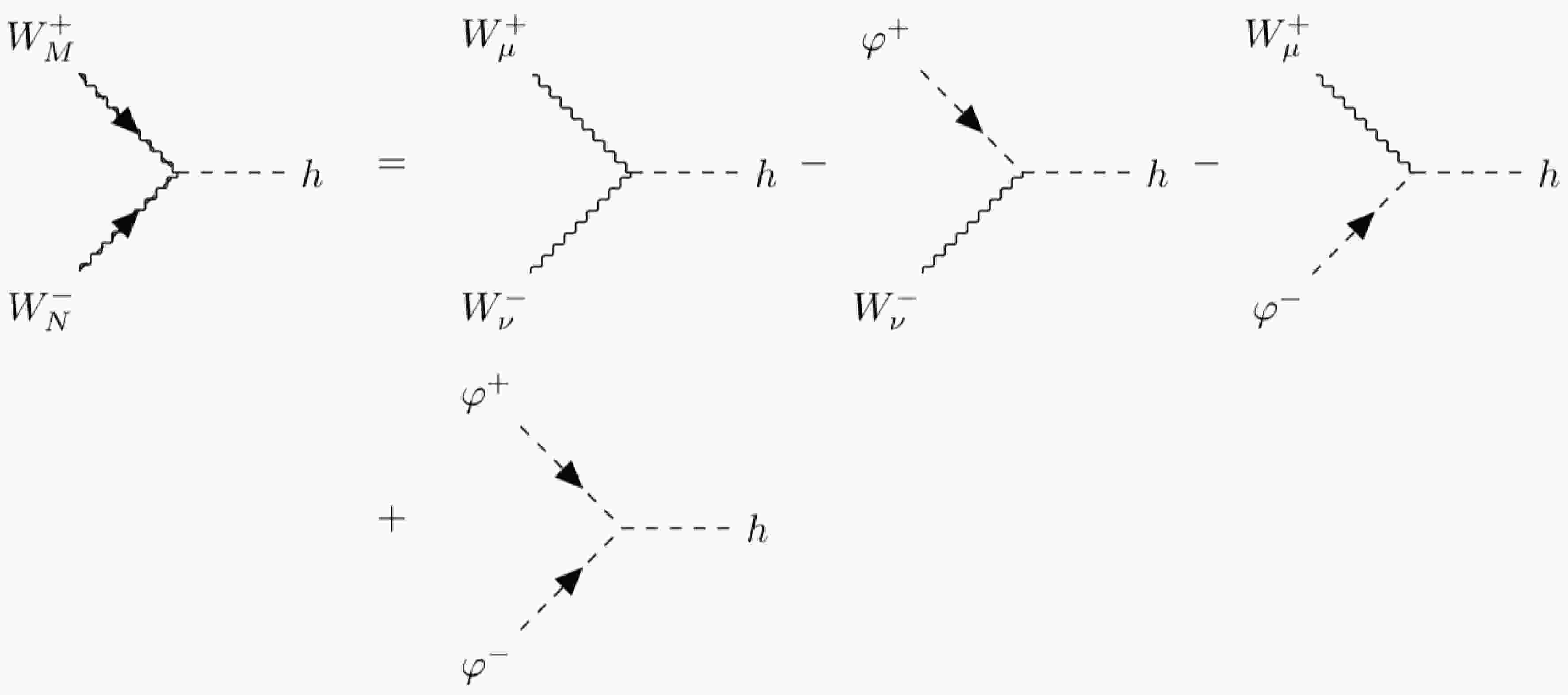 $ VVV $ vertices,$ W^+W^+Z $ and$ W^+W^-A $ , either of which has 3 types of sub-vertices:$ VVV $ ,$ V\varphi V $ , and$ \varphi\varphi V $ . There is no$ \varphi\varphi\varphi $ -type vertex.For the