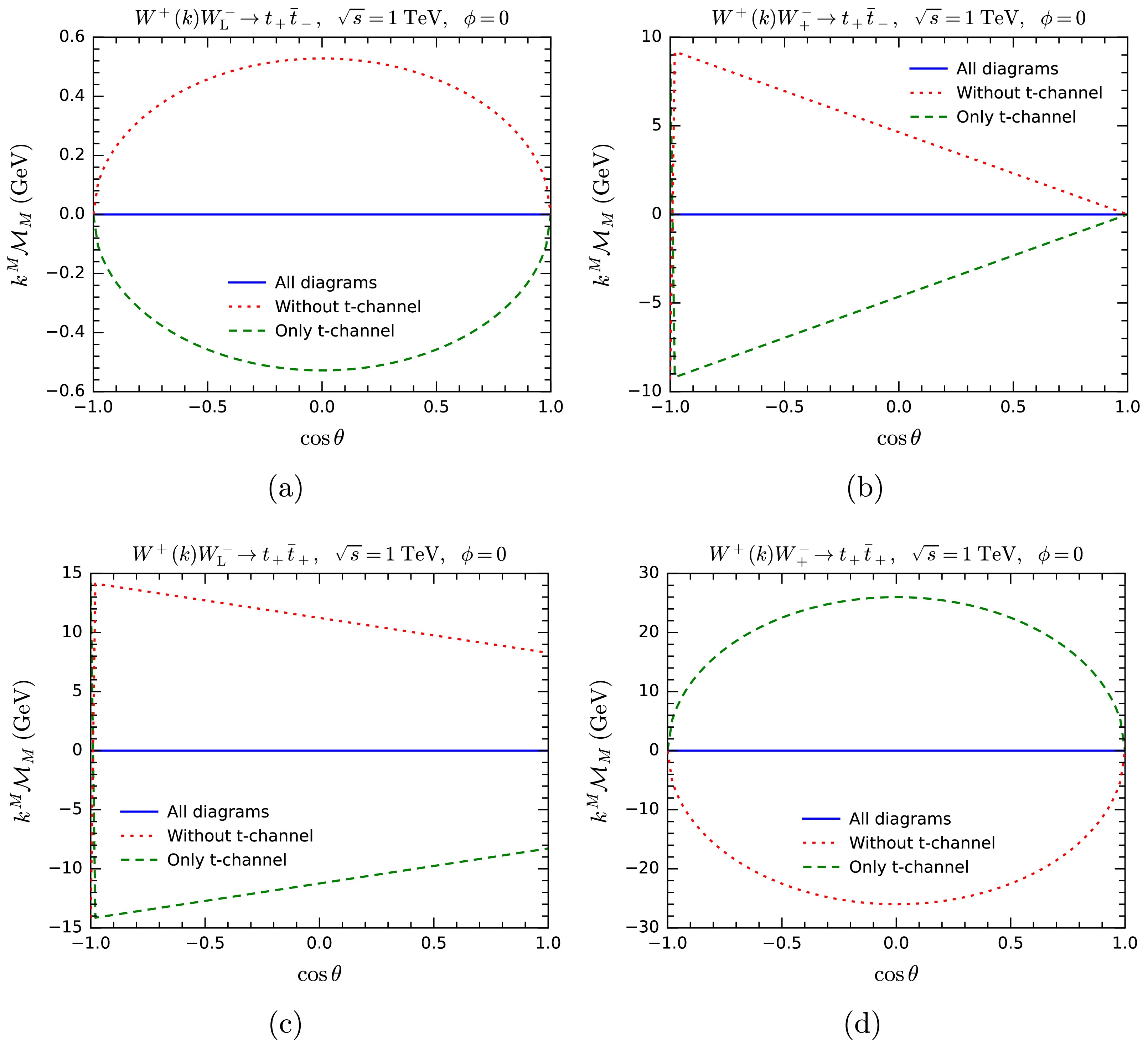 $ k^M{\cal{M}}_M $ for$ W^+ W^-\rightarrow t \bar t $ as function of$ \cos\theta $ , where θ is the scattering angle in the center-of-mass (CM) system. The CM energy and the azimuthal angle are fixed as$ \sqrt{s} = 1\; {\rm{TeV}} $ and$ \phi = 0 $ . In Figs. 3(a) and 3(b), the polarization vector of$ W^+ $ is replaced by$ k^M $ , with the helicities of$ t\bar t $ fixed as$ +- $ and the helicity of$ W^- $ set to be$ 0 $ (longitudinal polarization) and$ + $ , respectively. In Figs. 3(c) and 3(d), the setup is similar, expect the helicities of$ t\bar t $ are fixed as$ ++ $ . The blue solid lines represent the results including all tree-level diagrams, exactly demonstrating the MWI$ k^M{\cal{M}}_M = 0 $ . The red dotted and green dashed lines correspond to the results excluding the t-channel diagram and those solely involving the t-channel diagram, respectively. These contributions are precisely opposite to each other, indicating a large and exact cancellation between different diagrams as expected.Figure 3. (color online) Testing the massive Ward identity by computing