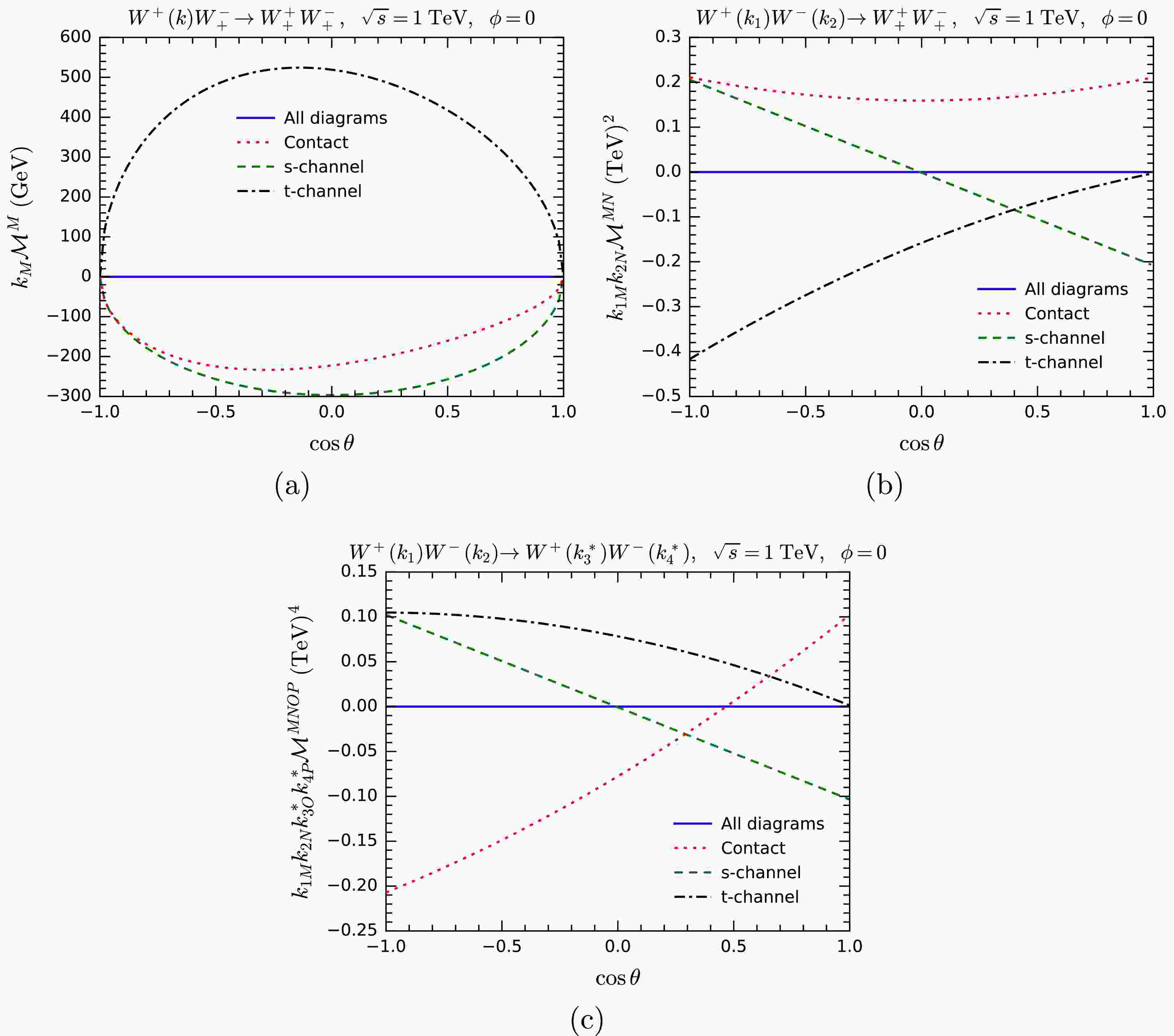$ W^+ W^- \rightarrow W^+ W^- $ with the helicity combination of$ {\rm{TTTT}} $ , where$ {\rm{T}} $ represents a transverse polarization, the amplitude includes three vertices$ WWZ $ ,$ WWA $ , and$ WWWW $ with couplings$ g_{WWZ} $ ,$ g_{WWA} $ , and$ g_{WWWW} $ . The Ward identity requires$ \begin{aligned} g_{WWWW}=g_{WWZ}^2+g_{WWA}^2. \end{aligned} $