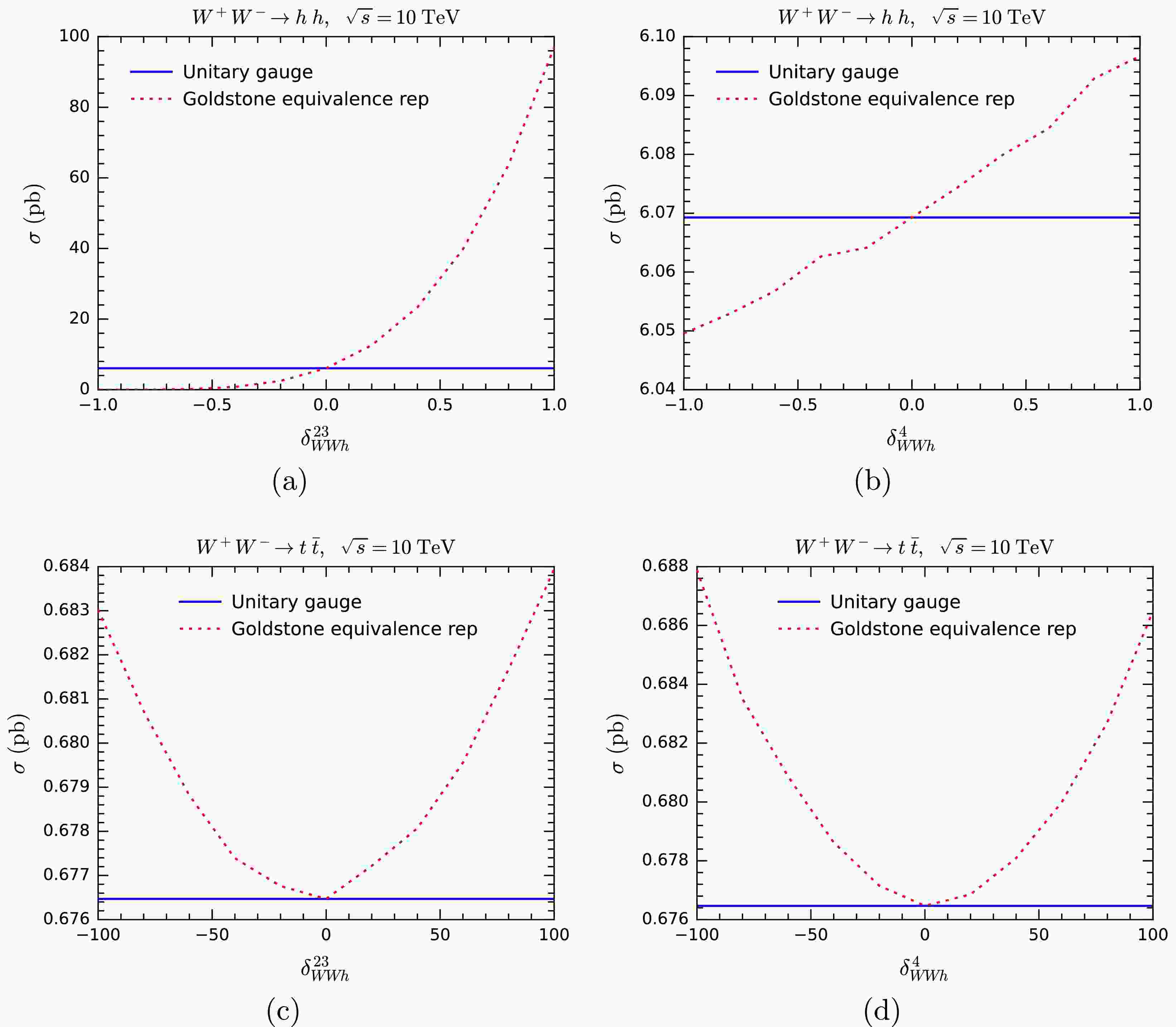 $ WWh $ vertex are$ W^+ W^-\rightarrow t\bar t $ and$ W^+ W^-\rightarrow hh $ . We first compare the cross sections vs.$ \delta_{WWh}^{23,4} $ in both the unitary gauge and the GE representation, the results are shown in Fig. 5. Just as expected, when$ \delta^{23}_{WWh} $ and$ \delta^4_{WWh} $ are nonzero, the cross sections in the GE representation deviate from those in the unitary gauge, which remain unchanged and retain the SM values. The larger$ \delta^{23}_{WWh} $ and$ \delta^4_{WWh} $ are, the larger are the deviations. Compared to$ WW\rightarrow hh $ ,$ WW\rightarrow t \bar t $ exhibits significantly lower sensitivity to$ \delta^{23}_{WWh} $ and$ \delta^4_{WWh} $ . We have to plot$ \delta^{23}_{WWh} $ and$ \delta^4_{WWh} $ over the range$ [-100,100] $ for$ WW\rightarrow t \bar t $ , but only$ [-1, 1] $ for$ WW\rightarrow hh $ . It is not surprising, given that the$ WWh $ vertex contributes to three channels of$ WW\rightarrow hh $ , but only one in$ WW\rightarrow t\bar t $ . Another notable observation is that the sensitivity of cross section is much higher to$ \delta^{23}_{WWh} $ than$ \delta^4_{WWh} $ for$ WW\rightarrow h h $ , but the sensitivities are approximately the same for$ WW\rightarrow t\bar t $ .Figure 5. (color online) Cross sections of