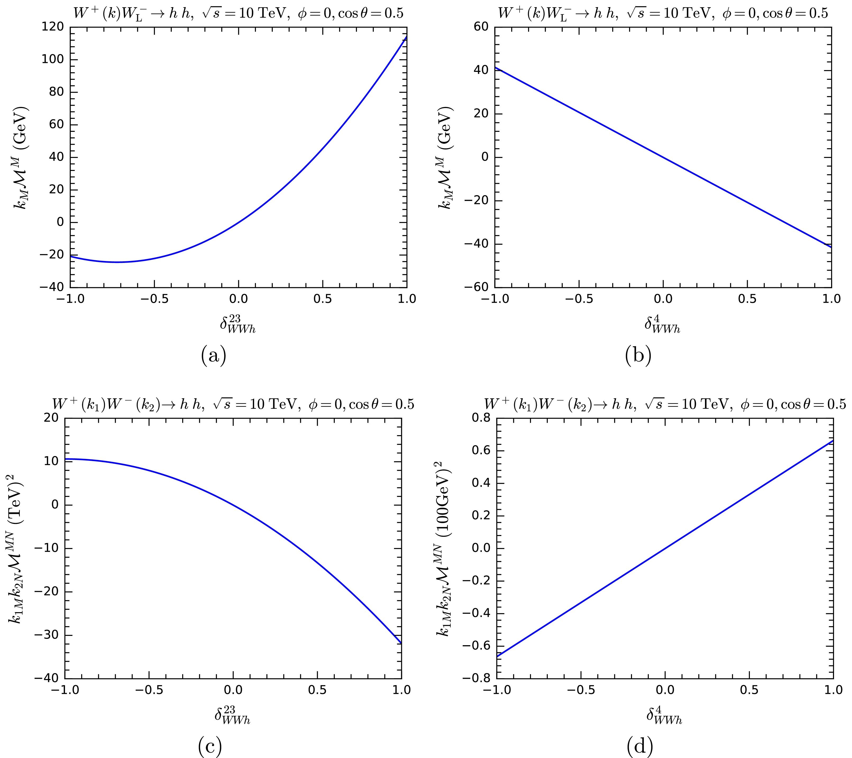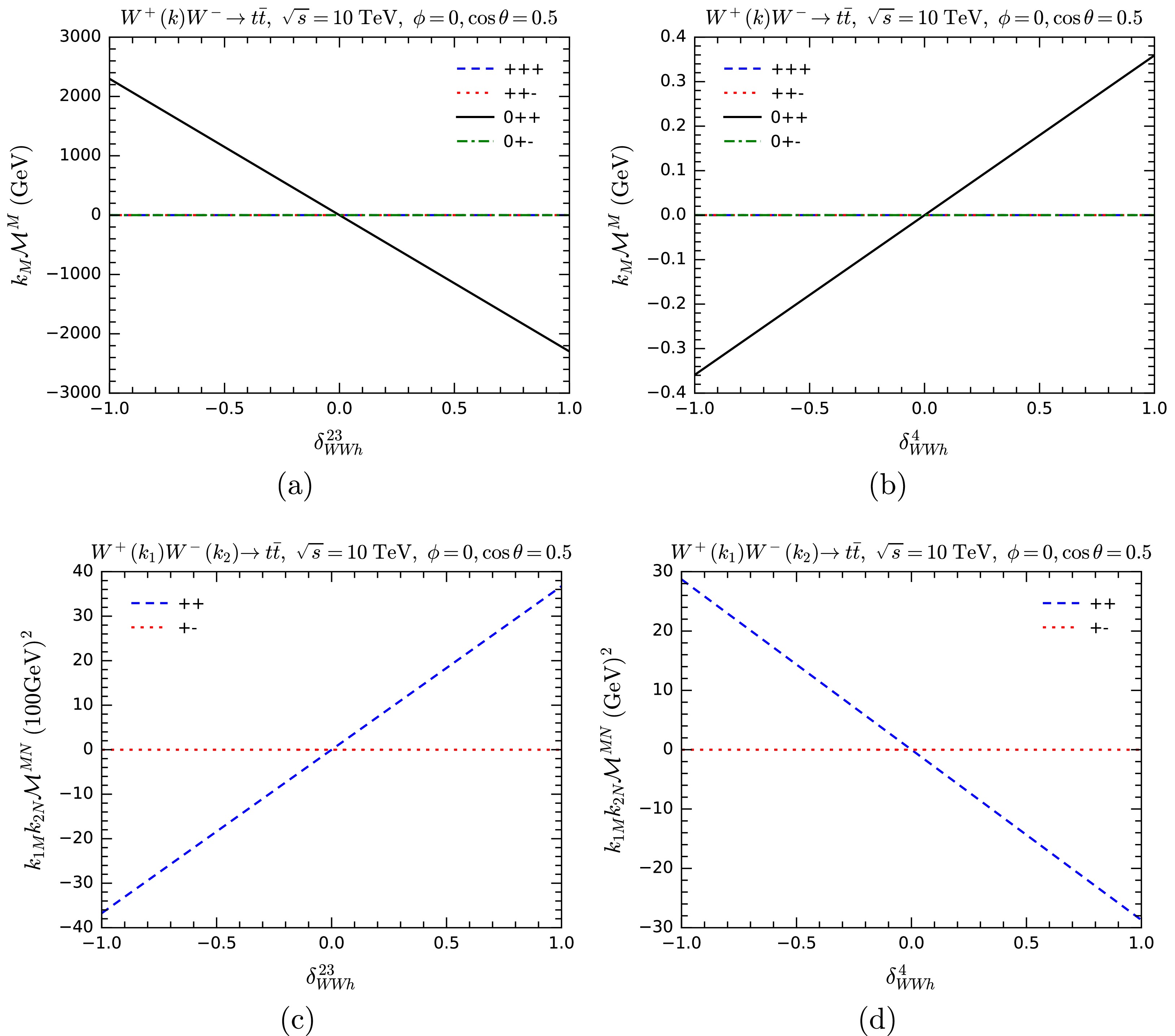 $ k_M{\cal{M}}^M $ or$ k_{1M} k_{2N} {\cal{M}}^{MN} $ for these processes as a way of testing gauge symmetry by replacing polarization vectors of one or two W bosons with 5-component momenta. The results are shown in Fig. 6 for$ WW\rightarrow hh $ and Fig. 7 for$ WW\rightarrow t\bar t $ , respectively. For$ WW\rightarrow t\bar t $ , we analyze various helicity combinations. In certain helicity configurations, the results consistently vanish due to the violation of angular momentum conservation. Apart from these cases, the anomalous couplings lead to violations of the MWI. For$ WW\rightarrow t\bar t $ , the deviations for$ \delta^{23}_{WWh} $ are larger than those for$ \delta^4_{WWh} $ .Figure 6. (color online)
