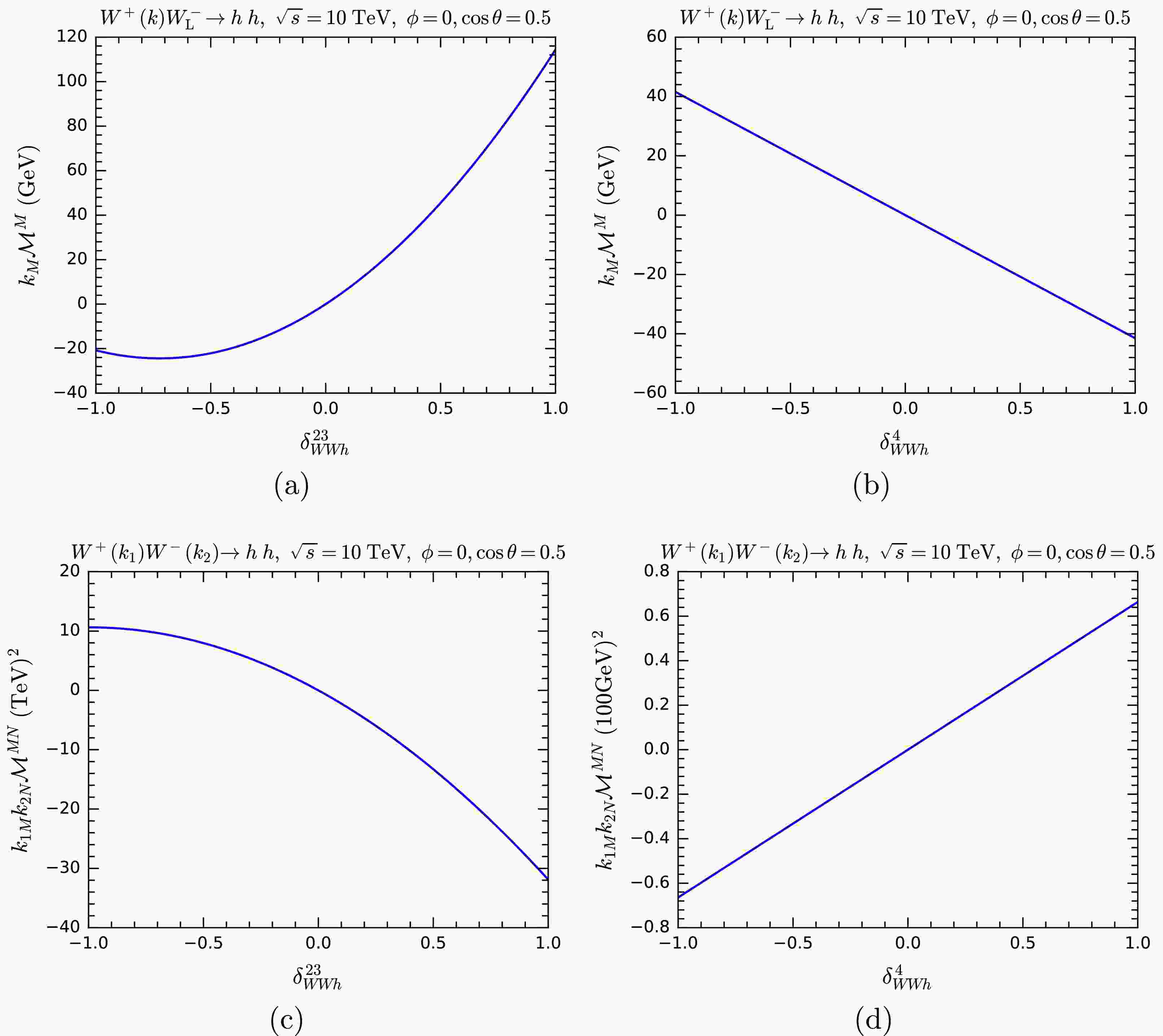 $ WW\rightarrow hh $ , we separately modify the couplings of the$ hhh $ ,$ WWh $ , and$ WWhh $ vertices, and compute$ k_M{\cal{M}}^M $ . The results are shown in Fig. 14.Figure 14. (color online)