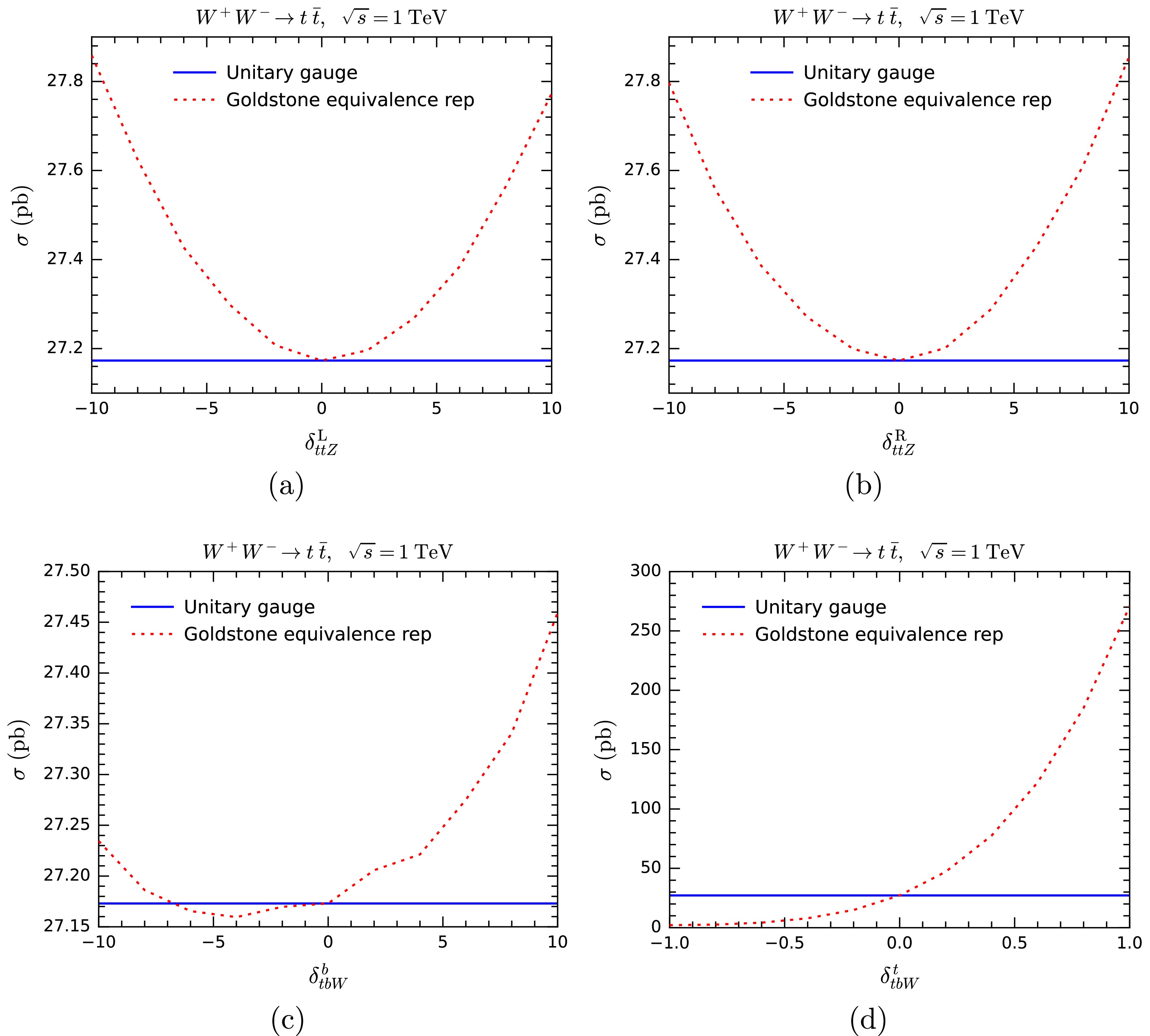 $ WW\rightarrow t\bar{t} $ in the unitary gauge and the GE representation as functions of anomalous couplings of$ ttZ $ (upper panels) and$ tbW $ (lower panels).Figure 9. (color online) Testing the MWI by computing