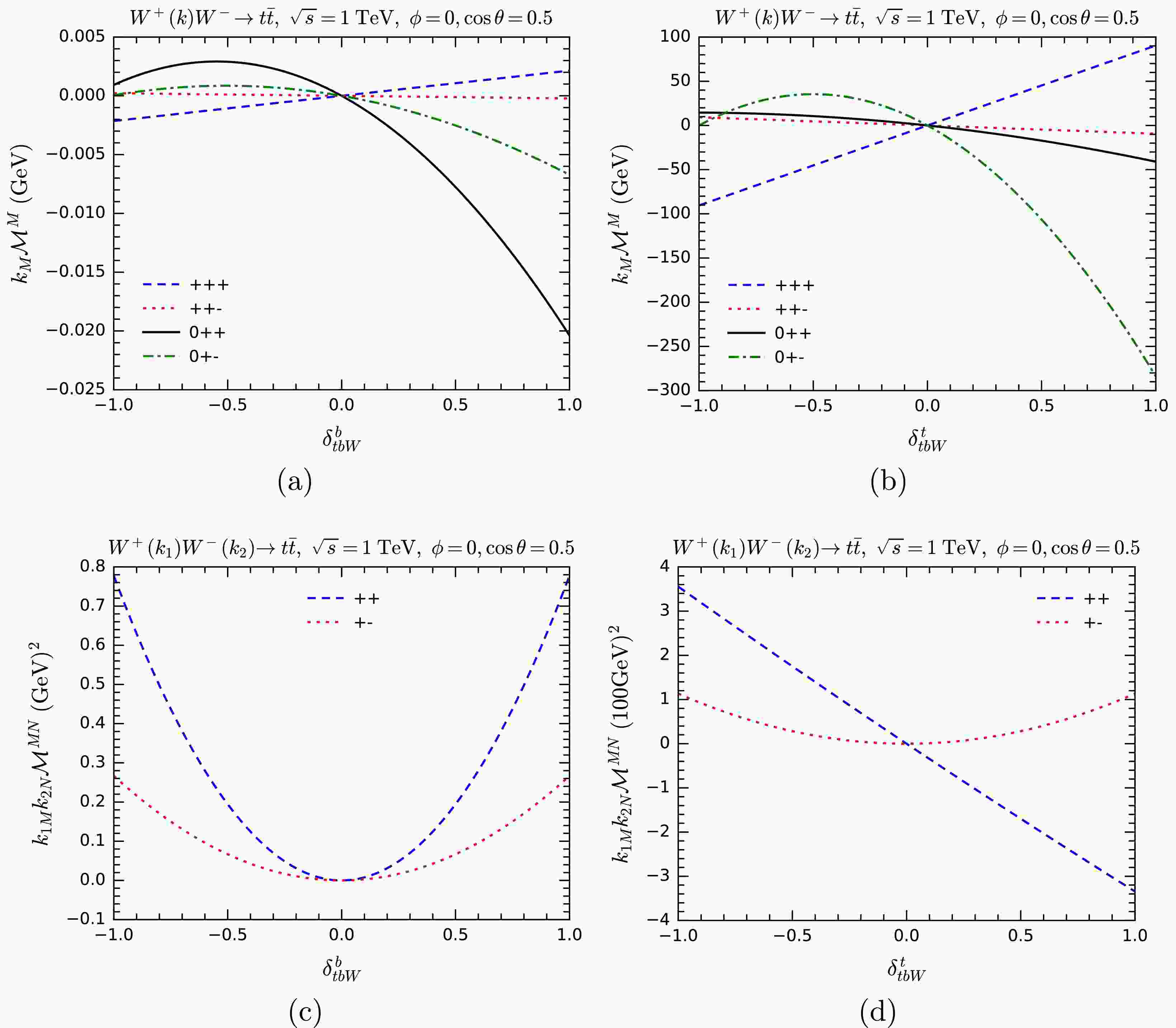 $ k_M{\cal{M}}^M $ (upper panels) and$ k_{1M} k_{2N}{\cal{M}}^{MN} $ (lower panels) with anomalous$ tbW $ couplings for the process$ WW\rightarrow t\bar t $ . Various helicity combinations are shown.Figure 10. (color online) Testing the MWI by computing