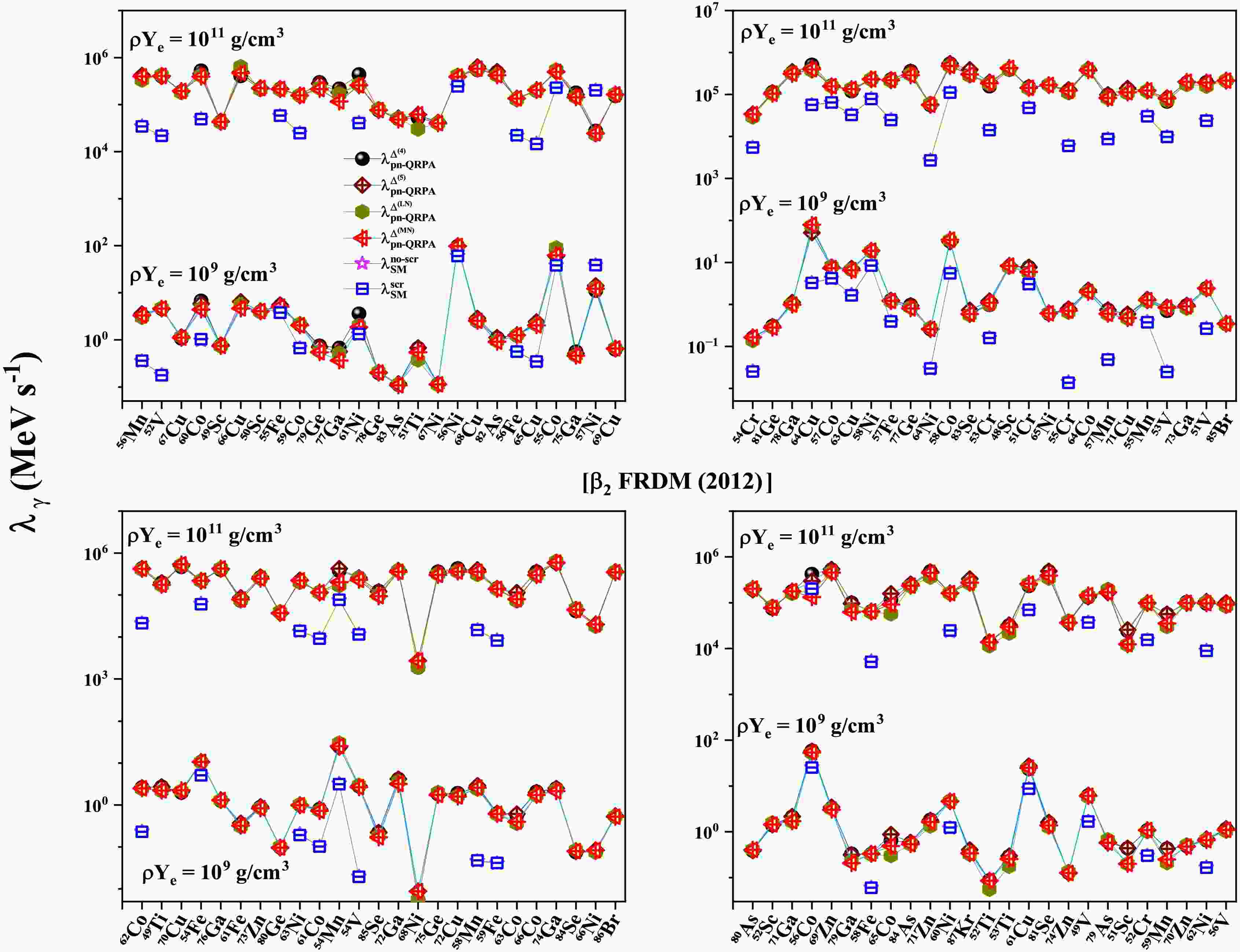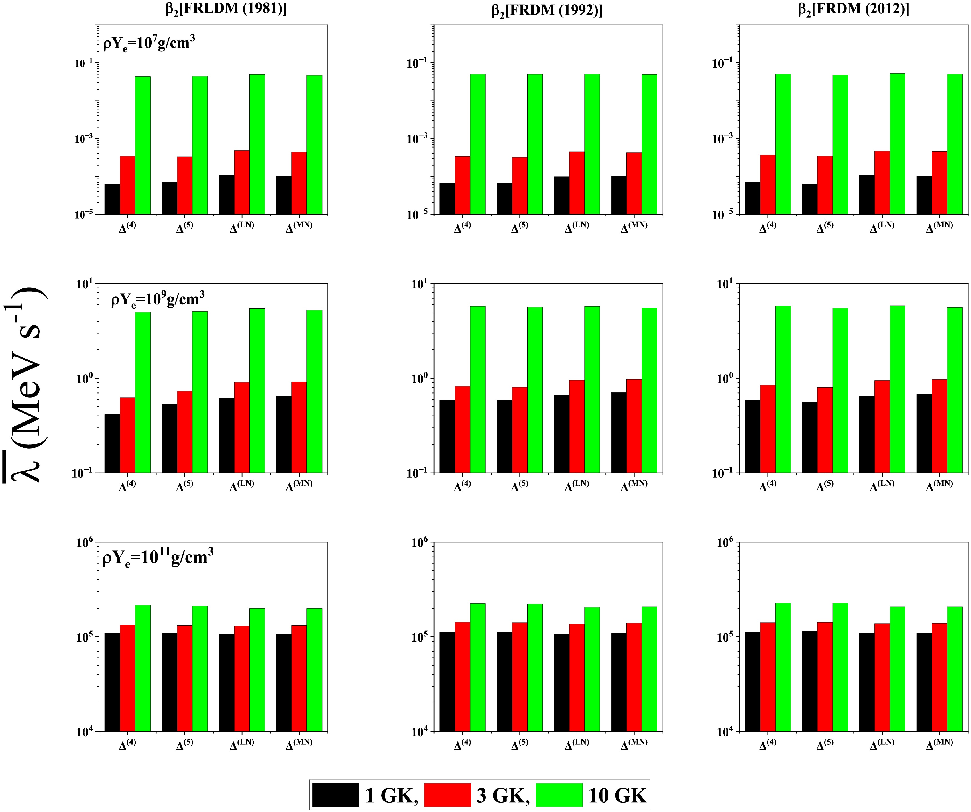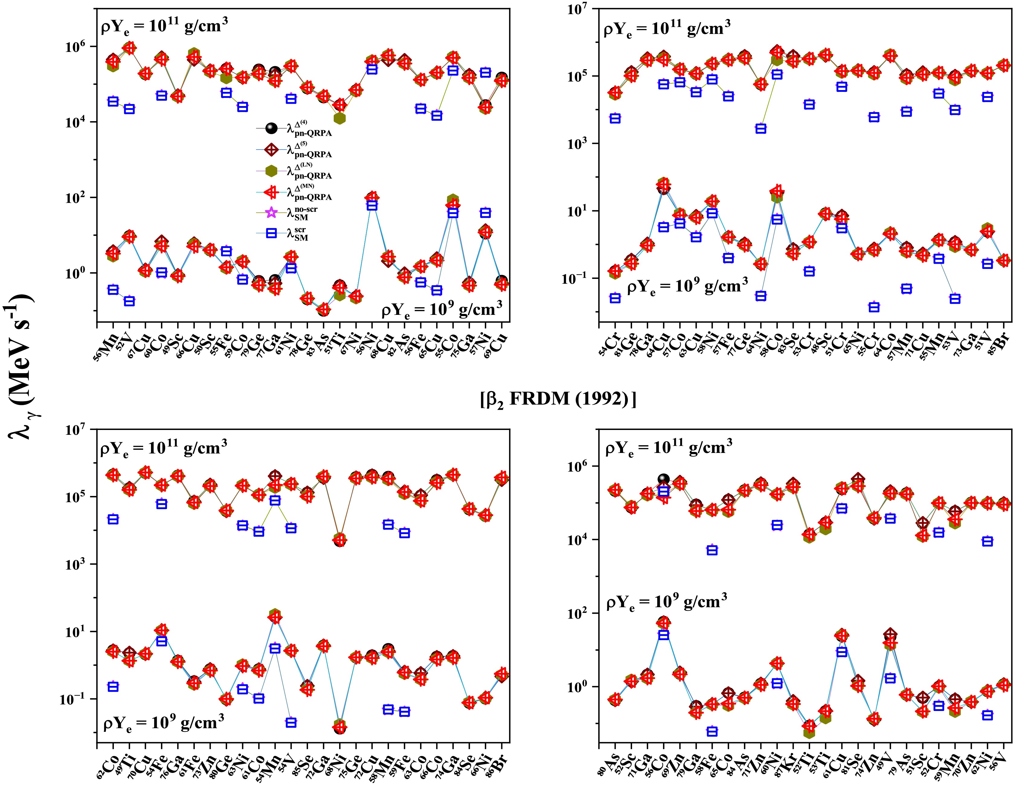 $ T (GK) $ $ \beta_{2} $ [FRLDM (1981)]$ \rho Y_{e} = 10^{9} $ $ g/cm^3 $ $ \rho Y_{e} = 10^{11} $ $ g/cm^3 $ $ \dfrac{\bar{\lambda}^{\Delta^{(4)}}_{pnQRPA}}{\bar{\lambda}^{scr}_{SM}} $ $ \dfrac{\bar{\lambda}^{\Delta^{(5)}}_{pnQRPA}}{\bar{\lambda}^{scr}_{SM}} $ $ \dfrac{\bar{\lambda}^{\Delta^{(LN)}}_{pnQRPA}}{\bar{\lambda}^{scr}_{SM}} $ $ \dfrac{\bar{\lambda}^{\Delta^{(MN)}}_{pnQRPA}}{\bar{\lambda}^{scr}_{SM}} $ $ \dfrac{\bar{\lambda}^{\Delta^{(4)}}_{pnQRPA}}{\bar{\lambda}^{scr}_{SM}} $ $ \dfrac{\bar{\lambda}^{\Delta^{(5)}}_{pnQRPA}}{\bar{\lambda}^{scr}_{SM}} $ $ \dfrac{\bar{\lambda}^{\Delta^{(LN)}}_{pnQRPA}}{\bar{\lambda}^{scr}_{SM}} $ $ \dfrac{\bar{\lambda}^{\Delta^{(MN)}}_{pnQRPA}}{\bar{\lambda}^{scr}_{SM}} $ 1 20.8 20.2 22.1 25.1 4.51 4.44 4.27 4.37 3 6.94 7.17 7.90 7.83 4.69 4.67 4.52 4.65 10 11.6 11.4 11.9 11.3 8.76 8.71 8.41 8.42 $ \beta_{2} $ [FRDM (1992)]1 23.2 22.4 24.1 25.0 4.68 4.69 4.45 4.56 3 6.88 6.92 7.53 7.39 5.37 5.36 5.11 5.24 10 13.8 13.7 12.7 12.9 10.1 10.1 9.33 9.61 $ \beta_{2} $ [FRDM (2012)]1 21.1 20.6 22.5 24.0 4.52 4.47 4.30 4.36 3 7.69 7.73 8.41 8.07 4.88 4.86 4.70 4.78 10 12.4 12.7 12.3 12.1 9.13 9.27 8.64 8.83 Table 2. Comparison of the reported pn-QRPA calculated mean γ -heating rates with shell model rates including screening effects [63].