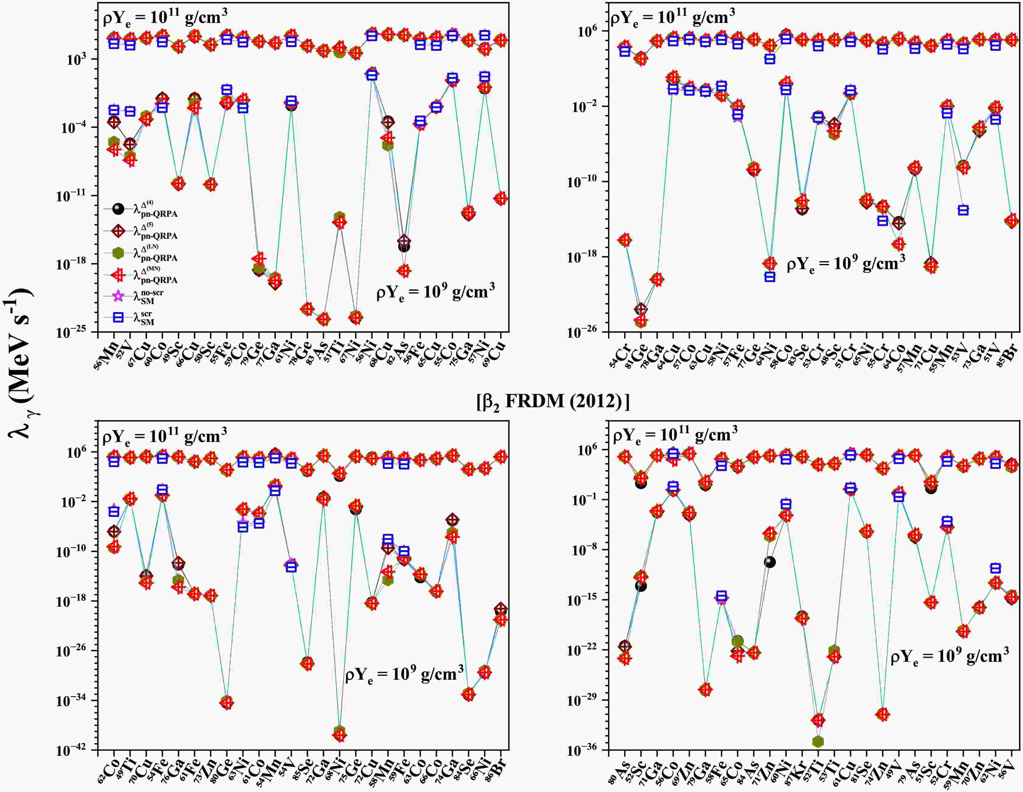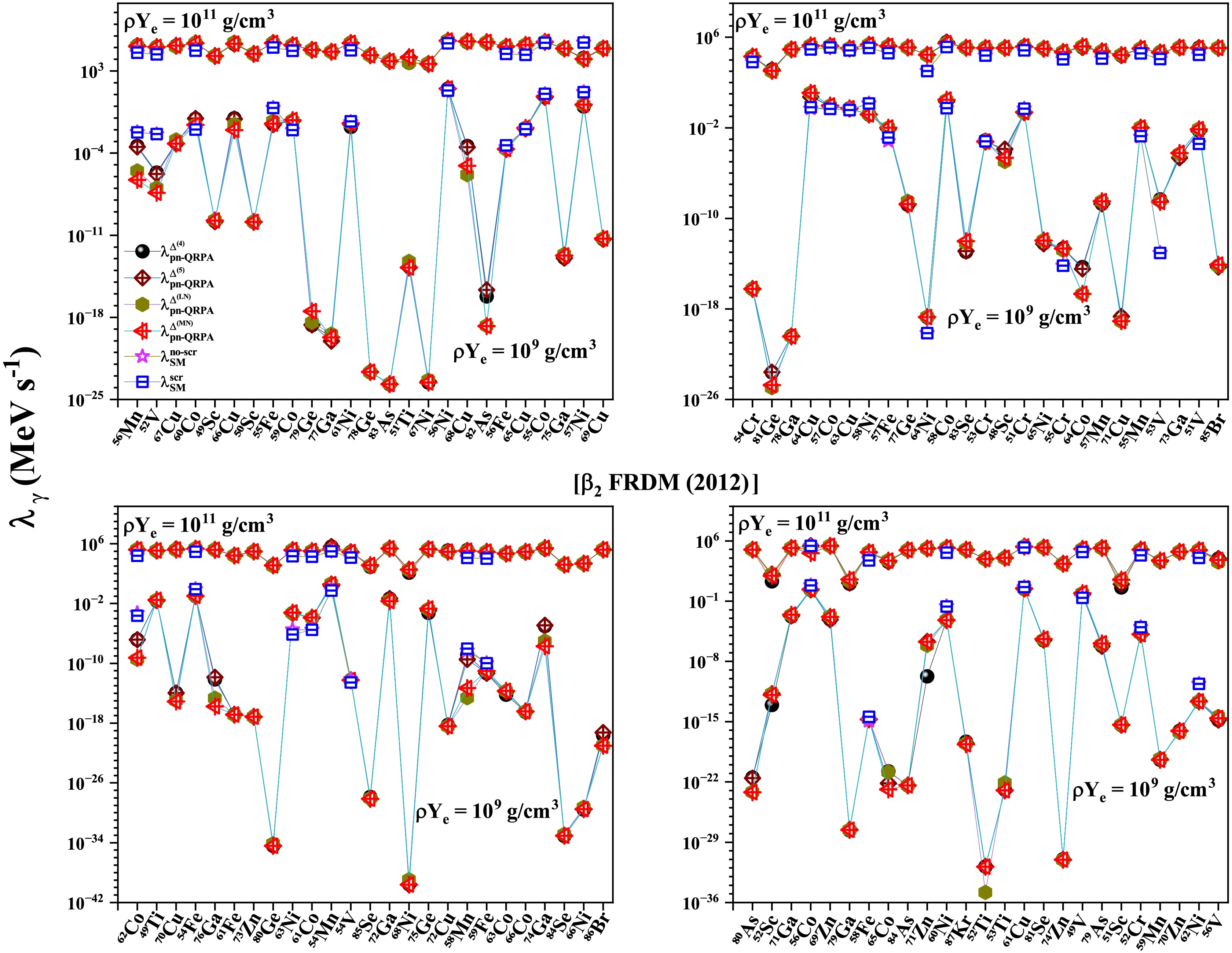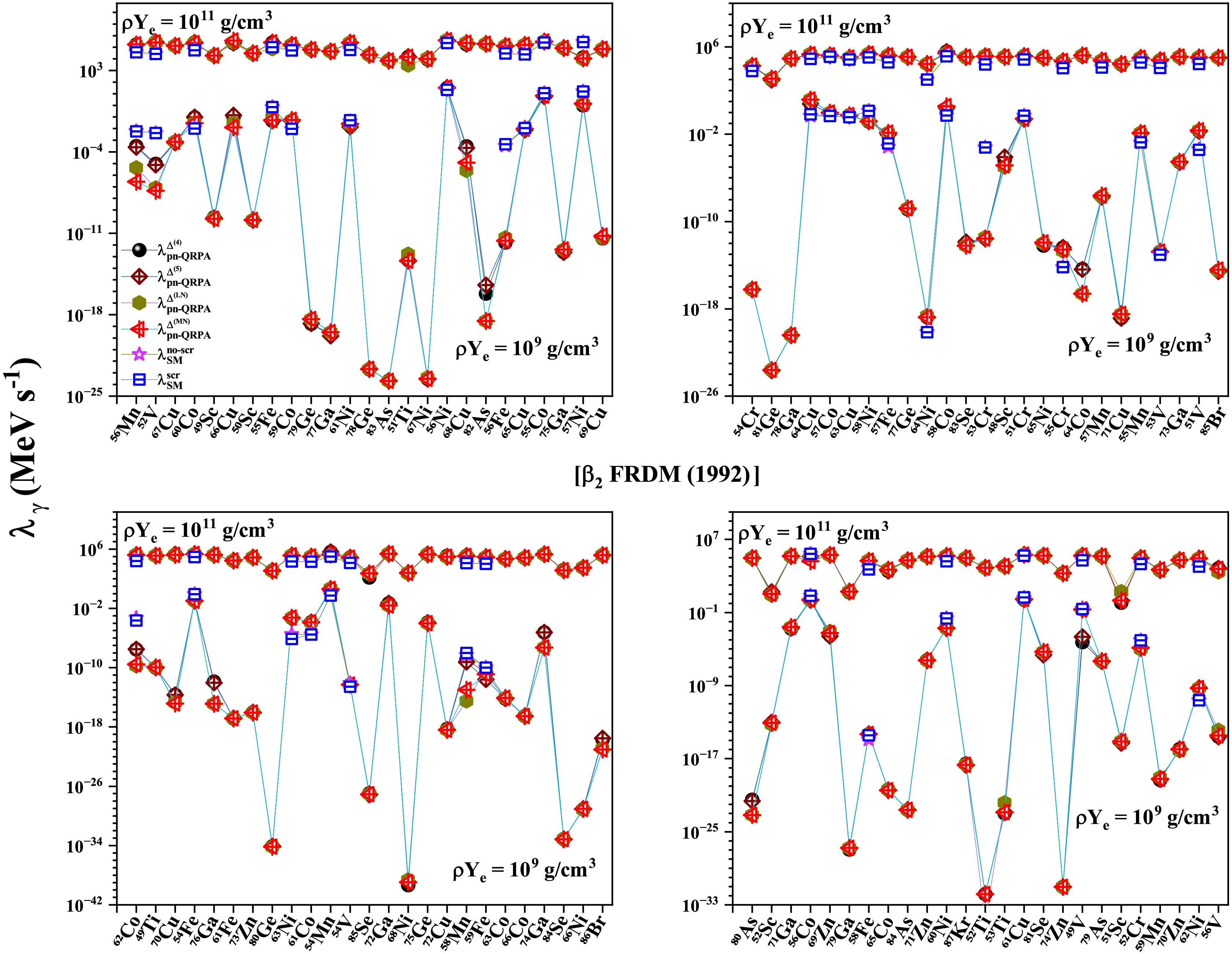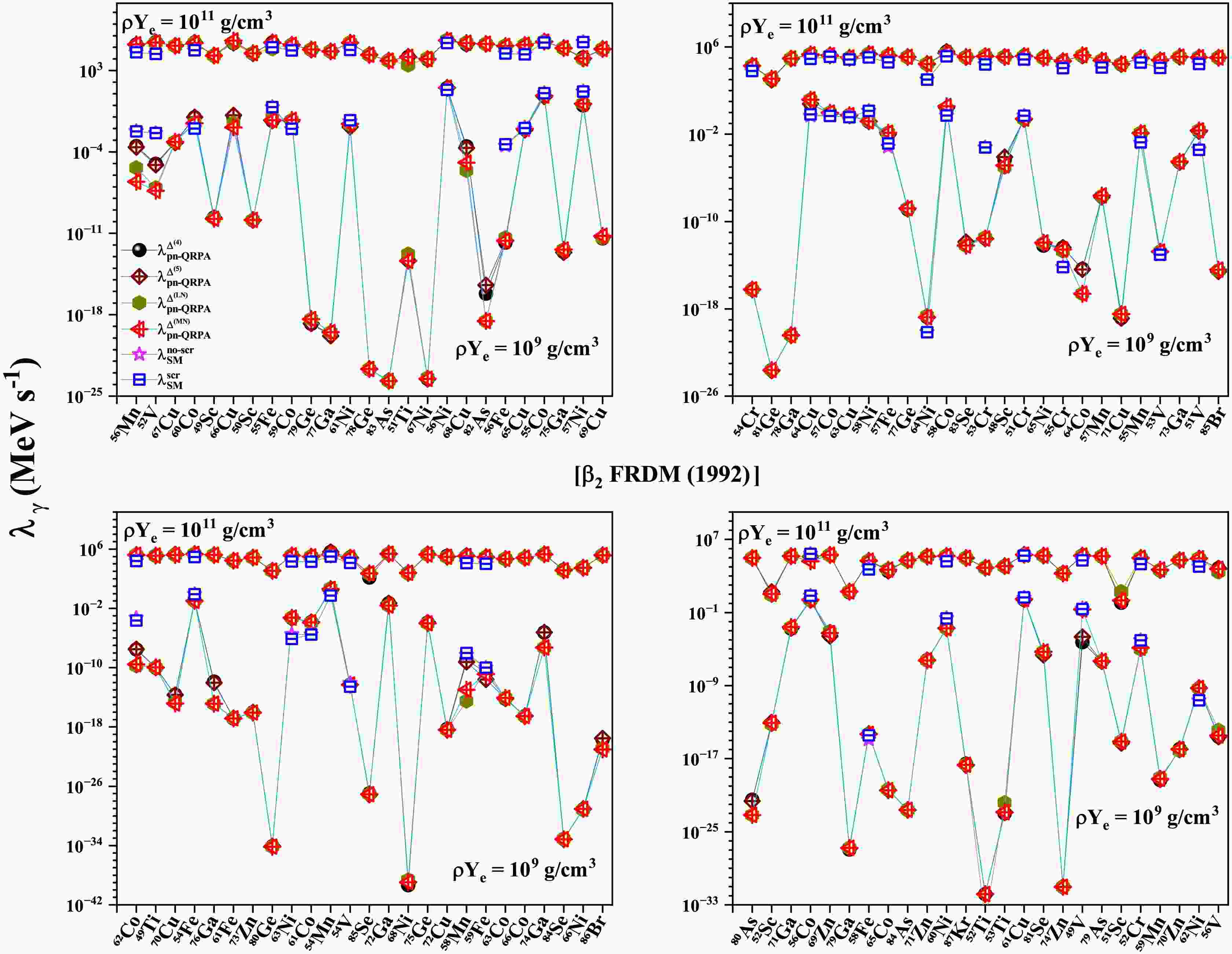 $ T (GK) $ $ \beta_{2} $ [FRLDM (1981)]$ \rho Y_{e} = 10^{9} $ $ g/cm^3 $ $ \rho Y_{e} = 10^{11} $ $ g/cm^3 $ $ \dfrac{\bar{\lambda}^{\Delta^{(4)}}_{pnQRPA}}{\bar{\lambda}^{scr}_{SM}} $ $ \dfrac{\bar{\lambda}^{\Delta^{(5)}}_{pnQRPA}}{\bar{\lambda}^{scr}_{SM}} $ $ \dfrac{\bar{\lambda}^{\Delta^{(LN)}}_{pnQRPA}}{\bar{\lambda}^{scr}_{SM}} $ $ \dfrac{\bar{\lambda}^{\Delta^{(MN)}}_{pnQRPA}}{\bar{\lambda}^{scr}_{SM}} $ $ \dfrac{\bar{\lambda}^{\Delta^{(4)}}_{pnQRPA}}{\bar{\lambda}^{scr}_{SM}} $ $ \dfrac{\bar{\lambda}^{\Delta^{(5)}}_{pnQRPA}}{\bar{\lambda}^{scr}_{SM}} $ $ \dfrac{\bar{\lambda}^{\Delta^{(LN)}}_{pnQRPA}}{\bar{\lambda}^{scr}_{SM}} $ $ \dfrac{\bar{\lambda}^{\Delta^{(MN)}}_{pnQRPA}}{\bar{\lambda}^{scr}_{SM}} $ 1 20.8 20.2 22.1 25.1 4.51 4.44 4.27 4.37 3 6.94 7.17 7.90 7.83 4.69 4.67 4.52 4.65 10 11.6 11.4 11.9 11.3 8.76 8.71 8.41 8.42 $ \beta_{2} $ [FRDM (1992)]1 23.2 22.4 24.1 25.0 4.68 4.69 4.45 4.56 3 6.88 6.92 7.53 7.39 5.37 5.36 5.11 5.24 10 13.8 13.7 12.7 12.9 10.1 10.1 9.33 9.61 $ \beta_{2} $ [FRDM (2012)]1 21.1 20.6 22.5 24.0 4.52 4.47 4.30 4.36 3 7.69 7.73 8.41 8.07 4.88 4.86 4.70 4.78 10 12.4 12.7 12.3 12.1 9.13 9.27 8.64 8.83 Table 2. Comparison of the reported pn-QRPA calculated mean γ -heating rates with shell model rates including screening effects [63].