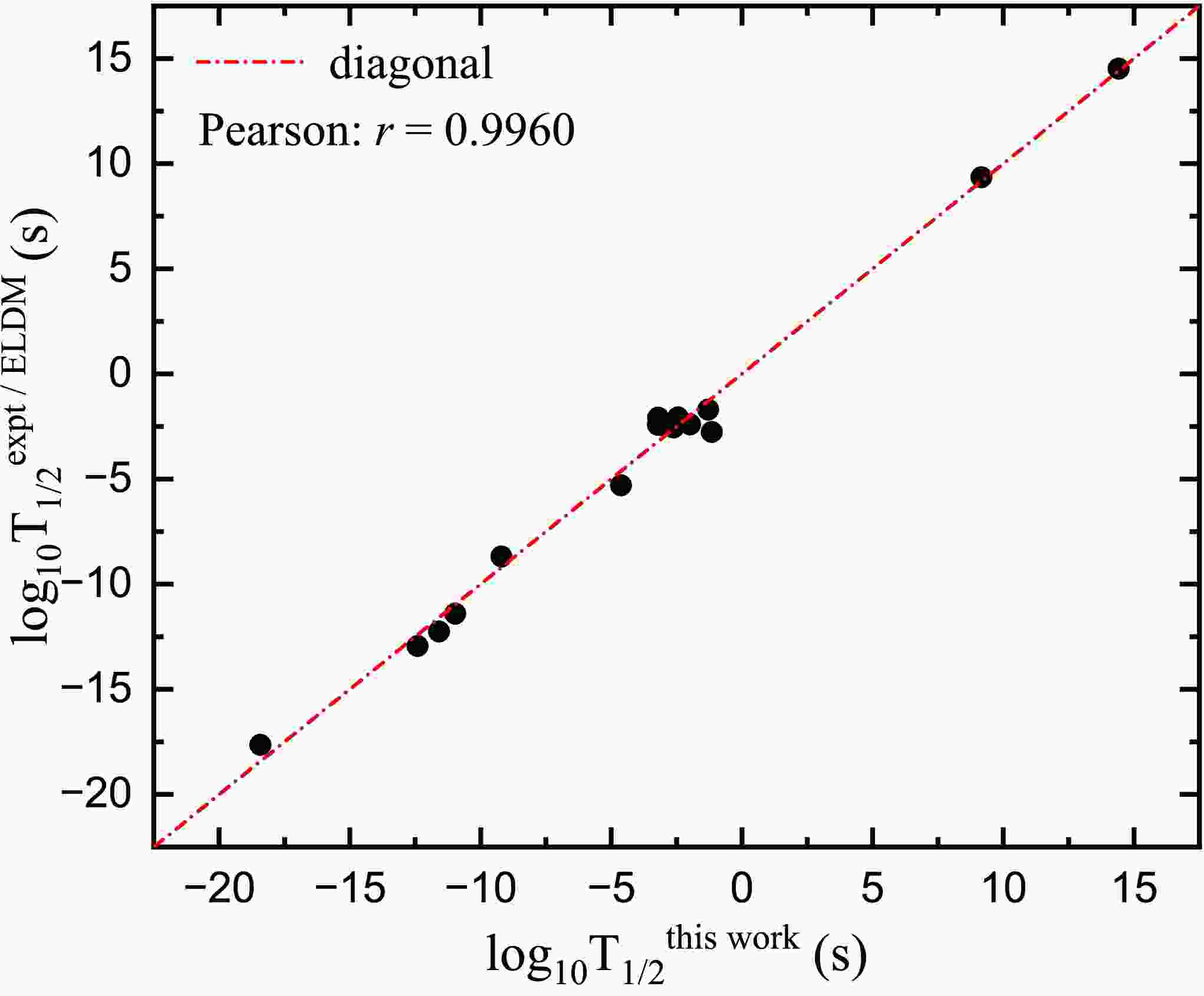 $\log_{10}T_{1/2}^{\text{calc}}$ plotted against$\log_{10}T_{1/2}^{\text{expt/ELDM}}$ for all 17 data points in Fig. 3. The data points generally distribute closely around the diagonal line, and a Pearson correlation coefficient of$r = 0.9960$ is obtained, confirming an excellent linear correlation between the calculated values and the adopted benchmark data set. This strong correlation, together with the relatively small rms deviation$\sigma_{2p}$ , indicates that the present improved GN law provides a reliable and unified description of both true and short-lived light two-proton emitters. In the future, more realistic two-proton emissions with different angular momenta can be used to further promote the accuracy of present improved GN law.