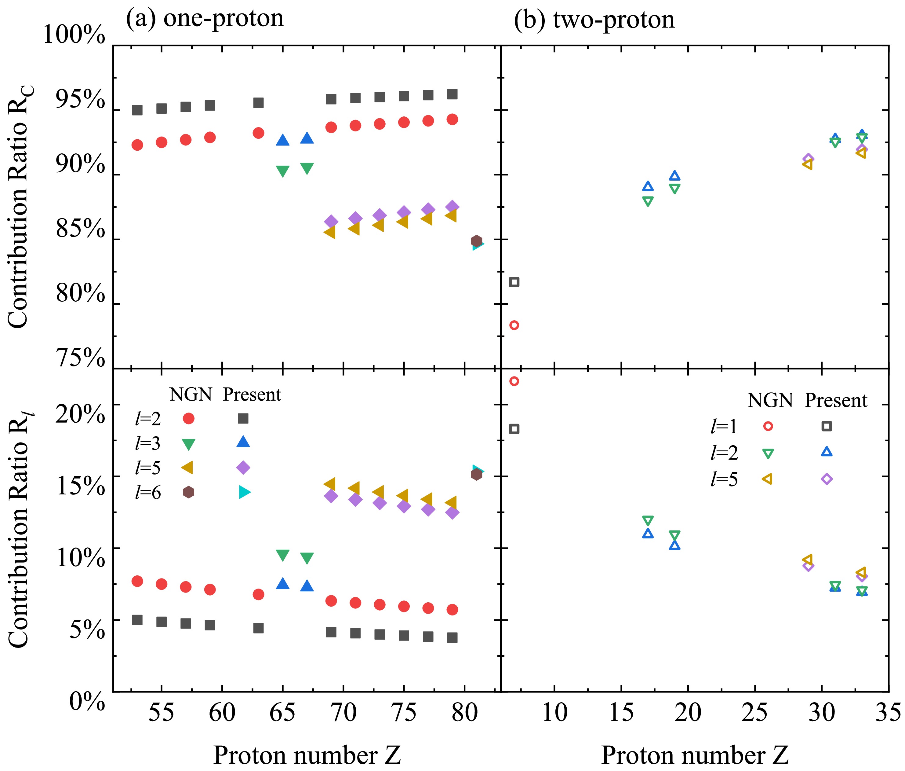$R_C$ and$R_l$ represent the fractional weights of the Coulomb and centrifugal components in the composite quantity$Z_d^{\alpha}+bl^{\beta}$ , and therefore provide a direct measure of the importance of the long-range Coulomb potential and the relatively shorter-range centrifugal potential, respectively.In Fig. 4 the extracted contribution ratios for all one-proton and two-proton emitters are displayed. Several systematic trends can be observed. From the left two panels for one-proton emission cases, we can see that for low angular momentum one-proton emitters such as with