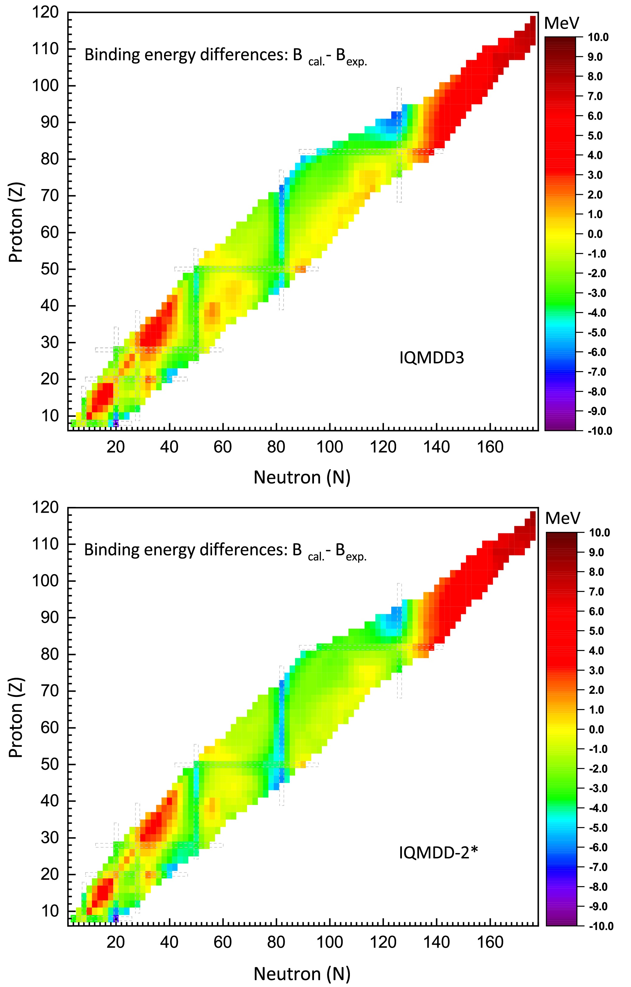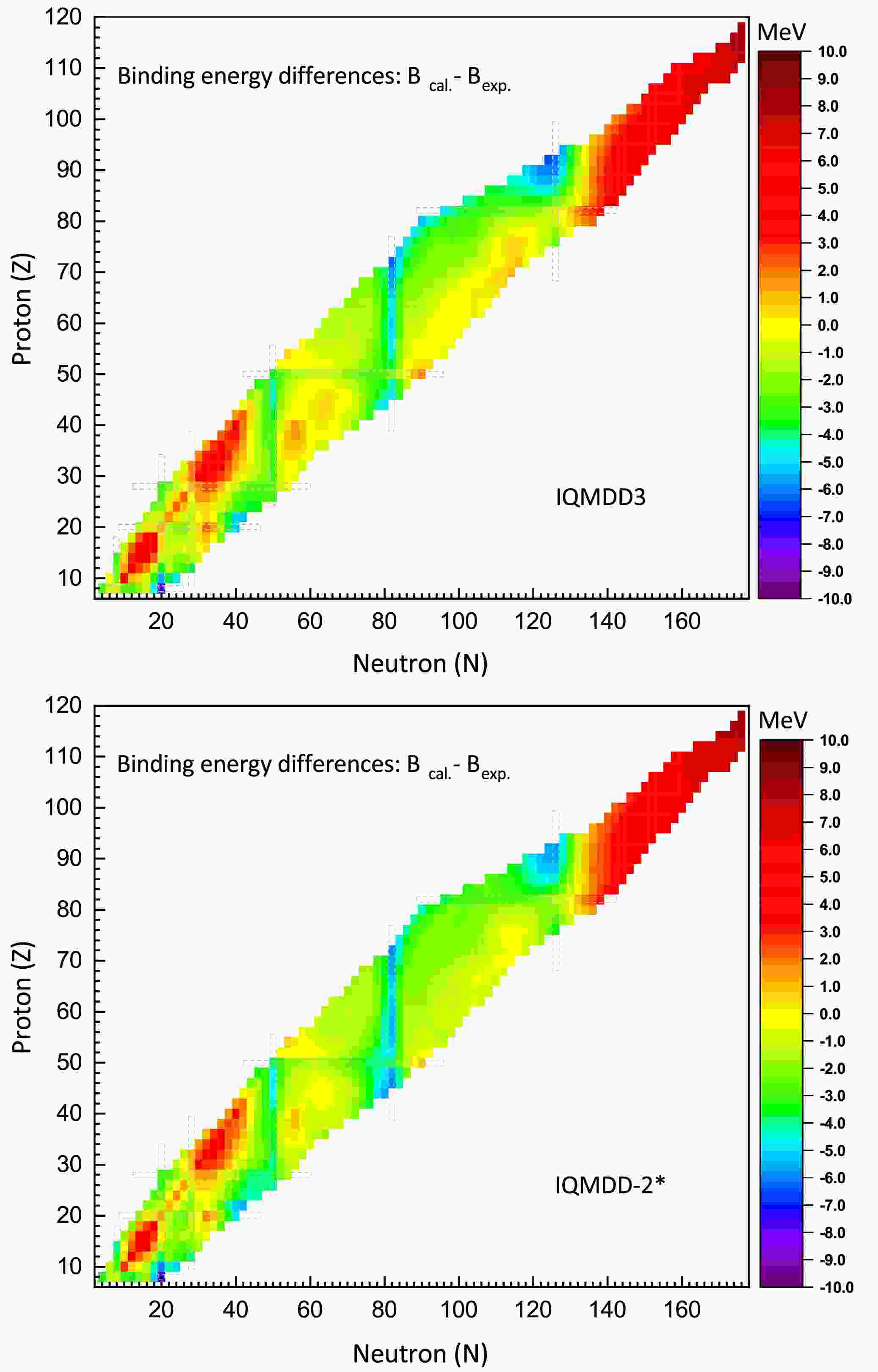 $ \sigma_{B/A}=0.034 $ MeV for IQMDD3 and$ \sigma_{B/A}=0.036 $ MeV for IQMDD-2*. For total binding energy, the corresponding values are$ \sigma_{B}=2.893 $ MeV for IQMDD3 and$ \sigma_{B}=2.984 $ MeV for IQMDD-2*. Additionally, statistical analysis shows that both models perform better in the medium and heavy nucleus regions compared to the light nucleus region in terms of the average binding energy per nucleon. When the analysis is confined to the range from Calcium (Z=20) to Oganesson (Z=118), the rms deviation decreases significantly to$ \sigma_{B/A} =0.020 $ MeV for IQMDD3 and$ \sigma_{B/A} =0.022 $ MeV for IQMDD-2*.Figure 1. (color online) Differences in total binding energy between the calculations and experimental data for even-even nuclei using the IQMDD3 and IQMDD-2*. To guide the eye, the dashed frames correspond to the positions of the magic numbers 8, 20, 28, 50, 82, and 126.