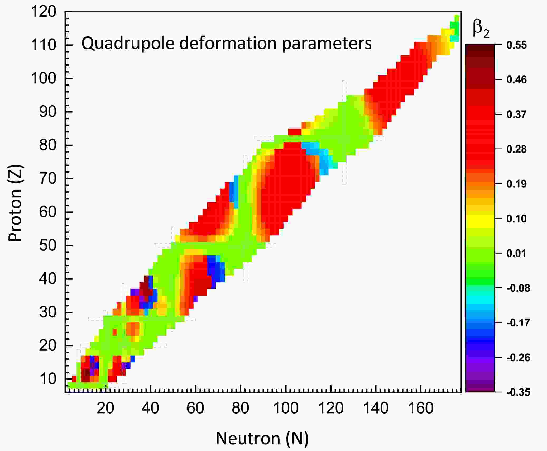 $ \beta_2 $ for all the isotopic chains examined in this work. The deformation parameter$ \beta_2 $ is derived from the calculated nucleon quadrupole moments Q via [7]:Figure 2. (color online) Quadrupole deformation parameters for even-even nuclei with proton numbers
