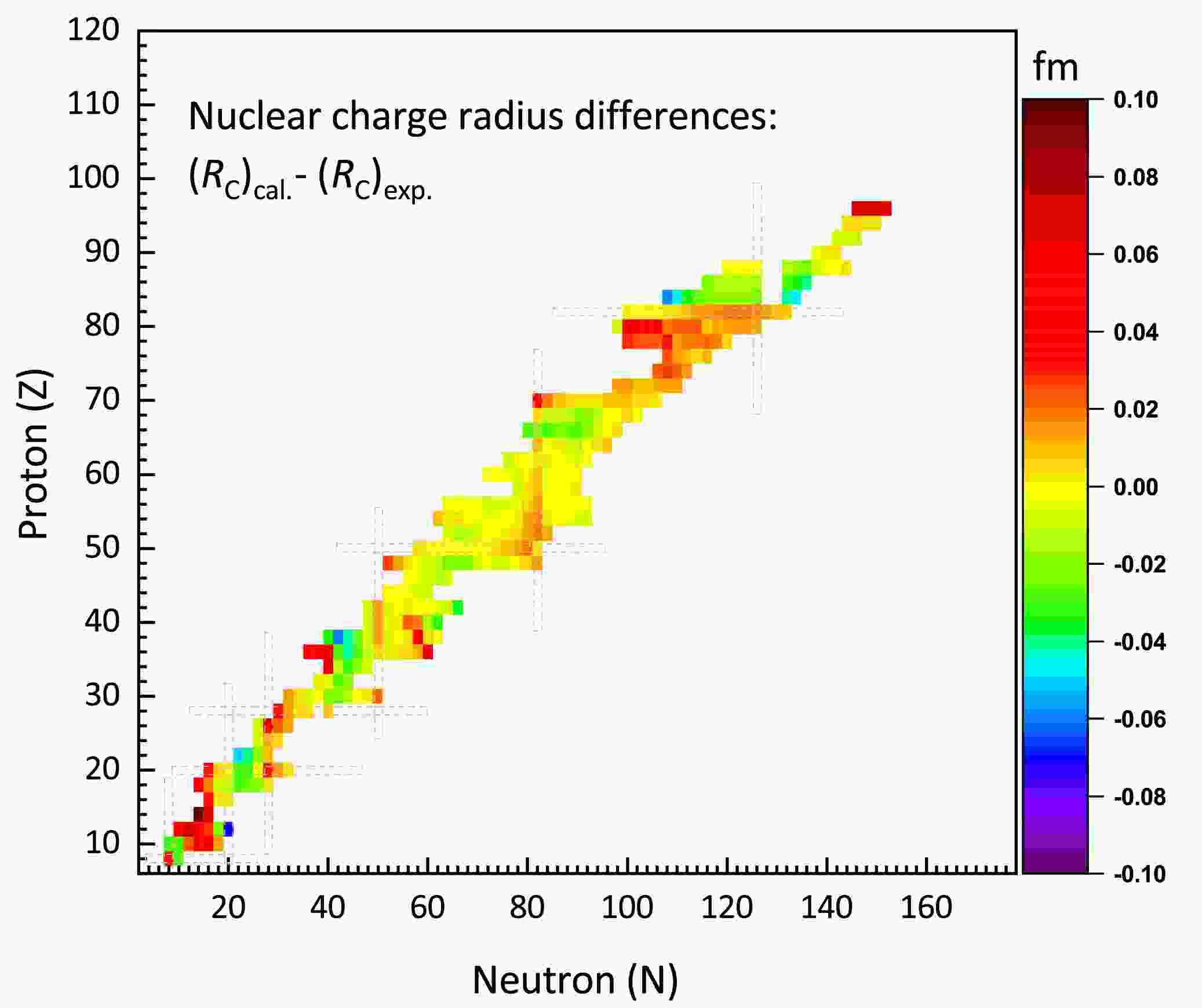 $ \pm0.04 $ fm range. For the 368 even-even nuclei with known charge radii, the rms deviation between the theoretical and experimental values is$ \sigma = 0.022 $ fm, compared to$ \sigma = 0.021 $ fm for IQMDD-2*.Figure 3. (color online) Discrepancies between IQMDD3+RHB calculations and experimental data for even-even nuclei with measured charge radii.